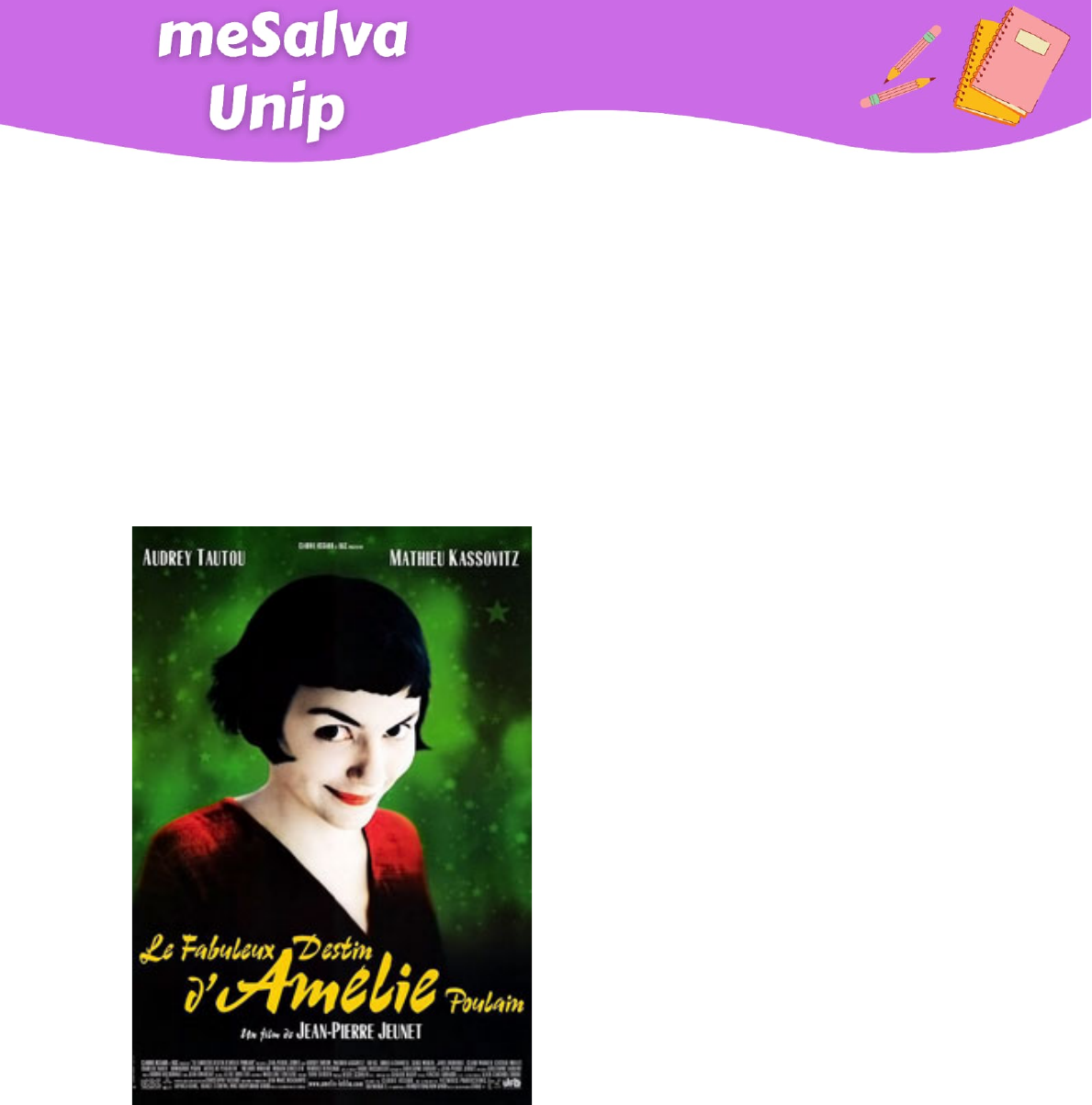 Filme: O fabuloso destino de Amelie Poulain Após deixar a vida de subúrbio que levava com a famí- lia, a inocente Amélie (Audrey Tautou) muda-se para o bairro parisiense de Montmartre, onde começa a trabalhar como garçonete. Certo dia encontra uma caixa escondida no banheiro de sua casa e, pensando que pertencesse ao antigo morador, decide procurá-lo e é assim que encontra Dominique (Maurice Bénichou). Ao FILME- O FABULOSO DESTINO DE AMELIE POULAIN UNIP 2023 ver que ele chora de alegria ao reaver o seu objeto, a moça fica impressionada e adquire uma nova visão do mundo. Então, a partir de pequenos gestos, ela passa a ajudar as pessoas que a rodeiam, vendo nisto um novo sentido para sua existência. Contudo, ainda sente falta de um grande amor. O filme conta a história de uma mulher em busca de si mesma, que aprende a se conhecer pela ajuda que dá aos outros, o que lhe abre caminho para encontrar sentido para sua existência.