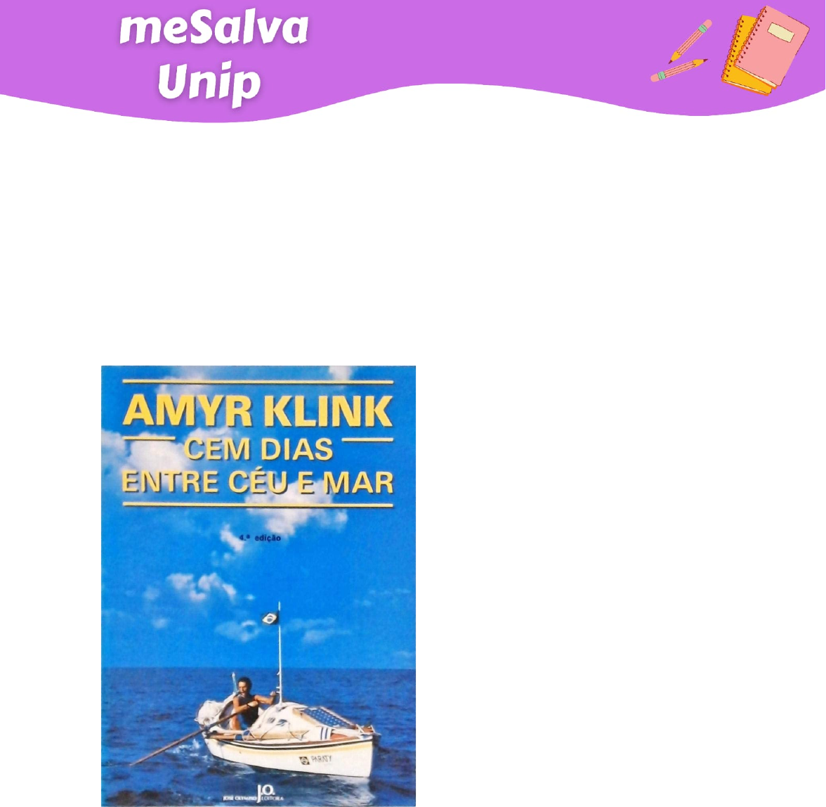 Cem dias entre Céu e Mar Navegando ao lado dos peixes, entretendo conversas com gai- votas e tubarões, remando no meio de uma creche de baleias, Cem dias entre céu e mar é o relato de uma travessia considerada incomum - mais de 3500 milhas (cerca de 6500 quilômetros) desde o porto de Lüderitz, no sul da África, até a praia da espera no litoral baiano, a bordo de um pequeno barco a remo. Neste livro Amyr Klink quer transportar o leitor para a superfície ora cinzenta, ora azulada do Atlântico Sul, tornando-o cúmplice de suas alegrias e seus temores, ao mesmo RESUMO- CEM DIAS ENTRE CÉU E MAR UNIP 2023 tempo em que se pro- põe a narrar, passo a passo, os preparativos, as lutas, os obstá culos e os presságios que cercaram a viagem. Quem já leu ou assistiu a uma palestra de Amyr Klink sabe o quanto o planejamento pela definição das prioridades é fundamental ao sucesso de suas empreitadas. O uso adequado do tempo, a previsão das dificuldades e de tudo que pode ser pensado para enfrentá-las podem auxiliar os estudantes a refletir sobre a distribuição de seu tempo em função do alcance das metas.