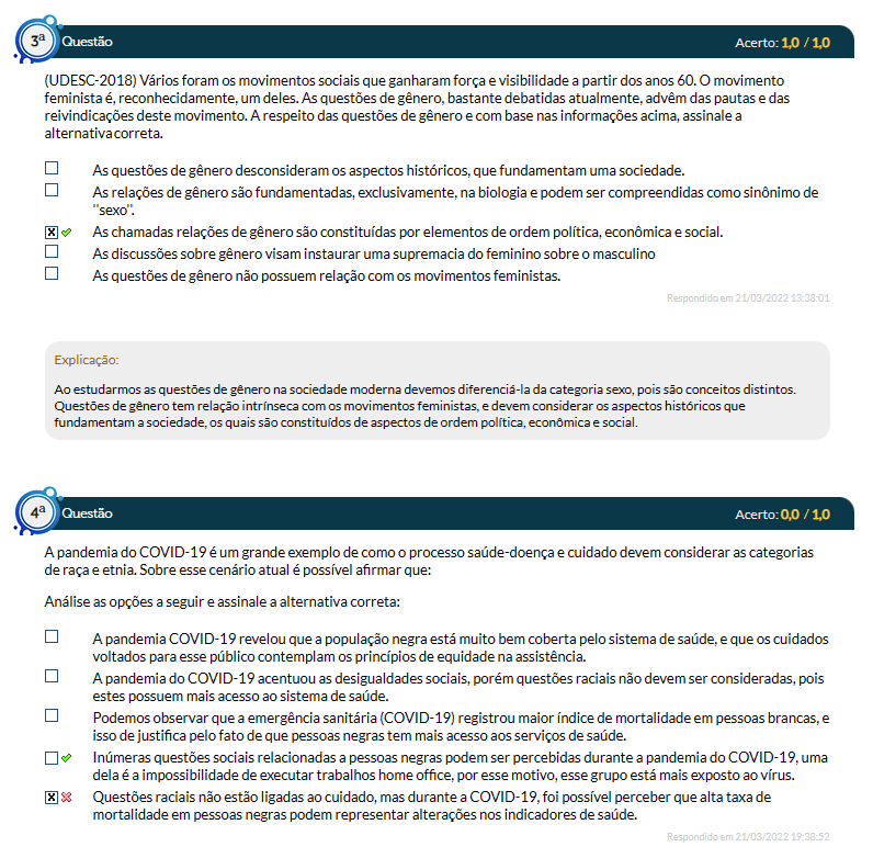 A pandemia do COVID-19 é um grande exemplo de como processo saúde-doença e cuidado devem considerar as categorias de raça e etnia. Sobre esse atual é possível afirmar que: Análise as opções a seguir e assinale a alternativa correta: A pandemia COVID-19 revelou que a população negra está muito bem coberta pelo sistema de saúde, e que os cuidados voltados para esse público contemplam os princípios de equidade na assistência. A pandemia do COVID-19 acentuou as desigualdades sociais, porém questões raciais não devem ser consideradas, pois estes possuem mais acesso ao sistema de saúde. Podemos observar que a emergência sanitária (COVID-19) registrou maior de mortalidade em pessoas brancas, e isso se justifica pelo fato de que pessoas negras têm mais acesso aos serviços de saúde. Questões sociais relacionadas a pessoas negras podem ser percebidas durante a pandemia do COVID-19, uma delas é a impossibilidade de executar trabalhos home office, por esse motivo, esse grupo está mais exposto ao vírus. Questões raciais não estão ligadas ao cuidado, mas durante a pandemia foi possível perceber que a alta taxa de mortalidade em pessoas negras pode representar alterações nos indicadores de saúde.