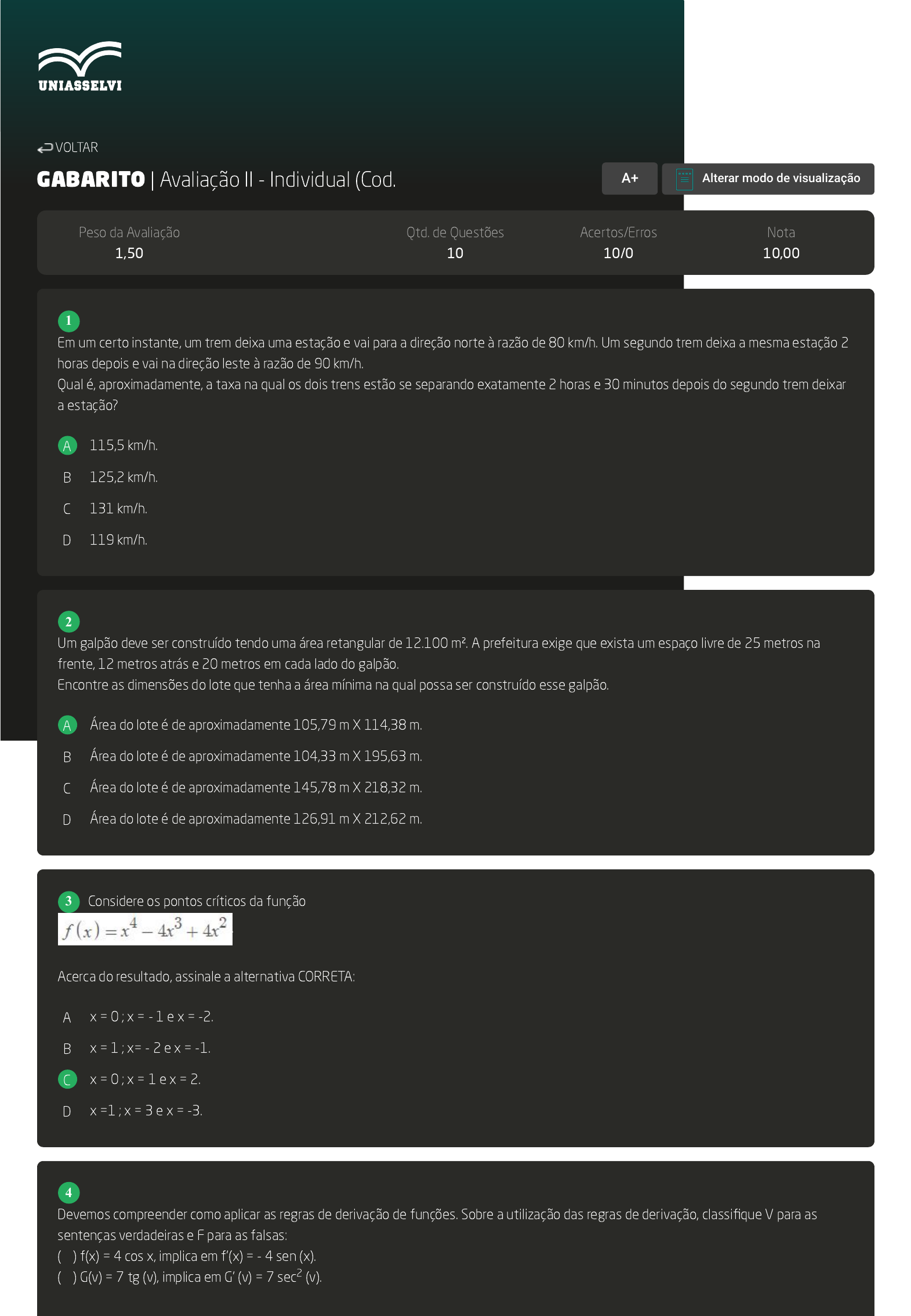 GABARITO | Avaliação II - Individual (Cod. Peso da Avaliação 1,50 Qtd. de Questões 10 Acertos/Erros 10/0 Nota 10,00 Em um certo instante, um trem deixa uma estação e vai para a direção norte à razão de 80 km/h. Um segundo trem deixa a mesma estação 2 horas depois e vai na direção leste à razão de 90 km/h. Qual é, aproximadamente, a taxa na qual os dois trens estão se separando exatamente 2 horas e 30 minutos depois do segundo trem deixar a estação? A 115,5 km/h. B 125,2 km/h. C 131 km/h. D 119 km/h. Um galpão deve ser construído tendo uma área retangular de 12.100 m². A prefeitura exige que exista um espaço livre de 25 metros na frente, 12 metros atrás e 20 metros em cada lado do galpão. Encontre as dimensões do lote que tenha a área mínima na qual possa ser construído esse galpão. A Área do lote é de aproximadamente 105,79 m X 114,38 m. B Área do lote é de aproximadamente 104,33 m X 195,63 m. C Área do lote é de aproximadamente 145,78 m X 218,32 m. D Área do lote é de aproximadamente 126,91 m X 212,62 m. Considere os pontos críticos da função . A x = 0 ; x = - 1 e x = -2. B x = 1 ; x= - 2 e x = -1. C x = 0 ; x = 1 e x = 2. D x =1 ; x = 3 e x = -3. Devemos compreender como aplicar as regras de derivação de funções. Sobre a utilização das regras de derivação, classifique V para as sentenças verdadeiras e F para as falsas: ( ) f(x) = 4 cos x, implica em f’(x) = - 4 sen (x). ( ) G(v) = 7 tg (v), implica em G’ (v) = 7 sec (v). VOLTAR A+ Alterar modo de visualização 1 2 3 Acerca do resultado, assinale a alternativa CORRETA: 4 2 ( ) y = x + x sen (x), implica em y’ = x + sen (x) + x cos (x). ( ) k(t) = t – t cos t, implica em k’(t) = 1 – 2t cos (t) + t sen (t).Assinale a alternativa que apresenta a sequência CORRETA: A F – F – V – F. B F – V – V – V. C V – V – F – F. D V – F – F – F. Uma loja tem vendido 200 aparelhos reprodutores de Blu-ray por semana a R$ 350,00 cada. Uma pesquisa de mercado indicou que para cada R$ 10,00 de desconto oferecido aos compradores, o número de unidades vendidas aumentava 20 por semana. Qual o desconto que a loja deveria oferecer para maximizar sua receita? A Para maximizar a receita, a loja deveria oferecer um desconto de R$ 125,00. B Para maximizar a receita, a loja deveria oferecer um desconto de R$ 150,00. C Para maximizar a receita, a loja deveria oferecer um desconto de R$ 100,00. D Para maximizar a receita, a loja deveria oferecer um desconto de R$ 200,00. Um corpo se move em linha reta, de modo que sua posição no instante t é dada por f(t) = 16t - t², sendo 0 ≤ t ≤ 8, em que o tempo é dado em segundos e a distância em metros. Encontre a velocidade do corpo no instante t = 3: A 22 m/s. B 20 m/s. C 18 m/s. D 10 m/s. Ao derivar a função espaço, encontraremos a função velocidade. Deve-se, então, testar no ponto pedido. Dessa forma, considere o problema a seguir: Um balão meteorológico é solto e sobe verticalmente de modo que sua distância s(t) do solo durante os 10 primeiros segundos de vôo é dada por s(t) = 6 +2t +t , na qual s(t) é contada em metros e t em segundos. Determine a velocidade do balão quando t = 6s. A 20 m/s. B 54 m/s. C 14 m/s. D 12 m/s. Um contêiner retangular utilizado para estocagem deve ter um volume de 10 m³. O comprimento de sua base é o dobro da largura. O material para a base custa R$ 10,00 por metro quadrado. O material para os lados, assim como da tampa custa R$ 6,00 por metro quadrado. Encontre o custo mínimo para construir esse contêiner. A Aproximadamente R$ 203,82. 2 2 5 6 7 2 8 Acerca do resultado, assinale a alternativa CORRETA: B Aproximadamente R$ 178,91. C Aproximadamente R$ 191,28. D Aproximadamente R$ 163,54. No instante t = 0 um corpo inicia um movimento em linha reta. Sua posição no instante t é dada por s(t) = 16t – t². Determine a velocidade média do corpo no intervalo de tempo [2, 4]. A 8 unidades de velocidade. B 12 unidades de velocidade. C 14 unidades de velocidade. D 10 unidades de velocidade. Um vazamento de óleo se espalha sobre a superfície de um lago formando uma mancha circular. Em determinado instante, a mancha tem um raio de 100 metros, que cresce a uma taxa de variação instantânea de 10 metros por hora. Usando pi = 3, estima-se que, nesse instante, a área da superfície do lago coberta pela mancha de óleo está crescendo, em m² /h, a uma taxa instantânea igual a I) 60 II) 30 III) 3000 IV) 6000 A Somente a opção II está correta. B Somente a opção IV está correta. C Somente a opção III está correta. D Somente a opção I está correta. 9 10 Imprimir