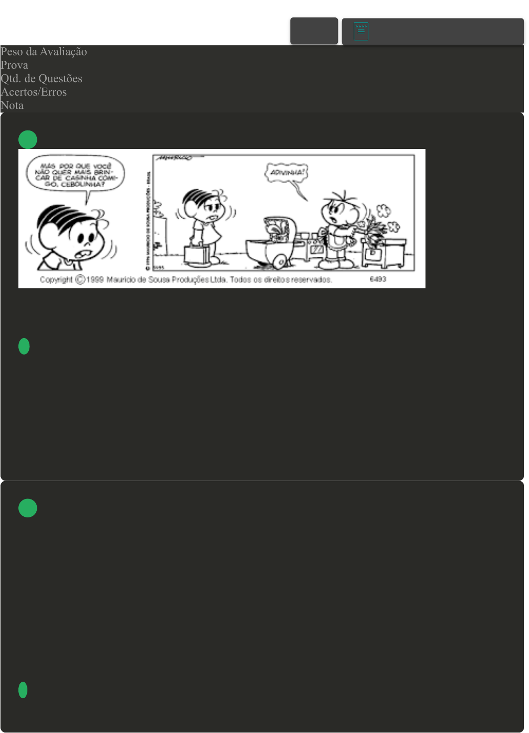20/03/2023, 21:34 Avaliação I - Individual about:blank 1/4 Prova Impressa GABARITO | Avaliação I - Individual (Cod.:822905) Peso da Avaliação 1,50 Prova 60214133 Qtd. de Questões 10 Acertos/Erros 8/2 Nota 8,00 Leia a tirinha e analise a situação comunicativa: Como se dá o entendimento da mensagem transmitida? FONTE: https://www.espacoeducar.net/2012/07/muitas-tirinhas-da-turma-da-monica-para.html. Acesso em: 29 mar. 2021. A Pelo uso da linguagem verbal e não verbal, sendo esta última demonstrada pelas expressões dos personagens e os demais elementos da tirinha. B Pelo texto escrito de modo claro, com linguagem apropriada ao público a que se destina. C Pelo uso da linguagem mista, que exclui a linguagem verbal, uma vez que o texto é para ser lido e não escutado. D Pelo uso da linguagem não verbal, que dispensa quaisquer outros recursos comunicativos. Comunicação é a capacidade de partilhar, participar ou tornar comum. Por meio dela, os seres humanos partilham diferentes informações. Nesse sentido, sobre as definições de linguagem verbal, assinale a alternativa CORRETA: A Aquela em que as palavras não são os sinais utilizados para os atos comunicativos. Por meio de sinais, expressamos desejos, revelando somente opiniões e nosso raciocínio. B Aquela em que os sons são sinais utilizados para os atos comunicativos. Por meio de gestos, expressamos somente sentimentos e ordens. C Aquela em que as palavras são os sinais utilizados para os atos de transmissão. Por meio de gestos, expressamos desejos, sentimentos, ordens, revelando somente opiniões. D Aquela em que as palavras são os sinais utilizados para os atos comunicativos. Por meio de palavras, expressamos desejos, sentimentos, ordens, opiniões, revelando nossas opiniões e nosso raciocínio. VOLTAR A+ Alterar modo de visualização 1 2 20/03/2023, 21:34 Avaliação I - Individual about:blank 2/4 Suponhamos que o receptor encontre uma garrafa em uma praia deserta, e que nela exista uma mensagem. Nesse sentido, assinale a alternativa CORRETA que apresenta a função da garrafa no contexto: A Realizou a função de ruído. B Realizou a função de emissor. C Realizou a função de receptor. D Realizou a função de canal de comunicação. Linguagem é o sistema pelo qual o homem comunica suas ideias e sentimentos, seja por meio da fala, da escrita ou de outros signos convencionais. Dessa forma, quanto à definição de linguagem não verbal, assinale a alternativa CORRETA: A Usa as palavras para se comunicar. B Usa o vestuário para se comunicar. C Utiliza a localização para se comunicar. D Utiliza outros signos, como gestos, sinais, sons, cores, imagens, desenhos e expressões faciais. Linguagem é toda forma pela qual o ser humano usa para se comunicar. Há barreiras, no entanto, que geram falhas à boa comunicação. Nesse sentido, quanto à apresentação confusa, assinale a alternativa CORRETA: A Ocorre quando o emissor pressupõe que o receptor ja sabia o significado. B É a probabilidade decrescente de as pessoas se comunicarem quando a distância for significativa entre elas. C É a falta de ordem e coerência, dificultando o entendimento das informações. D É o grau de cultura ou a forma de encarar situações e os interesses, pois limita a capacidade de entender o que é proposto. A língua é um sistema de representação constituído por palavras e regras que se combinam, permitindo a expressão de uma ideia, ordem, emoção. De acordo com o pressuposto, classifique V para as sentenças verdadeiras e F para as falsas: 3 4 5 6 20/03/2023, 21:34 Avaliação I - Individual about:blank 3/4 ( ) A língua oral possui diversos recursos, como entonação da voz, expressão fisionômica, gestos, além de ser mais espontânea. ( ) A língua escrita não requer mais atenção, pois é uma simples representação da fala. ( ) Em todas as línguas as pessoas não escrevem e não falam de maneira distinta. Podemos, contudo, efetivar a comunicação em um enunciado falado ou escrito. ( ) Na língua falada podemos detectar com maior facilidade se há a compreensão do receptor. Assinale a alternativa que apresenta a sequência CORRETA: A V – V – F – F. B V – V – V – F. C V – F – F – V. D F – V – V – V. Podemos classificar a linguagem como toda forma pela qual o ser humano usa para se comunicar. Nesse sentido, a língua é um sistema convencionado pelos homens e utilizado por grupos. Assinale a alternativa CORRETA que apresenta um tipo de linguagem com sua definição dividida entre falada e escrita: A Linguagem verbal. B Linguagem mental. C Linguagem não verbal. D Linguagem escrita. As funções da linguagem são recursos que enfatizam a intenção do emissor para que se estabeleça uma comunicação eficiente. Elas têm a finalidade de levar o leitor ou o receptor a compreender um efeito ou conceito para o objetivo. Sobre os elementos da comunicação que instituem funções, associe os itens, utilizando o código a seguir: I- Função referencial. II- Função emotiva. III- Função fática. IV- Função metalinguística. ( ) Verifica se o canal de comunicação está em pleno funcionamento. Possui a finalidade de prolongar a relação comunicativa com o receptor. ( ) Seu texto apresenta informações sobre a realidade, traduzindo objetivamente o fato acontecido, uma linguagem direta e objetiva e prevalece a terceira pessoa do singular. ( ) O código linguístico é posto em destaque, usando a linguagem para falar de si, ou seja, faz menção ao próprio código. ( ) É focada nas opiniões, ideias e nas emoções de quem emite a mensagem. As interjeições e as exclamações são geralmente utilizadas. Assinale a alternativa que apresenta a sequência CORRETA: A I - III - IV - II. 7 8 20/03/2023, 21:34 Avaliação I - Individual about:blank 4/4 B III - I - IV - II. C III - I - II - IV. D III - II - I - IV. Linguagem é o sistema pelo qual o homem comunica suas ideias e sentimentos, 