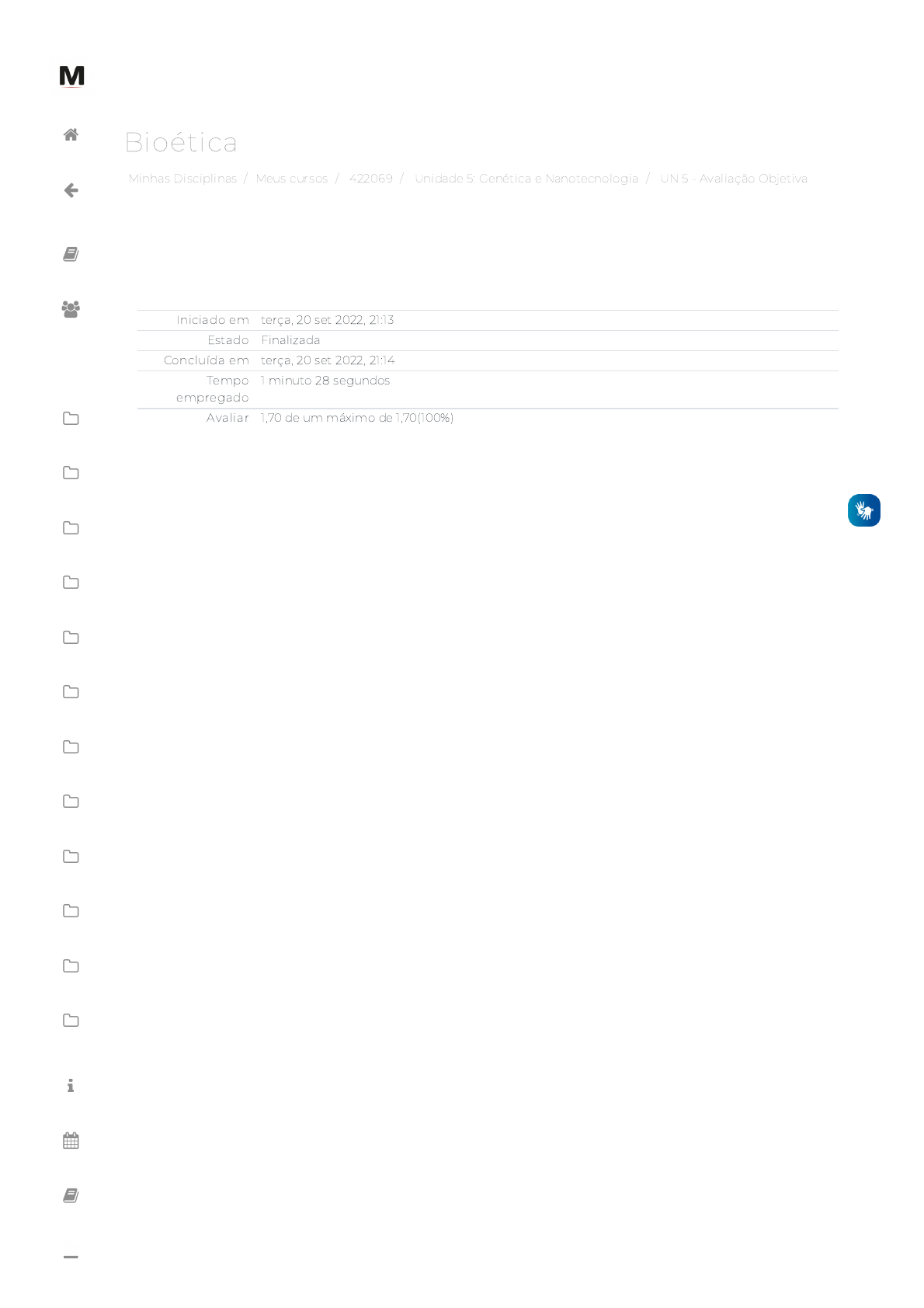 20/09/2022 21:14 UN 5 - Avaliação Objetiva: Revisão da tentativa https://avap.multivix.edu.br/mod/quiz/review.php?attempt=1889346&cmid=1262210 1/6 Minhas Disciplinas / Meus cursos / 422069 / Unidade 5: Genética e Nanotecnologia / UN 5 - Avaliação Objetiva Bioética Iniciado em terça, 20 set 2022, 21:13 Estado Finalizada Concluída em terça, 20 set 2022, 21:14 Tempo empregado 1 minuto 28 segundos Avaliar 1,70 de um máximo de 1,70(100%) https://avap.multivix.edu.br/my/ https://avap.multivix.edu.br/course/view.php?id=19246 https://avap.multivix.edu.br/course/view.php?id=19246§ion=6 https://avap.multivix.edu.br/mod/quiz/view.php?id=1262210 https://avap.multivix.edu.br/my/ https://avap.multivix.edu.br/course/view.php?id=19246 https://avap.multivix.edu.br/user/index.php?id=19246 https://avap.multivix.edu.br/course/view.php?id=19246§ion=1 https://avap.multivix.edu.br/course/view.php?id=19246§ion=2 https://avap.multivix.edu.br/course/view.php?id=19246§ion=3 https://avap.multivix.edu.br/course/view.php?id=19246§ion=4 https://avap.multivix.edu.br/course/view.php?id=19246§ion=5 https://avap.multivix.edu.br/course/view.php?id=19246§ion=6 https://avap.multivix.edu.br/course/view.php?id=19246§ion=7 https://avap.multivix.edu.br/course/view.php?id=19246§ion=8 https://avap.multivix.edu.br/course/view.php?id=19246§ion=9 https://avap.multivix.edu.br/course/view.php?id=19246§ion=10 https://avap.multivix.edu.br/course/view.php?id=19246§ion=11 https://avap.multivix.edu.br/course/view.php?id=19246§ion=12 https://avap.multivix.edu.br/mod/page/view.php?id=1252%2F%22%20target%3D%22_blank https://avap.multivix.edu.br/calendar/view.php/ https://avap.multivix.edu.br/local/staticpage/view.php?page=biblioteca https://portalweb.multivix.edu.br/gabaritos/login.aspx https://avap.multivix.edu.br/ 20/09/2022 21:14 UN 5 - Avaliação Objetiva: Revisão da tentativa https://avap.multivix.edu.br/mod/quiz/review.php?attempt=1889346&cmid=1262210 2/6 Questão 1 Correto Atingiu 0,34 de 0,34 “A nanotecnologia é um campo cientí�co multidisciplinar que tem avançado rapidamente nos últimos anos, encontrando aplicações nas mais diversas áreas, desde setores de energia e eletrônica até a indústria farmacêutica. O princípio dessa nova ciência é que os materiais na escala nanométrica podem apresentar propriedades químicas, físico-químicas e comportamentais diferentes daquelas apresentadas em escalas maiores.” (BERGMANN, 2008, p. 60) Fonte: BERGMANN, B. R. A nanotecnologia: da saúde para além do determinismo tecnológico. Ciência e Cultura. 60 (2) 2008. A nanotecnologia é a ciência que estuda estruturas em escala nanométrica. A respeito das diferentes aplicações na nanotecnologia, avalie as a�rmações a seguir: I. Nanomateriais já estão sendo explorados industrialmente com a fabricação de novos cosméticos, tintas, catalisadores, revestimentos e tecidos. II. Um dos setores da nanotecnologia com maior potencial de aplicação se dá no revestimento e liberação de drogas (fármacos e vacinas) para melhorar a sua e�cácia terapêutica. III. A nanotecnologia apresenta inúmeras aplicações em diferentes áreas, mas ainda não é utilizada em escala industrial, apenas em laboratórios de pesquisa. IV. Nanomateriais podem ser usados para aumentar a longevidade e a biocompatibilidade de dispositivos cirúrgicos e próteses. É CORRETO apenas o que se a�rma em: Escolha uma opção: II e IV I, II e III I e III III e IV I, II e IV Sua resposta está correta. Apenas o item III está incorreto, pois a nanotecnologia já é utilizada em escala industrial para a produção de diversos itens, como medicamentos e cosméticos. https://avap.multivix.edu.br/my/ https://avap.multivix.edu.br/course/view.php?id=19246 https://avap.multivix.edu.br/user/index.php?id=19246 https://avap.multivix.edu.br/course/view.php?id=19246§ion=1 https://avap.multivix.edu.br/course/view.php?id=19246§ion=2 https://avap.multivix.edu.br/course/view.php?id=19246§ion=3 https://avap.multivix.edu.br/course/view.php?id=19246§ion=4 https://avap.multivix.edu.br/course/view.php?id=19246§ion=5 https://avap.multivix.edu.br/course/view.php?id=19246§ion=6 https://avap.multivix.edu.br/course/view.php?id=19246§ion=7 https://avap.multivix.edu.br/course/view.php?id=19246§ion=8 https://avap.multivix.edu.br/course/view.php?id=19246§ion=9 https://avap.multivix.edu.br/course/view.php?id=19246§ion=10 https://avap.multivix.edu.br/course/view.php?id=19246§ion=11 https://avap.multivix.edu.br/course/view.php?id=19246§ion=12 https://avap.multivix.edu.br/mod/page/view.php?id=1252%2F%22%20target%3D%22_blank https://avap.multivix.edu.br/calendar/view.php/ https://avap.multivix.edu.br/local/staticpage/view.php?page=biblioteca https://portalweb.multivix.edu.br/gabaritos/login.aspx https://avap.multivix.edu.br/ 20/09/2022 21:14 UN 5 - Avaliação Objetiva: Revisão da tentativa https://avap.multivix.edu.br/mod/quiz/review.php?attempt=1889346&cmid=1262210 3/6 Questão 2 Correto Atingiu 0,34 de 0,34 A utilização de DNA para a identi�cação de pessoas e a criação de bancos de dados de per�s genéticos suscitaram o surgimento de leis e normas para regulamentar os procedimentos. A respeito destas normas, avalie as a�rmações a seguir: I. A Declaração Universal sobre Bioética e Direitos Humanos, da UNESCO, busca promover a integração dos valores éticos às questões sociais. Os princípios presentes nesta norma estão intimamente relacionados à problemática da criação de bases de dados de per�s genéticos para �ns criminais, como autonomia individual, con�dencialidade, igualdade e justiça. II. No Brasil, a lei nº 12.654/2012 prevê a coleta compulsória de material genético como forma de identi�cação criminal para os condenados por crimes dolosos de natureza grave. III. No Brasil, o decreto nº 7.950/2013 institui a criação do Banco Nacional de Per�s Genéticos e da Rede Integrada de Bancos de Per�s 