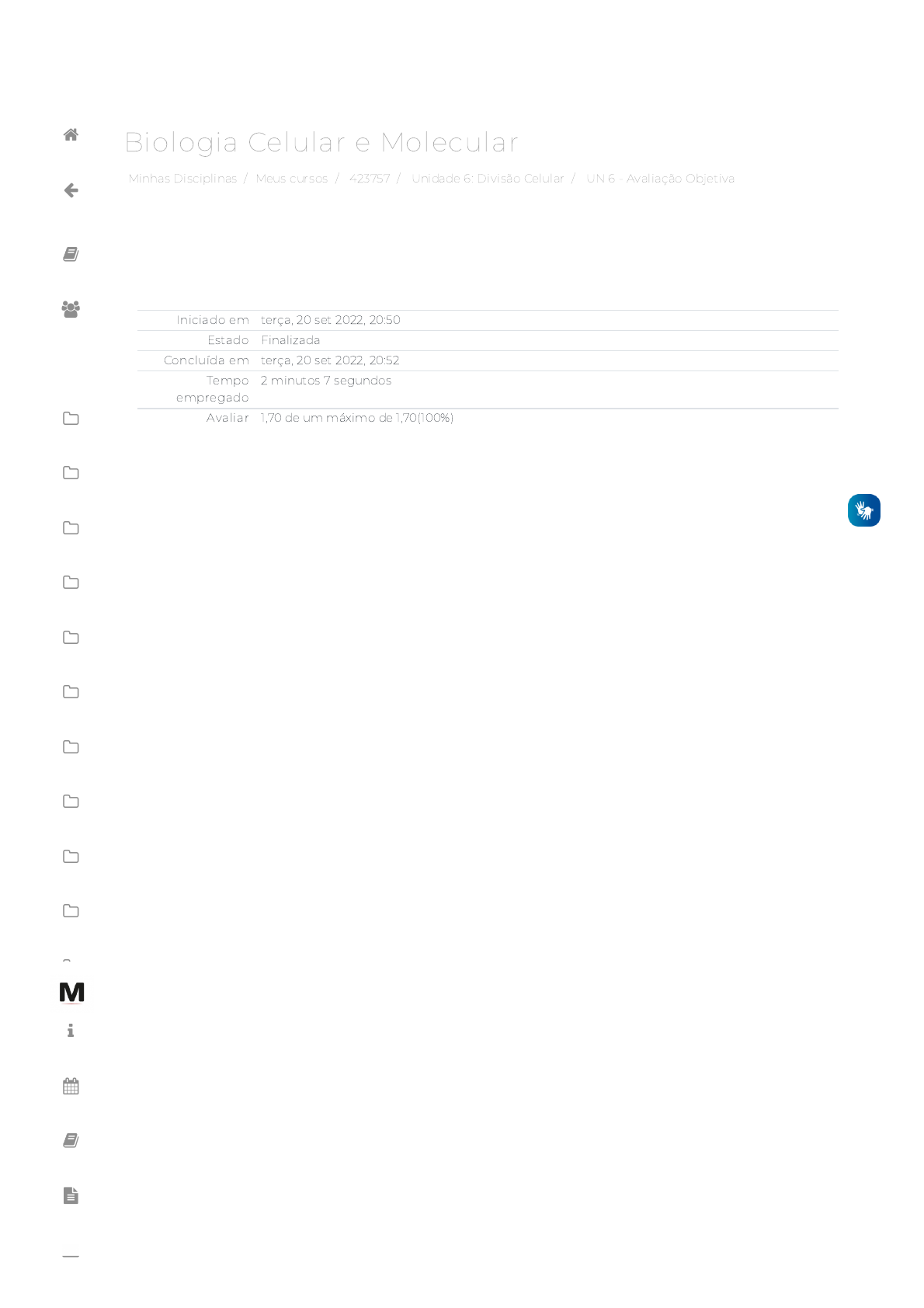 20/09/2022 20:52 UN 6 - Avaliação Objetiva: Revisão da tentativa https://avap.multivix.edu.br/mod/quiz/review.php?attempt=1888941&cmid=1258919 1/6 Minhas Disciplinas / Meus cursos / 423757 / Unidade 6: Divisão Celular / UN 6 - Avaliação Objetiva Biologia Celular e Molecular Iniciado em terça, 20 set 2022, 20:50 Estado Finalizada Concluída em terça, 20 set 2022, 20:52 Tempo empregado 2 minutos 7 segundos Avaliar 1,70 de um máximo de 1,70(100%) https://avap.multivix.edu.br/my/ https://avap.multivix.edu.br/course/view.php?id=19357 https://avap.multivix.edu.br/course/view.php?id=19357§ion=7 https://avap.multivix.edu.br/mod/quiz/view.php?id=1258919 https://avap.multivix.edu.br/my/ https://avap.multivix.edu.br/course/view.php?id=19357 https://avap.multivix.edu.br/user/index.php?id=19357 https://avap.multivix.edu.br/course/view.php?id=19357§ion=1 https://avap.multivix.edu.br/course/view.php?id=19357§ion=2 https://avap.multivix.edu.br/course/view.php?id=19357§ion=3 https://avap.multivix.edu.br/course/view.php?id=19357§ion=4 https://avap.multivix.edu.br/course/view.php?id=19357§ion=5 https://avap.multivix.edu.br/course/view.php?id=19357§ion=6 https://avap.multivix.edu.br/course/view.php?id=19357§ion=7 https://avap.multivix.edu.br/course/view.php?id=19357§ion=8 https://avap.multivix.edu.br/course/view.php?id=19357§ion=9 https://avap.multivix.edu.br/course/view.php?id=19357§ion=10 https://avap.multivix.edu.br/course/view.php?id=19357§ion=11 https://avap.multivix.edu.br/mod/page/view.php?id=1252%2F%22%20target%3D%22_blank https://avap.multivix.edu.br/calendar/view.php/ https://avap.multivix.edu.br/local/staticpage/view.php?page=biblioteca https://portalweb.multivix.edu.br/gabaritos/login.aspx https://multivix.edu.br/office-365/ https://avap.multivix.edu.br/ 20/09/2022 20:52 UN 6 - Avaliação Objetiva: Revisão da tentativa https://avap.multivix.edu.br/mod/quiz/review.php?attempt=1888941&cmid=1258919 2/6 Questão 1 Correto Atingiu 0,34 de 0,34 Nas imagens a seguir temos as quatro fases em que a mitose é dividida. Imagem I: Imagem II. Imagem III. Imagem IV. Fonte: SHUTTERSTOCK, 2018. Analise as imagens e assinale qual alternativa que não condiz com a imagem apresentada: Escolha uma opção: Imagem I – PRÓFASE Imagem II - ANÁFASE Imagem III - ANÁFASE Imagem IV - TELÓFASE Imagem II – METÁFASE Sua resposta está correta. https://avap.multivix.edu.br/my/ https://avap.multivix.edu.br/course/view.php?id=19357 https://avap.multivix.edu.br/user/index.php?id=19357 https://avap.multivix.edu.br/course/view.php?id=19357§ion=1 https://avap.multivix.edu.br/course/view.php?id=19357§ion=2 https://avap.multivix.edu.br/course/view.php?id=19357§ion=3 https://avap.multivix.edu.br/course/view.php?id=19357§ion=4 https://avap.multivix.edu.br/course/view.php?id=19357§ion=5 https://avap.multivix.edu.br/course/view.php?id=19357§ion=6 https://avap.multivix.edu.br/course/view.php?id=19357§ion=7 https://avap.multivix.edu.br/course/view.php?id=19357§ion=8 https://avap.multivix.edu.br/course/view.php?id=19357§ion=9 https://avap.multivix.edu.br/course/view.php?id=19357§ion=10 https://avap.multivix.edu.br/course/view.php?id=19357§ion=11 https://avap.multivix.edu.br/mod/page/view.php?id=1252%2F%22%20target%3D%22_blank https://avap.multivix.edu.br/calendar/view.php/ https://avap.multivix.edu.br/local/staticpage/view.php?page=biblioteca https://portalweb.multivix.edu.br/gabaritos/login.aspx https://multivix.edu.br/office-365/ https://avap.multivix.edu.br/ 20/09/2022 20:52 UN 6 - Avaliação Objetiva: Revisão da tentativa https://avap.multivix.edu.br/mod/quiz/review.php?attempt=1888941&cmid=1258919 3/6 Questão 2 Correto Atingiu 0,34 de 0,34 A meiose está classi�ca em três tipos especí�cos, assinale quais são eles: Escolha uma opção: Meiose Zigótica, Meiose Espórica, Meiose ribossomática. Meiose Enzimática, Meiose Espórica, Meiose Gamética Meiose Zigótica, Meiose Espórica, Meiose Gamética Meiose Zigótica, Meiose preditiva, Meiose Gamética Meiose Zigótica, Meiose nucleotídica, Meiose Gamética Sua resposta está correta. https://avap.multivix.edu.br/my/ https://avap.multivix.edu.br/course/view.php?id=19357 https://avap.multivix.edu.br/user/index.php?id=19357 https://avap.multivix.edu.br/course/view.php?id=19357§ion=1 https://avap.multivix.edu.br/course/view.php?id=19357§ion=2 https://avap.multivix.edu.br/course/view.php?id=19357§ion=3 https://avap.multivix.edu.br/course/view.php?id=19357§ion=4 https://avap.multivix.edu.br/course/view.php?id=19357§ion=5 https://avap.multivix.edu.br/course/view.php?id=19357§ion=6 https://avap.multivix.edu.br/course/view.php?id=19357§ion=7 https://avap.multivix.edu.br/course/view.php?id=19357§ion=8 https://avap.multivix.edu.br/course/view.php?id=19357§ion=9 https://avap.multivix.edu.br/course/view.php?id=19357§ion=10 https://avap.multivix.edu.br/course/view.php?id=19357§ion=11 https://avap.multivix.edu.br/mod/page/view.php?id=1252%2F%22%20target%3D%22_blank https://avap.multivix.edu.br/calendar/view.php/ https://avap.multivix.edu.br/local/staticpage/view.php?page=biblioteca https://portalweb.multivix.edu.br/gabaritos/login.aspx https://multivix.edu.br/office-365/ 20/09/2022 20:52 UN 6 - Avaliação Objetiva: Revisão da tentativa https://avap.multivix.edu.br/mod/quiz/review.php?attempt=1888941&cmid=1258919 4/6 Questão 3 Correto Atingiu 0,34 de 0,34 Divisão celular é o processo que ocorre nos seres vivos, através do qual a célula-mãe, se divide em duas (mitose) ou quatro (meiose) células-�lhas, com toda a informação genética relativa à espécie. Observe o esquema de divisão celular de um indivíduo diploide, representado na �gura abaixo. Sobre a �gura é correto a�rmar: Escolha uma opção: As cromátides expressam que houve o processo de crossing-over em relação aos genes destacados. A célula representada é certamente humana, devido à presença de centríolos. O indivíduo em questão apresenta um conjunt