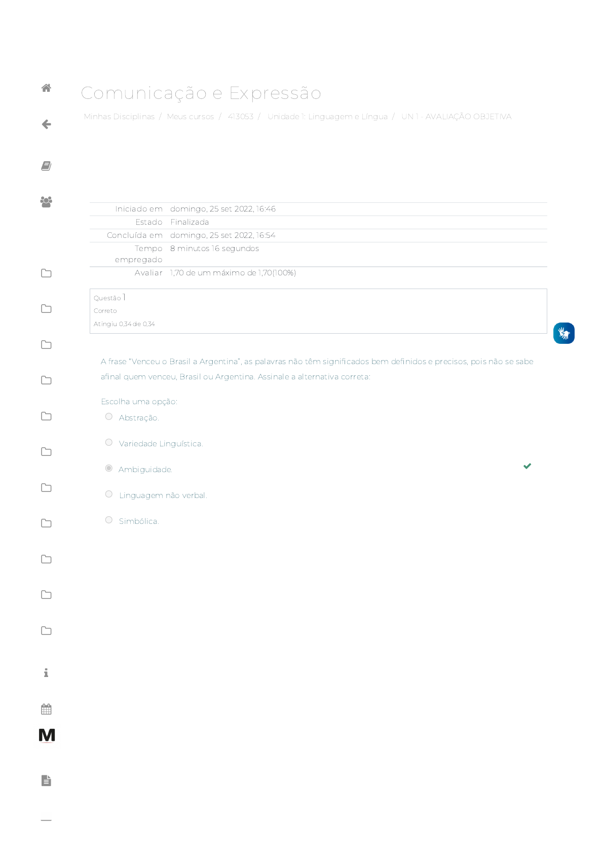 25/09/2022 16:54 UN 1 - AVALIAÇÃO OBJETIVA: Revisão da tentativa https://avap.multivix.edu.br/mod/quiz/review.php?attempt=1923921&cmid=1247963 1/4 Minhas Disciplinas / Meus cursos / 413053 / Unidade 1: Linguagem e Língua / UN 1 - AVALIAÇÃO OBJETIVA Comunicação e Expressão Iniciado em domingo, 25 set 2022, 16:46 Estado Finalizada Concluída em domingo, 25 set 2022, 16:54 Tempo empregado 8 minutos 16 segundos Avaliar 1,70 de um máximo de 1,70(100%) Questão 1 Correto Atingiu 0,34 de 0,34 A frase “Venceu o Brasil a Argentina”, as palavras não têm signi�cados bem de�nidos e precisos, pois não se sabe a�nal quem venceu, Brasil ou Argentina. Assinale a alternativa correta: Escolha uma opção: Abstração. Variedade Linguística. Ambiguidade. Linguagem não verbal. Simbólica. https://avap.multivix.edu.br/my/ https://avap.multivix.edu.br/course/view.php?id=18960 https://avap.multivix.edu.br/course/view.php?id=18960§ion=2 https://avap.multivix.edu.br/mod/quiz/view.php?id=1247963 https://avap.multivix.edu.br/my/ https://avap.multivix.edu.br/course/view.php?id=18960 https://avap.multivix.edu.br/user/index.php?id=18960 https://avap.multivix.edu.br/course/view.php?id=18960§ion=1 https://avap.multivix.edu.br/course/view.php?id=18960§ion=2 https://avap.multivix.edu.br/course/view.php?id=18960§ion=3 https://avap.multivix.edu.br/course/view.php?id=18960§ion=4 https://avap.multivix.edu.br/course/view.php?id=18960§ion=5 https://avap.multivix.edu.br/course/view.php?id=18960§ion=6 https://avap.multivix.edu.br/course/view.php?id=18960§ion=7 https://avap.multivix.edu.br/course/view.php?id=18960§ion=8 https://avap.multivix.edu.br/course/view.php?id=18960§ion=9 https://avap.multivix.edu.br/course/view.php?id=18960§ion=10 https://avap.multivix.edu.br/course/view.php?id=18960§ion=11 https://avap.multivix.edu.br/mod/page/view.php?id=1252%2F%22%20target%3D%22_blank https://avap.multivix.edu.br/calendar/view.php/ https://avap.multivix.edu.br/local/staticpage/view.php?page=biblioteca https://portalweb.multivix.edu.br/gabaritos/login.aspx https://multivix.edu.br/office-365/ https://avap.multivix.edu.br/ 25/09/2022 16:54 UN 1 - AVALIAÇÃO OBJETIVA: Revisão da tentativa https://avap.multivix.edu.br/mod/quiz/review.php?attempt=1923921&cmid=1247963 2/4 Questão 2 Correto Atingiu 0,34 de 0,34 Vício da fala Para dizerem milho dizem mio Para melhor dizem mió Para pior pió Para telha dizem teia Para telhado dizem teiado E vão fazendo telhados. Oswald de Andrade Sobre o poema de Oswald de Andrade, um dos principais representantes da primeira geração do modernismo brasileiro, é correto a�rmar: Escolha uma opção: a. Oswald, como os demais modernistas da primeira fase, defendia o uso da coloquialidade nos textos escritos como maneira de alcançar uma linguagem genuinamente brasileira, linguagem que levasse em consideração os diferentes registros da língua portuguesa. b. Oswald, como os demais modernistas da primeira fase, dava preferência ao uso da linguagem mais cuidada, na variedade culta e padrão, com o objetivo de aplicar regras gramaticais, lexicais, ortográ�cas da língua brasileira, e a maior precisão vocabular possível. c. Aqueles que subvertem a norma culta ao falar “mio”, em vez de milho, “mió” em vez de melhor, “pió” em vez de pior, “teiado” em vez de telhado estão prejudicando o entendimento da mensagem, anulando a comunicação, sua principal �nalidade. d. O poema de Oswald tece uma crítica sobre o emprego da coloquialidade nos textos da literatura brasileira. De acordo com o poema, essa coloquialidade subverte a norma culta da língua, único registro capaz de representar adequadamente a linguagem poética. e. O título “Vício da fala” remete à falha dos brasileiros ao reproduzir erradamente fonemas complexos. Essa simpli�cação das palavras é prejudicial para o idioma, já que pode vulgarizar a língua portuguesa. https://avap.multivix.edu.br/my/ https://avap.multivix.edu.br/course/view.php?id=18960 https://avap.multivix.edu.br/user/index.php?id=18960 https://avap.multivix.edu.br/course/view.php?id=18960§ion=1 https://avap.multivix.edu.br/course/view.php?id=18960§ion=2 https://avap.multivix.edu.br/course/view.php?id=18960§ion=3 https://avap.multivix.edu.br/course/view.php?id=18960§ion=4 https://avap.multivix.edu.br/course/view.php?id=18960§ion=5 https://avap.multivix.edu.br/course/view.php?id=18960§ion=6 https://avap.multivix.edu.br/course/view.php?id=18960§ion=7 https://avap.multivix.edu.br/course/view.php?id=18960§ion=8 https://avap.multivix.edu.br/course/view.php?id=18960§ion=9 https://avap.multivix.edu.br/course/view.php?id=18960§ion=10 https://avap.multivix.edu.br/course/view.php?id=18960§ion=11 https://avap.multivix.edu.br/mod/page/view.php?id=1252%2F%22%20target%3D%22_blank https://avap.multivix.edu.br/calendar/view.php/ https://avap.multivix.edu.br/local/staticpage/view.php?page=biblioteca https://portalweb.multivix.edu.br/gabaritos/login.aspx https://multivix.edu.br/office-365/ https://avap.multivix.edu.br/ 25/09/2022 16:54 UN 1 - AVALIAÇÃO OBJETIVA: Revisão da tentativa https://avap.multivix.edu.br/mod/quiz/review.php?attempt=1923921&cmid=1247963 3/4 Questão 3 Correto Atingiu 0,34 de 0,34 Questão 4 Correto Atingiu 0,34 de 0,34 Na linguagem, nos graus de formalidade do uso da língua, as pessoas se comunicam de forma informal, no cotidiano, nas redes sociais, nas conversas pessoais sem regras da língua culta. Assinale a opção correta: Escolha uma opção: Linguagem coloquial. Linguagem erudita. Linguagem formal. Linguagem teológica. Linguagem �losó�ca. Na linguagem, uma maçã, temos a seguinte forma: o Signi�cante, ou seja, o som da palavra, que é a união de fonemas que vai formar o vocábulo “maçã”; e o Signi�cado, que é a ideia de temos de determinada fruta especí�ca; além ainda do Referencial, que é a fruta real existente. Esta é uma de�nição de uma noção na Lingu