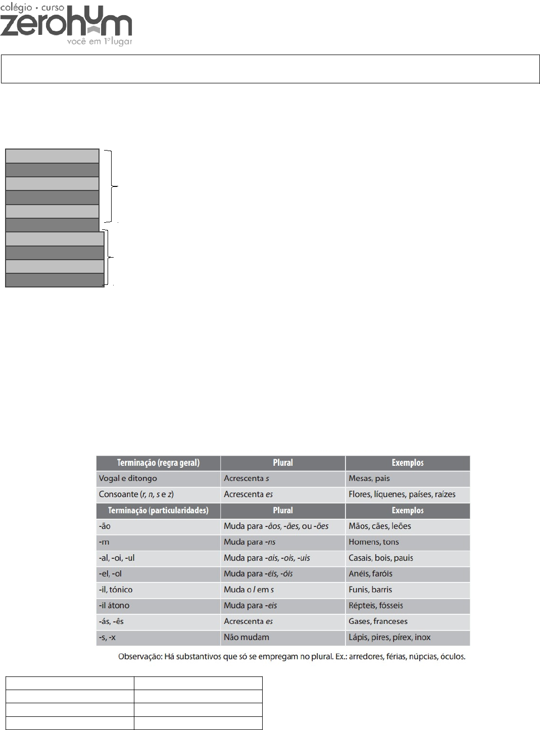 Data: 15/10/2021 PROFESSORA: Luana Crespo DISCIPLINA: Língua Portuguesa AULA 2 Interpretação e morfologia (classificação das palavras) Morfologia é a parte da gramática que estuda a estrutura, a formação e classificação das palavras. CLASSE DE PALAVRAS Há dez classes de palavras no português: substantivo, adjetivo, pronome, artigo, numeral, verbo, advérbio, conjunção, preposição e interjeição. SUBSTANTIVO ( VARIÁVEIS )ADJETIVO PRONOME ARTIGO NUMERAL VERBO ADVÉRBIO ( IN VARIÁVEIS )CONJUNÇÃO PREPOSIÇÃO INTERJEIÇÃO Uma palavra é variável quando sofre, por meio de desinências, modificação de gênero, número, pessoa ou modo. 1. Substantivo Palavra com que nomeamos os seres de um modo em geral. Ex.: cão, livro, árvore, menino. Ele pode ser: · Comum -Ex.: cidade, homem, país · Próprio – Ex.: São Gonçalo, Carlos, Brasil · Concreto – Ex.: flor, pedra, saci, sapatilha · Abstrato – Ex.: amor, saudade, ilusão, abraço · Coletivo – Ex.: constelação, rebanho, enxame Flexão dos substantivos 1) Número · Alguns substantivos terminados em –ÃO merecem atenção especial: Tubarão - tubarões Escrivão – escrivães Tabelião - tabeliães Cidadão – cidadãos Capelão - capelães Cristão – cristãos Alemão – alemães Capitão – capitães Pagão – pagãos Pão – pães 2) Gênero Os substantivos na língua portuguesa podem pertencer ao gênero masculino ou feminino. Na formação dos substantivos, podemos encontrar as seguintes classificações: Substantivos biformes – possuem duas formas, uma para masculino e outra para feminino. Ex.: aluno – aluna bode – cabra Substantivos uniformes – possuem uma única forma para os dois gêneros, que podem se dividir em: · Comum de dois gêneros: apresenta uma só forma para os dois gêneros. Ex.: o estudante, a estudante · Sobrecomum: apresenta apenas um gênero, mas podem designar pessoas do sexo masculino e feminino. Ex.: criança, testemunha · Epiceno: apresenta um só gênero gramatical para designar certos animas. Ex.: jacaré macho, jacaré fêmea. 3) Grau Para formar o aumentativo ou o diminutivo usamos dois processos: · Sintético – acrescentamos sufixos aumentativos ou diminutivos à forma normal do substantivo. Ex.: amigão – amiguinho · Analíticos – o substantivo aparece no grau normal, mas são acrescentados adjetivos que expressam ideia de aumento ou diminuição. Ex.: amigo grande – amigo pequeno 2. ADJETIVO Palavra que confere ao substantivo uma qualidade, um estado, uma característica ou um aspecto. Ex.: aluno dedicado, menina doente Flexão do adjetivo 1) Número Ex.: muro alto, muro altos 2) Gênero Ex.: livro caro, casa cara 3) Grau Normal: Paulo é alto. Comparativo: de superioridade – Paulo é mais alto que Antônio. de inferioridade – Paulo é menos alto que Antônio. de igualdade – Paulo é tão alto quanto Antônio. Superlativo: A) Absoluto: Sintético – Ex.: Paulo é altíssimo. Analítico – Ex.: Paulo é bastante alto. B) Relativo: de superioridade – Ex.: Paulo é o mais alto da sala. de inferioridade - Ex.: Paulo é o menos alto da sala. 3. ARTIGO Palavra que acompanha o substantivo, definindo ou indefinindo. Definidos: o, a, os, as Ex.: Mãe, encontreia carteira que eu procurava. Indefinidos: um, uma, uns e umas Ex.: Andando pela rua, encontrei uma carteira cheia de documentos. 4. NUMERAL Palavra que expressa quantidade. 1) CARDINAL – o número certo de seres Um , dois, três, quatro 2) ORDINAL – palavra que expressa uma ordem Segundo, terceiro, quarto, quinto 3) Multiplicativo – palavra que indica uma multiplicação Duplo, triplo 4) FRACIONÁRIO – palavra que indica uma fração Meio, terço, quarto 5. PRONOME É a palavra que substitui ou acompanha o nome (substantivo). Pronome substantivo – é aquele que substitui um nome. Os meninos foram à festa. Eles beberam demais. Pronome adjetivo – é aquele que acompanha um substantivo. Aquela criança chora muito. CLASSIFICAÇÃO DOS PRONOMES 1) Pessoais a) Retos: funcionam como sujeito. (Eu, tu, ele nós, vós e eles) b) Oblíquo: funcionam como objetos ou adjuntos. Átonos: me, te lhe, o, a, lhe, nos, vos Tônicos: mim, comigo, ti, contigo, conosco, convosco Reflexivos: quando indica que o sujeito pratica e sofre a ação. Os mais comuns são: se, si e consigo. Mas também temos: me, te e nos e vos. Ex.: Eu me feri muito. 2) Tratamentos – são usados no relacionamento social, de acordo com as circunstâncias. 3) Possessivos – indicam posse. Ex.: meu, teu, seu, nosso, vosso, minha, tua etc. 4) Demonstrativos - são os que indicam o lugar em que uma pessoa ou coisa se encontra. Ex.: este, esta, isto esse, essa, isso aquele, aquela, aquilo 5) Indefinidos – são aqueles que se referem a substantivos de modo vago, genérico ou impreciso. Ex.: algum, nenhum, muito, pouco, bastante, todo, certo... (variáveis) / tudo, nada, alguém, ninguém, outrem, cada... 6) Relativos – são aqueles que representam nomes já mencionados anteriormente e com os quais se relacionam. · São sempre relativos: o qual (e flexões) e cujo (e flexões). · Podem ser também relativos: que, quem e onde. Ex.: O livro que comprei é bom. A casa onde morei desabou. 7) Interrogativos Ex.: Que?,quem?, quanto? e quando? Ex.: Quem fez isso? (interrogação direta) Não me disseram quem fez isso. ( interrogação indireta) COLOCAÇÃO PRONOMINAL É a parte da gramática que trata da posição do pronome em relação ao verbo. Antes do verbo (próclise), depois do verbo (ênclise) e no meio do verbo mesóclise. PRÓCLISE O pronome surge antes do verbo, porque há uma palavra que o atrai, chamada de PALAVRA ATRATIVA. São elas: · Palavra de sentido negativo. Ex.: Não se aproxime. · Advérbio. Ex.: Agora se negam a depor. · Conjunções subordinativas. Ex.: Nada foi feito, embora se conhecessem as conseqüências da omissão. · Pronome relativo. Ex.: Identificaram duas pessoas que se encontravam desa