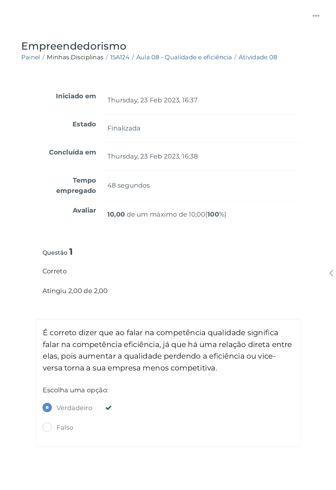 21/03/2023, 12:59 Atividade 08 https://ava.politecnicabr.com.br/mod/quiz/review.php?attempt=4431949 1/4 Painel / Minhas Disciplinas / 15A124 / Aula 08 - Qualidade e e�ciência / Atividade 08 Empreendedorismo Iniciado em Thursday, 23 Feb 2023, 16:37 Estado Finalizada Concluída em Thursday, 23 Feb 2023, 16:38 Tempo empregado 48 segundos Avaliar 10,00 de um máximo de 10,00(100%) Questão 1 Correto Atingiu 2,00 de 2,00 É correto dizer que ao falar na competência qualidade signi�ca falar na competência e�ciência, já que há uma relação direta entre elas, pois aumentar a qualidade perdendo a e�ciência ou vice- versa torna a sua empresa menos competitiva. Escolha uma opção: Verdadeiro Falso https://ava.politecnicabr.com.br/my/ https://ava.politecnicabr.com.br/course/view.php?id=883 https://ava.politecnicabr.com.br/course/view.php?id=883#section-9 https://ava.politecnicabr.com.br/mod/quiz/view.php?id=29053 https://ava.politecnicabr.com.br/ 21/03/2023, 12:59 Atividade 08 https://ava.politecnicabr.com.br/mod/quiz/review.php?attempt=4431949 2/4 Questão 2 Correto Atingiu 2,00 de 2,00 O tema da qualidade e da e�ciência envolve dois níveis, quais são eles: Escolha uma opção: Questão 3 Correto Atingiu 2,00 de 2,00 Um empreendedor não se diferencia de um indivíduo comum por seu comportamento e atitudes, mas apenas por suas ações. Escolha uma opção: a. nível técnico e pessoal b. nível comportamental e técnico c. nível pessoal e comportamental Verdadeiro Falso https://ava.politecnicabr.com.br/ 21/03/2023, 12:59 Atividade 08 https://ava.politecnicabr.com.br/mod/quiz/review.php?attempt=4431949 3/4 Questão 4 Correto Atingiu 2,00 de 2,00 De�nir quem são os clientes pode ser considerado um passo básico para trabalhar a qualidade, pois ajuda o empreendedor não ter uma visão limitada dos seus clientes. Escolha uma opção: Questão 5 Correto Atingiu 2,00 de 2,00 Pode-se a�rmar que uma das características dos empresários bem-sucedidos é que eles tratam de dar aos seus clientes o máximo de qualidade pelo que esses clientes estão dispostos a pagar. Escolha uma opção: Verdadeiro Falso Verdadeiro Falso https://ava.politecnicabr.com.br/ 21/03/2023, 12:59 Atividade 08 https://ava.politecnicabr.com.br/mod/quiz/review.php?attempt=4431949 4/4 © 2022 - Escola Politécnica Brasileira Entre em Contato https://www.politecnicabr.com.br 0800 084 2627 0800 084 2627 Links Úteis Dicas da nossa Diretora Acadêmica Planner de Estudos Declaração de Matrícula Orientações do AVA Abertura de Ticket Fale com o Tutor Cronograma de Estudos Manual de Estágio Manual de Competência Siga-nos nas redes sociais https://ava.politecnicabr.com.br/mod/quiz/0 https://www.politecnicabr.com.br/ https://soundcloud.com/user-501638417/sets/escola-politecnica-brasileira https://storage.googleapis.com/sirius-pubstore/semestre_plannerdeestudo%20poli.pdf https://storage.googleapis.com/sirius-pubstore/declaracao_matricula.pdf https://storage.googleapis.com/sirius-pubstore/orientacoes_ava.pdf https://storage.googleapis.com/sirius-pubstore/abertura_ticket.pdf https://storage.googleapis.com/sirius-pubstore/fale_com_tutor.pdf https://storage.googleapis.com/sirius-pubstore/cronograma_estudos.pdf https://storage.googleapis.com/sirius-pubstore/manual_estagio.pdf https://storage.googleapis.com/sirius-pubstore/manual_competencia.pdf https://www.facebook.com/politecnicabr https://www.instagram.com/politecnicabr_oficial https://ava.politecnicabr.com.br/