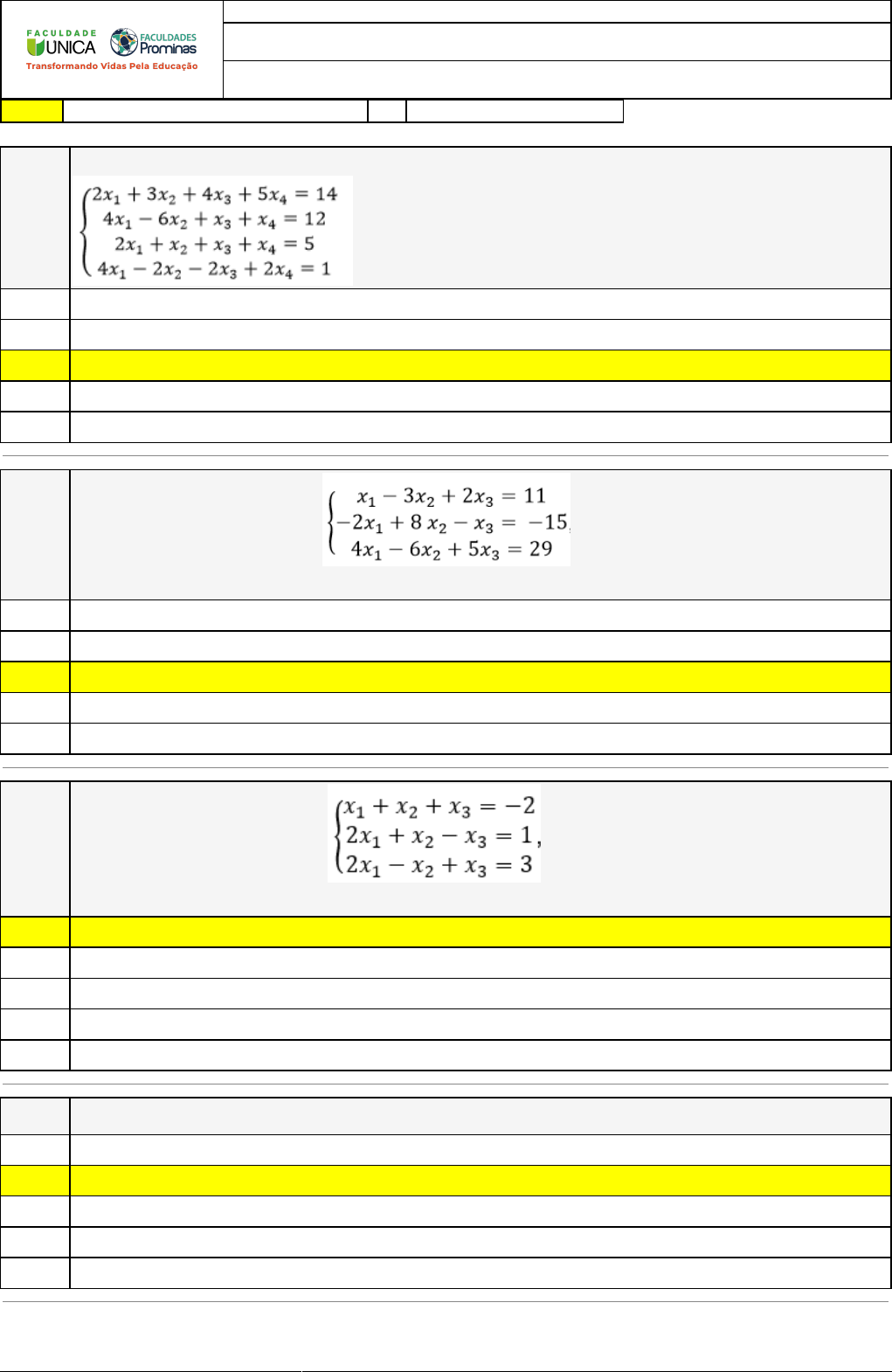 04/03/2023 18:58:23 1/3 REVISÃO DE SIMULADO Nome: ADRIANO DE ALBUQUERQUE SOUZA SENDRA Disciplina: Cálculo Numérico Respostas corretas são marcadas em amarelo X Respostas marcardas por você. Questão 001 Resolvendo o sistema a seguir pela eliminação de Gauss, o valor de x2 é: A) -0,007 B) -0,098 C) -0,664 D) -0,876 X E) -0,876 Questão 002 Considere o sistema linear , resolvendo pelo processo da eliminação de Gauss, chegamos a x2 igual a: X A) -5 B) -3 C) -1 D) 2 E) 3 Questão 003 Considere o sistema Linear , o resultado de x3, utilizando a fatoração LU é: X A) -1 B) 4 C) -3 D) 2 E) -2 Questão 004 Resolvendo o sistema a seguir pela eliminação de Gauss, o valor de x1 é: A) 1,123 B) 1,175 C) 1,234 D) 1,347 X E) 1,345 04/03/2023 18:58:23 2/3 Questão 005 Considere o sistema linear Sobre a decomposição LU é correto afirmar que: A) B) C) X D) E) Nenhuma das alternativas. Questão 006 (ENADE) Em uma loja de material escolar, as mercadorias caneta, lápis e borracha, de um único tipo cada uma, são vendidas para três estudantes. O primeiro comprou uma caneta, três lápis e duas borrachas, pagando R$10,00; o segundo adquiriu duas canetas, um lápis e uma borracha, pagando R$9,00; o terceiro comprou três canetas, quatro lápis e três borrachas, pagando R$19,00. Os estudantes, após as compras, sem verificarem os valores de cada mercadoria, procuraram resolver o problema: “A partir das compras efetuadas e dos respectivos valores totais pagos por eles, qual o preço da caneta, do lápis e da borracha?” Para isso, montaram um sistema de equações lineares cujas incógnitas são os preços das mercadorias. Esse sistema é: X A) possível indeterminado, de forma que a soma dos valores possíveis da caneta, do lápis e da borracha é igual a 1⁄5da adição do preço da borracha com r$28,00. B) impossível, pois saber os totais das compras não garante a existência de solução. C) possível determinado, podendo admitir como solução o valor do preço da caneta, do lápis e da borracha. D) possível indeterminado, de forma que a soma dos valores possíveis da caneta, do lápis e da borracha é igual a cinco vezes o preço do lápis subtraído de r$9,00. E) possível determinado, sendo o preço da borracha mais caro que o do lápis. Questão 007 Considere o seguinte problema: João foi comprar materiais para seu escritório. Se ele comprar dois carimbos, três canetas e quatro resmas de papel, gastará R$115,00, se comprar uma resma de papel, três carimbos e cinco canetas, gastará R$66,50 e se comprar nove canetas e três resmas de papel gastará R$91,50. O sistema linear que corresponde a esse problema é: 04/03/2023 18:58:23 3/3 A) B) C) X D) E) Questão 008 Considere o sistema linear É correto afirmar que: A) Fazendo a operação elementar L1 → L1 - 3L3 a segunda equação passa a ser 3a +2b =1. B) Nenhuma das alternativas anteriores. C) Fazendo a operação elementar L3 = L3 – 4/3 L1 a terceira equação passa a ser 1/3 b – 22/3 c = 5/3. D) Fazendo a operação elementar L2 → L2 - L3 a segunda equação passa a ser 3a +2b =1. X E) Fazendo a operação elementar L3 = L3 - L1 a primeira equação passa a ser a + b - 6c = 2.
