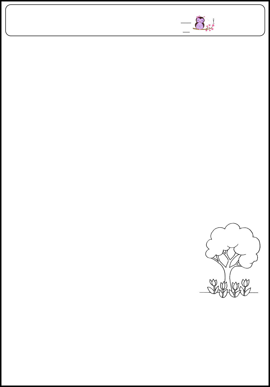 Escola____________________________________________________________________ Professor(a): _________________________ Data: ____________ Aluno(a): _____________________________________________ 21 DE SETEMBRO – DIA DA ÁRVORE A árvore é vida Gilson Lima e Reginaldo Francisco de Oliveira Árvore, fonte de vida Fonte de amor Fonte de sobrevivência Para aqueles que têm consciência A árvore produz fruto para alimentar Que jamais pode faltar Aqui ou em qualquer lugar Todos, dela, vão sempre precisar A árvore é fonte de abrigo Dela, somos todos amigos É uma fonte alimentar Que todos devem preservar A árvore é fonte de ar Que todos necessitamos para respirar Devemos todos respeitar Para que nunca possa faltar É tão lindo ver o sol beijar a flor Isso mostra que por ela o sol tem amor E lhe dá muito valor Pois seus frutos possuem sabor! A árvore necessita da terra Para sobreviver na atmosfera O homem, sem ela, se desespera E o planeta sem ela se degenera São as árvores que nos dão sombra Nos servem de casa quando não temos É por isso que devemos a ela Todo o nosso respeito e amor! És minha amiga particular Sempre quero junto dela ficar Nunca sozinha vou te deixar Pois, é minha irmã e sempre será! 1) Qual é o título do texto? Resposta: __________________________________________________ 2) O texto lido pertence à qual gênero textual? Resposta: __________________________________________________ 3) Qual é o objetivo desse tipo de texto? Resposta: _____________________________________________________________________ 4) Assinale a alternativa que apresenta características do texto lido. (A) O texto apresenta animais como personagens e transmite um ensinamento. (B) Texto escrito com a finalidade de estabelecer comunicação entre pessoas distantes. (C) Texto organizado em versos e estrofes e possui rimas. (D) Texto que apresenta uma manchete e possui o objetivo de informar sobre assuntos do cotidiano. Viviane Aragão @sugestoes.pedagogicas 5) Complete. O texto possui _____ versos e _____ estrofes. 6) Copie abaixo palavras que rimam na: a) Primeira estrofe: _______________________________ e ______________________________ b) Segunda estrofe: _______________________________ e _____________________________ c) Terceira estrofe: _______________________________ e ______________________________ d) Quarta estrofe: ________________________________ e ______________________________ 7) Marque com um (X) a alternativa que melhor apresenta um dos benefícios das árvores para os seres vivos, representado na imagem abaixo. (A) “A árvore produz fruto para alimentar” (B) “A árvore é fonte de abrigo” (C) “A árvore é fonte de ar” (D) “São as árvores que nos dão sombra” 8) Qual elemento, citado no texto, que a árvore necessita para sobreviver na atmosfera? Resposta: _____________________________________________________________________ 9) Leia a estrofe abaixo. “Árvore, fonte de vida Fonte de amor Fonte de sobrevivência Para aqueles que têm consciência” a) De acordo com a estrofe, o que o ser humano precisa ter para que as árvores continuem contribuindo para nossa sobrevivência? Resposta: _____________________________________________________________________ 10) Escreva outro benefício das árvores para os seres vivos e faça um lindo desenho para ilustrá-lo. Pinte bem bonito!! @ su ge st oe s. pe d a go gi ca s chuva terra furacão folha sementes fruto amor rio 11) Há muitos substantivos no texto. Escreva qual substantivo cada pista abaixo está se referindo. a) Estrela central do Sistema Solar: _______________________ b) Tipo de moradia: _______________________ c) Um vegetal: _________________________ d) Elemento que compõe um vegetal: ___________________ e) Filha da minha mãe: _____________________ f) Astro sem luz própria que gira ao redor do Sol: ___________________ árvore planeta Sol irmã casa flor 12) Observe os substantivos abaixo e organize-os corretamente no quadro. Gênero masculino Gênero feminino a) Qual critério você adotou para determinar se os substantivos são do gênero masculino ou feminino? Resposta: _____________________________________________________________________ 13) Nem sempre o feminino se dá acrescentando-se a letra A no final da palavra. Reescreva as frases substituindo os substantivos destacados pelo seu feminino. Faça as adequações necessárias. a) O pai de Bela plantou uma muda de girassol em seu quintal. ______________________________________________________________________________ b) Pedro e seu padrinho ajudaram na arborização da rua. ______________________________________________________________________________ substantivos @ su ge st oe s. pe d a go gi ca s pato estojo dente caminhão luva árvore escada colher 14) Observe a tirinha de Mauricio de Sousa. a) O personagem Cebolinha usou vários substantivos para adivinhar o que a personagem Mônica tem na mão. Copie abaixo dois substantivos do gênero masculino e dois do gênero feminino. Gênero masculino: __________________________________________ Gênero feminino: ___________________________________________ b) O que foi utilizado para diferenciar os substantivos do gênero masculino dos substantivos do gênero feminino? Resposta: _____________________________________________________________________ 15) Vamos ajudar Laurinha chegar até onde a árvore está sendo plantada. Pinte os substantivos femininos de verde e os masculinos de amarelo e descubra o caminho mais rápido! Qual foi a trilha mais curta? Resposta:____________________________________ @ su ge st oe s. pe d a go gi ca s Escola____________________________________________________________________ Professor(a): _________________________ Data: ____________ Aluno(a): _____________________________________________ PRODUÇÃO TEXTUAL 1) Observe as cenas abaixo e responda. a) O que o homem está fazendo? Resposta: _____________________________________________________________________ b) O que aconteceu com