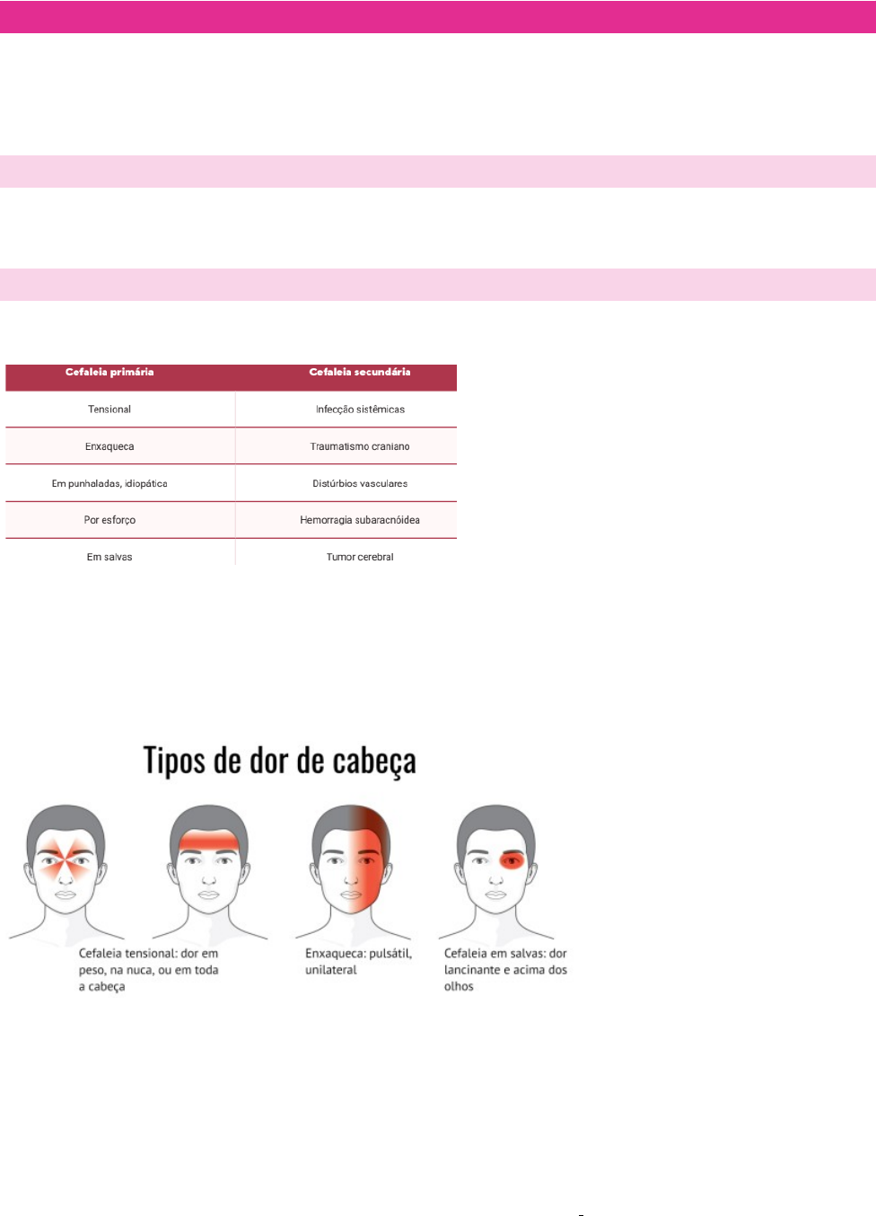 APG 12 – CEFALEIAS OBJETIVOS: 1) Definir a cefaleia 2) Diferenciar os tipos de cefaleia (etiologia, fisiopatologia) 3) Listar os sinais e sintomas dos tipos de cefaleias 4) Descrever o processo investigativo e terapêutico da cefaleia definição de cefaleia A cefaleia, um sintoma muito comum, pode ser secundária a um problema subjacente, mas se trata, mais comumente, de uma causa primária, como enxaqueca, cefaleia tipo tensional, cefaleia em salvas e hemicrania paroxística. CLASSIFICAÇÃO DAS CEFALEIAS As cefaleias podem ser classificadas em primárias e secundárias. O diagnóstico diferencial entre cefaleia primária ou secundária é essencial. A causa da cefaleia secundária habitualmente deve ser investigada por meio de exames subsidiários. · CEFALEIAS PRIMÁRIAS: Cefaleias primárias são as cefaleias que têm o sintoma da dor de cabeça sendo seu principal, sem demais sinais ou sintomas sistêmicos. Não causa lesão estrutural, tende a não ser progressiva ou originar sequelas. 1. ENXAQUECA (OU MIGRÂNEA) Caracteriza-se por crises recorrentes constituídas por até cinco fases (nem sempre estão presentes todas elas). · FISIOPATOLOGIA: Considera-se a enxaqueca uma síndrome dolorosa neurovascular, com alteração do processamento neuronal central (ativação dos núcleos do tronco encefálico, hiperexcitabilidade cortical e depressão cortical disseminada) e comprometimento do sistema trigeminovascular (deflagrando a liberação de neuropeptídeos que produzem inflamação dolorosa nos vasos cranianos e na dura-máter). · MANIFESTAÇÕES CLÍNICAS: A enxaqueca tem dois subtipos principais. A aura é o complexo de sintomas neurológicos que ocorre habitualmente antes da cefaleia. · ENXAQUECA SEM AURA: é uma síndrome clínica caracterizada por cefaleia com características específicas e sintomas associados. · ENXAQUECA COM AURA: é caracterizada, principalmente, pelos sintomas neurológicos focais transitórios que geralmente precedem ou frequentemente acompanham a cefaleia. Alguns doentes experimentam também uma fase premonitória, ocorrendo horas ou dias antes da cefaleia e uma fase de resolução de cefaleia. Os sintomas premonitórios e de resolução incluem hiperatividade, hipoatividade, depressão, desejos por certos alimentos, bocejos repetitivos, fadiga e rigidez e/ou dor da nuca. · Sintomas premonitórios: precedem a cefaleia por horas ou até dias. Nesta fase o paciente pode apresentar irritabilidade, com raciocínio e memorização mais lentos, desânimo e avidez por alguns tipos de alimentos. · Aura: complexo de sintomas neurológicos que se desenvolve gradualmente (ao longo de no mínimo 5 minutos) e dura até 60 minutos. A aura típica é um distúrbio visual constituído por pontos fosfenos, perda ou distorção de um dos hemicampos visuais ou parte deles. Às vezes associam-se parestesia unilateral e/ou disfasia. · Cefaleia: é de forte intensidade, latejante/pulsátil, piorando com as atividades do dia a dia. A duração da fase de dor é de 4 a 72 horas. A dor é unilateral em dois terços das crises, geralmente mudando de lado de uma crise para outra. · Sintomas associados: náuseas e/ou vômitos, foto e fonofobia. · Fase de recuperação: fase de exaustão em que alguns pacientes necessitam de um período de repouso para seu completo restabelecimento Complicações da enxaqueca: · estado migranoso: cefaleia intensa que dura mais que 72 horas, com intervalos livres inferiores a 12 horas, à qual associam-se náuseas e vômitos por horas seguidas, levando a desidratação e as suas consequências, como a necessidade de internação. · infarto migranoso: é um ataque idêntico aos outros episódios, mas os sintomas da aura persistem por mais de 60 minutos e são associados a um infarto demonstrado no exame de neuroimagem. · migrânea crônica: é o aumento da frequência das crises até tornarem-se diárias ou quase diárias (>15 dias por mês com dor por mais de 3 meses). · São fatores de risco para cronificação: fatores emocionais, estresse, doenças psiquiátricas e abuso de analgésicos. Muitos fatores desencadeantes potenciais da enxaqueca foram identificados; incluem os seguintes: · Ingestão de vinho tinto · Omissão de refeições · Estímulos aferentes em excesso (p. ex., luzes brilhantes, odores fortes) · Alterações climáticas · Privação de sono · Estresse · Fatores hormonais, especialmente menstruação · Certos alimentos (os gatilhos alimentares variam de uma pessoa para outra) Traumatismo craniano, dor no pescoço ou disfunção da articulação temporomandibular, algumas vezes, deflagram ou exacerbam a enxaqueca. A flutuação dos níveis de estrógenos constitui um potente fator deflagrador de enxaqueca. Em muitas mulheres, a enxaqueca surge na menarca, ataca gravemente durante a menstruação (enxaqueca menstrual) e piora durante a menopausa. Na maioria das mulheres, ocorre remissão das enxaquecas durante a gestação (mas, às vezes, há exacerbação durante o 1º ou 2º trimestre); elas pioram após o parto, quando os níveis de estrógenos diminuem rapidamente. Contraceptivos orais e outras terapias hormonais ocasionalmente deflagram ou agravam a enxaqueca e têm sido associados ao acidente vascular encefálico em mulheres que apresentam enxaqueca com aura. · DIAGNÓSTICO: É uma cefaleia de forte intensidade, associada a náuseas e/ou vômitos, podendo haver foto e/ou fonofobia, exacerbada por atividades físicas. Caráter latejante/ pulsátil, localização unilateral em dois terços dos casos, mudando de lado de uma crise para outra. Se a duração da crise é maior que 72 horas, estamos diante de: estado migranoso. · TRATAMENTO: Em todos os casos tentar manter o paciente em repouso sob penumbra em ambiente tranquilo e silencioso (leitos de observação). Nos casos em que a dor tem duração inferior a 72 horas: I - administrar antiemético parenteral se vômitos ou uso prévio de medicações: di
