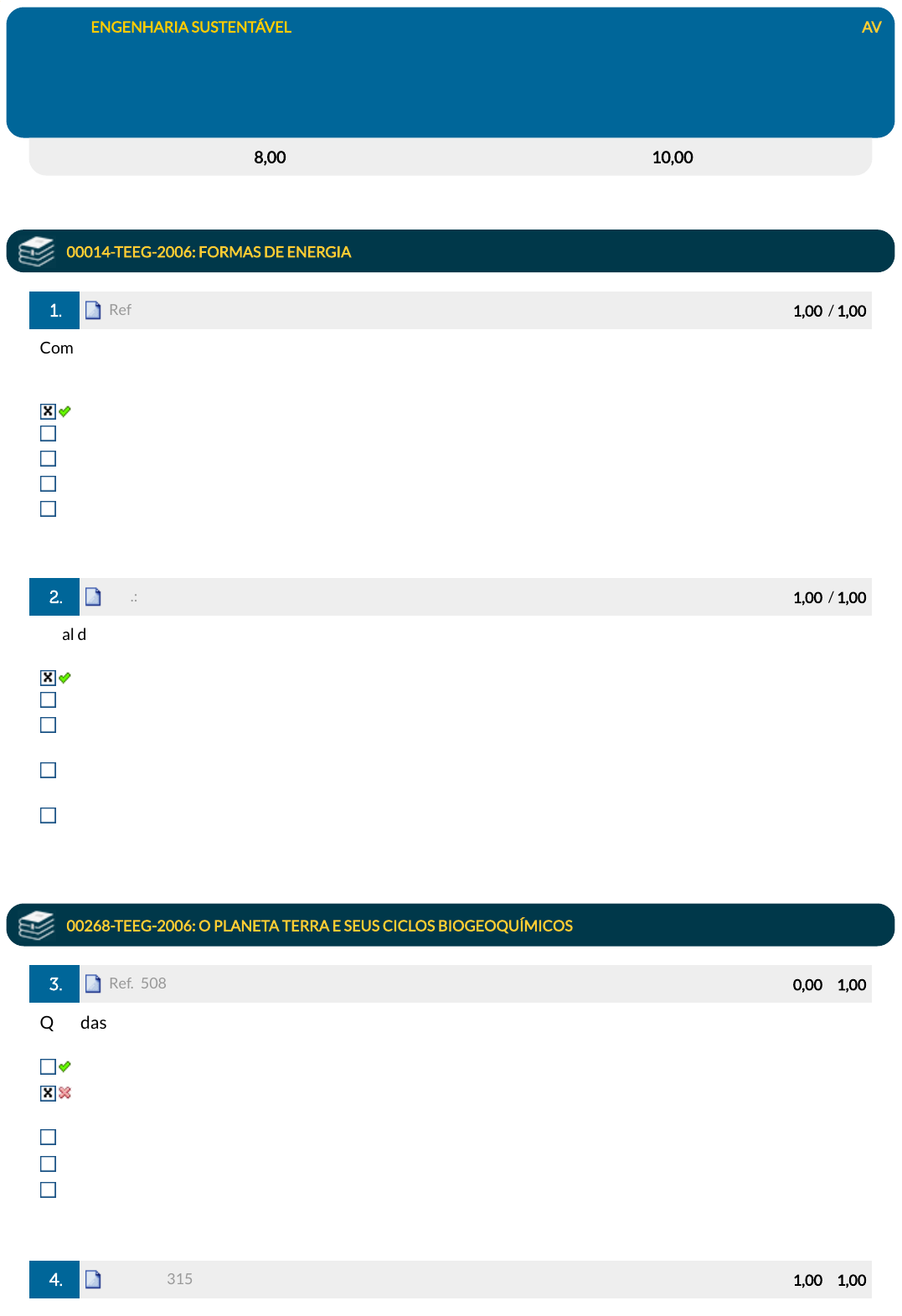 EPS https://simulado.estacio.br/alunos/ 1/4 Disciplina: ENGENHARIA SUSTENTÁVEL AV Avaliação: 8,00 pts Nota SIA: 10,00 pts 00014-TEEG-2006: FORMAS DE ENERGIA 1. Ref.: 5391748 Pontos: 1,00 / 1,00 Com relação ao impacto ambiental associado à instalação de parques eólicos, quais das seguintes a�rmações NÃO está associada a este tipo de energia renovável: Impacto pela emissão de gases ou resíduos. Impacto nas trajetórias de migração de pássaros. Impacto sonoro. Impacto devido à interferência com ondas de Rádio e TV. Todas as alternativas estão incorretas. 2. Ref.: 5391750 Pontos: 1,00 / 1,00 Qual das seguintes a�rmações não faz parte da energia geotérmica: É uma das poucas formas de energias renováveis que é direta ou indiretamente obtidas da radiação solar. Todas as alternativas estão incorretas. Parte da energia de seu aquecimento provém do decaimento radiativos de isótopos de urânio-235, urânio- 238, tório-232 e potássio-40. Seu aproveitamento para geração de eletricidade é igual ao de uma termelétrica, pois o calor produz o vapor de água que movimenta a turbina. A energia é obtida a partir do calor proveniente do interior da terra. 00268-TEEG-2006: O PLANETA TERRA E SEUS CICLOS BIOGEOQUÍMICOS 3. Ref.: 5085015 Pontos: 0,00 / 1,00 Qual das seguintes a�rmações, em relação ao ciclo do carbono, está incorreta? Os heterotró�cos incorporam carbono do meio ambiente através da fotossíntese. O dióxido de carbono da atmosfera é absorvido pelas plantas e convertido em açúcar, pelo processo de fotossíntese. Os animais obtêm carbono alimentando-se de plantas. A decomposição da matéria orgânica libera CO2 na atmosfera. O uso de combustíveis fósseis libera carbono na atmosfera. 4. Ref.: 5093151 Pontos: 1,00 / 1,00 javascript:alert('C%C3%B3digo da quest%C3%A3o: 5391748.'); javascript:alert('C%C3%B3digo da quest%C3%A3o: 5391750.'); javascript:alert('C%C3%B3digo da quest%C3%A3o: 5085015.'); javascript:alert('C%C3%B3digo da quest%C3%A3o: 5093151.'); 15/03/2023 14:59 EPS https://simulado.estacio.br/alunos/ 2/4 Quais processos permitem que os seres vivos incorporem carbono? Alimentos e fotossíntese. Evaporação e alimentação. Respiração e alimentação. Respiração, alimentação e fotossíntese. Fotossíntese e respiração. 00307-TEEG-2006: INTRODUÇÃO A PROJETOS DE ENGENHARIA 5. Ref.: 6109852 Pontos: 1,00 / 1,00 Considere o cronograma de atividades PERT-CPM de uma pequena reforma em um apartamento, onde a duração de cada atividade é indicada em dias, como ilustrado abaixo. Se tudo correr conforme o planejado, qual é a duração da obra? 12 11 16 14 15 6. Ref.: 6110228 Pontos: 1,00 / 1,00 O termo CONSTRUTIBILIDADE, no contexto moderno de projeto, pode ser associado a todas as opções abaixo, exceto: Agrega conhecimento e melhora a qualidade Computação em nuvem Compartilha Modelo 3D e documentação de projeto Melhora o projeto, mas aumenta o custo total Trabalho colaborativo multidisciplinar além dos especialistas 00410-TEEG-2006: ENGENHARIA E DESENVOLVIMENTO 7. Ref.: 5037284 Pontos: 1,00 / 1,00 javascript:alert('C%C3%B3digo da quest%C3%A3o: 6109852.'); javascript:alert('C%C3%B3digo da quest%C3%A3o: 6110228.'); javascript:alert('C%C3%B3digo da quest%C3%A3o: 5037284.'); 15/03/2023 14:59 EPS https://simulado.estacio.br/alunos/ 3/4 Assinale, na lista abaixo, qual das opções não pode ser associada diretamente à inovação tecnológica: Novo produto de uma empresa que já está no mercado. Empreendedorismo; Em oferta no mercado; Novo processo; Novo produto no mercado; 8. Ref.: 5004902 Pontos: 1,00 / 1,00 Qual das opções pode ser associada ao crescimento econômico? Nível de consumo IDH Taxa de desemprego Valor do dólar Produto Interno Bruto 00469-TEEG-2006: DESENVOLVIMENTO SUSTENTÁVEL 9. Ref.: 4961251 Pontos: 0,00 / 1,00 O Planejamento Ambiental de uma atividade econômica é sua organização sistemática a partir de uma realidade preexistente em que se faz necessário diagnosticar a área que receberá as in�uências positivas e negativas dessa atividade, levantar aspectos e impactos ambientais, apontar alternativas criativas para amenizar impactos. Sobre Planejamento Ambiental, julgue os itens abaixo e marque a alternativa correta. I. Em Planejamento Ambiental é necessário levantar dados, interpretar informações e muitas vezes gerar indicadores e índices ambientais sobre determinados espaços geográ�cos que receberão in�uências signi�cativas da atividade econômica a se instalar. Dessa forma, padronizou-se a Bacia Hidrográ�ca como área de planejamento de estudos ambientais, pois se trata de um espaço delimitado naturalmente e que re�ete os impactos das atividades sobre os componentes do meio ambiente. II. A escala espacial é necessária não apenas para delimitar a extensão territorial do dado levantado no planejamento ambiental, mas também para apontar a situação em que aquele dado ocorre no espaço ocupado. Dessa forma, é consenso que escalas maiores possibilitam maiores detalhes da informação e que, escalas menores, apesar de menor custo, generalizam e agrupam informações. III. O tempo é outro fator importante em Planejamento Ambiental, pois o meio é dinâmico e por isso é necessário situar o presente, o passado e o futuro do espaço diagnosticado. Desta forma, a interpretação dos fenômenos do meio através do tempo deve responder o que, onde, quando, quanto e por que estão ocorrendo mudanças, tanto para o meio natural como para o meio que tiveram suas características alteradas pelo homem. Nenhuma está correta. I, II e III estão corretas. I e III estão corretas. II e III estão corretas. javascript:alert('C%C3%B3digo da quest%C3%A3o: 5004902.'); javascript:alert('C%C3%B3digo da quest%C3%A3o: 4961251.'); 15/03/2023 14:59 EPS https://simulado.estacio.br/alunos/ 4/4 I e II estão corretas. 10. Ref.: 5007274 Pontos: 1,00 / 1,00 A Produção Mais Limpa (P + L) consiste