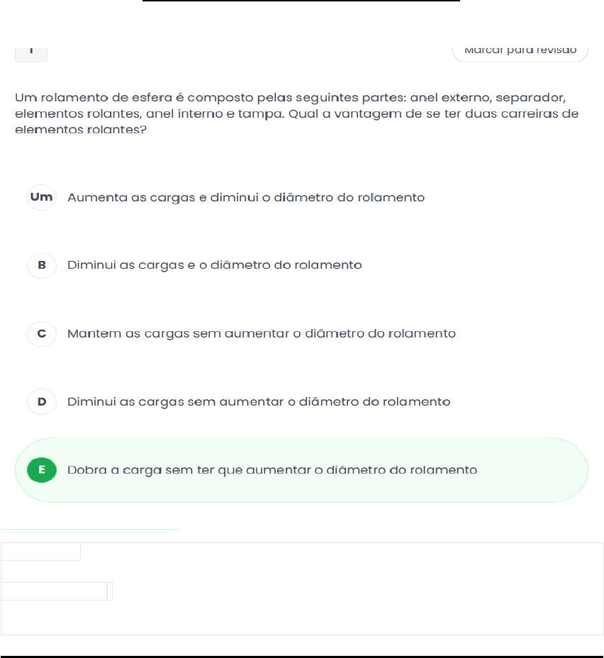 EXERCÍCIOS DE DESENHO MECÂNICO... Gabarito: Dobra a carga sem ter que aumentar o diâmetro do rolamento Justificativa: Um rolamento pode ter uma ou duas carreiras de elementos rolantes (dobra a capacidade de carga sem ter que aumentar o diâmetro do rolamento). Gabarito: Estriados Justificativa: Eixos-árvore estriados também são utilizados para evitar rotação relativa em barras de direção de automóveis, alavancas de máquinas etc. Gabarito: Virabrequim Justificativa: Existem árvores retilíneas, árvores de manivelas (típicas nos motores de combustão interna) e árvores flexíveis formadas por cabo de aço girando envolto em uma capa, também flexível como o caso do cabo do velocímetro de um carro ou do odômetro (contador de giro) do motor do trator. Um exemplo típico é o virabrequim. 4 – QUE TIPO DE ENGRENAGEM É USADA PARA TRANSFORMAR MOVIMENTO GIRATORIO EM LONGITUDINAL??? Gabarito: Cremalheira Justificativa: A cremalheira pode ser considerada como uma coroa dentada com diâmetro primitivo infinitamente grande. É usada para transformar movimento giratório em longitudinal. 5 – QUAL O MATERIAL PROPRIO PARA A FABRICAÇÃO DE EIXOS FERROVIARIOS??? Gabarito: Aço – manganês Justificativa: Os eixos e árvores precisam de: Resistência mecânica: resistência à tração de 500 a 600N/mm²; Resistência ao desgaste: tratamento térmico (têmpera ou cementação). Com isso, podem ser usados: Aço ABNT 1045 com dureza de 40 a 50 RC após revenimento. Aços liga com 28-35RC; Aços para cementação que devem atingir 56 à 62RC. Por isso, são mais adequados para a fabricação de elementos de transmissão: · eixos com pequena solicitação mecânica são fabricados em aço ao carbono; · eixo-árvore de máquinas e automóveis são fabricados em aço-níquel; · eixo-árvore para altas rotações ou para bombas e turbinas são fabricados em aço cromo-níquel; · eixo para vagões são fabricados em aço-manganês. Gabarito: Por ser silenciosa Justificativa: Os dentes são dispostos transversalmente em forma de hélice em relação ao eixo. É usada em transmissão fixa de rotações elevadas por ser silenciosa devido a seus dentes estarem em componente axial de força que deve ser compensada pelo mancal ou rolamento. Gabarito: Rígido com flanges | Justificativa: O acoplamento rígido com flanges parafusadas é utilizado quando se pretende conectar árvores, e é próprio para transmissão de grande potência em baixa velocidade. Gabarito: Menor ruído Justificativa: Muitas engrenagens sem-fim têm uma propriedade interessante que nenhuma outra engrenagem tem: o eixo gira a engrenagem facilmente, mas a engrenagem não consegue girar o eixo. Isso se deve ao fato de que o ângulo do eixo é tão pequeno que quando a engrenagem tenta girá-lo, o atrito entre a engrenagem e o eixo não deixa que ele saia do lugar. Essa característica é útil para máquinas como transportadores, nos quais a função de travamento pode agir como um freio para a esteira quando o motor não estiver funcionando. Vantagens · Menor ruído; · Grande redução. Desvantagens · Elevado desgaste; · Maior custo; · Menor potência. Gabarito: Chavetas Justificativa: Os eixos cônicos devem ser ajustados a um componente que possua um furo de encaixe cônico. A parte que se ajusta tem um formato cônico e é firmemente presa por uma porca. Uma chaveta é utilizada para evitar a rotação relativa. SANDRO SALOMÃO.