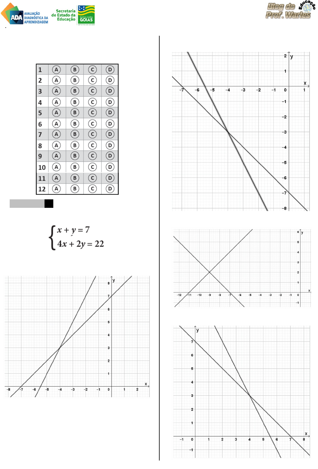 3ª Prova Diagnóstica – 2019 – 9º Ano SEDUCE-GO – Matemática ESCOLA: ________________________ Prof.:____________________________ Nome: ___________________________ 1 Questão 1 –––––––––––––––––––––––––––◊ Observe o sistema de equações do primeiro grau, a seguir: Assinale a opção correspondente ao gráfico que representa esse sistema de equações. (A) (B) (C) (D) 2 Questão 2 –––––––––––––––––––––––––––◊ Considere as figuras a seguir que apresentam pares de triângulos semelhantes. É semelhante pelo caso ângulo ângulo (AA) o par de triângulos apresentados nas figuras (A) I e II. (B) II e III. (C) II e IV. (D) I e III. 3 Questão 3 –––––––––––––––––––––––––––◊ Observe o gráfico: Qual dos sistemas a seguir representa esse gráfico? 4 Questão 4 –––––––––––––––––––––––––––◊ Observe a imagem a seguir: O polígono ABCD foi ampliado 4 vezes, obtendo o polígono A’B’C’D’. Após a ampliação, o polígono A’B’C’D’ foi ampliado vezes. As dimensões desse novo polígono, após a ampliação, comparado com o polígono ABCD, são (A) cinco vezes e meia maior. (B) sete vezes e meia maior. (C) quatorze vezes maior. (D) quatorze vezes menor. 5 Questão 5 –––––––––––––––––––––––––––◊ Observe a circunferência a seguir: Os segmentos , e são, consecutivamente, (A) diâmetro, raio e corda. (B) raio, diâmetro e corda. (C) corda, diâmetro e raio. (D) raio, corda e diâmetro. 6 Questão 6 –––––––––––––––––––––––––––◊ Observe as figuras a seguir: Os dois triângulos semelhantes entre si são (A) triângulo 2 e triângulo 3. (B) triângulo 1 e triângulo 2. (C) triângulo 1 e triângulo 4. (D) triângulo 3 e triângulo 4. 7 Questão 7 –––––––––––––––––––––––––––◊ As fórmulas representadas no quadro a seguir são utilizadas no cálculo do volume de alguns sólidos geométricos. Os sólidos geométricos que possuem volume correspondente a essas fórmulas são (A) cubo, paralelepípedo e cilindro. (B) esfera, cone e cilindro. (C) pirâmide, cilindro e cone. (D) cilindro, cone e prisma de base triangular. 8 Questão 8 –––––––––––––––––––––––––––◊ A figura a seguir representa uma mesa redonda e sobre ela uma toalha quadrada. A borda da mesa corresponde (A) ao diâmetro da circunferência. (B) ao comprimento da circunferência. (C) ao raio da circunferência. (D) à área da circunferência. 9 Questão 9 –––––––––––––––––––––––––––◊ Uma das condições para dois triângulos serem semelhantes é o caso “LAL Lado Ângulo Lado”. Dentre as opções a seguir, assinale a que representa o caso de semelhança LAL. 10 Questão 10 –––––––––––––––––––––––––◊ Uma piscina tem a forma indicada na figura a seguir, com r = 2 m. A medida do contorno dessa piscina é aproximadamente igual a Adote π = 3,14. (A) 10,28 m. (B) 14,28 m. (C) 16,56 m. (D) 20,56 m. 11 Questão 11 –––––––––––––––––––––––––◊ A figura, a seguir, ilustra uma caixa d’água. O volume dessa caixa d’água, em m³, é igual a (A) 3,15. (B) 8,20. (C) 15,75. (D) 32,80. 12 Questão 12 –––––––––––––––––––––––––◊ Uma coleção é composta por 15 pares de sapatos, em que 8 pares são pretos e 7 pares são brancos. Decide- se retirar aleatoriamente dois pés desses sapatos. Qual a probabilidade de que esses sapatos sejam da cor branca? (A) (B) (C) (D)