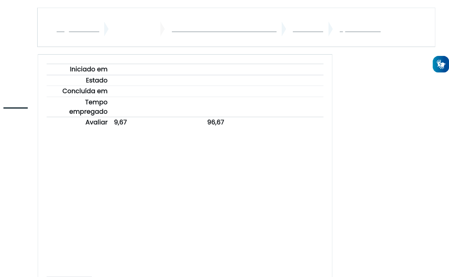 Página inicial Meus cursos DocEaD_Instrumentos e critérios Atividade Questionário Iniciado em terça-feira, 21 mar 2023, 08:53 Estado Finalizada Concluída em terça-feira, 21 mar 2023, 09:00 Tempo empregado 7 minutos 5 segundos Avaliar 9,67 de um máximo de 10,00(96,67%) https://cursos.poca.ufscar.br/ https://cursos.poca.ufscar.br/course/view.php?id=56§ion=0 https://cursos.poca.ufscar.br/course/view.php?id=56§ion=3 https://cursos.poca.ufscar.br/mod/quiz/view.php?id=2364 javascript:void(0); https://cursos.poca.ufscar.br/user/index.php?id=56 https://cursos.poca.ufscar.br/theme/moove/certificates.php?id=56 https://cursos.poca.ufscar.br/admin/tool/lp/coursecompetencies.php?courseid=56 https://cursos.poca.ufscar.br/grade/report/index.php?id=56 https://cursos.poca.ufscar.br/ https://cursos.poca.ufscar.br/my/ https://cursos.poca.ufscar.br/calendar/view.php?view=month&course=56 javascript:void(0); https://cursos.poca.ufscar.br/user/files.php Questão 1 Correto Atingiu 1,00 de 1,00 Associe cada instrumento de avaliação ao seu conceito, conforme estudado no material: O objetivo principal é registrar o processo de aprendizagem e por isso há necessidade de se propor aos alunos momentos em que são chamados a fazer sínteses de suas aprendizagens. Consiste na formulação de indicadores de avaliação para que o próprio estudante analise criticamente sua aprendizagem no decorrer de um período. É uma atividade assíncrona e é utilizada para incentivar a reflexão do estudante sobre a sua aprendizagem a cada unidade temática da disciplina de um determinado conteúdo. Por meio dessa atividade é possível criar uma comunidade virtual de aprendizagem onde os estudantes colaboram uns com os outros na construção de conhecimentos sobre um determinado tema. Portfólio Autoavaliação Diário de processo Fórum de discussão javascript:void(0); https://cursos.poca.ufscar.br/user/index.php?id=56 https://cursos.poca.ufscar.br/theme/moove/certificates.php?id=56 https://cursos.poca.ufscar.br/admin/tool/lp/coursecompetencies.php?courseid=56 https://cursos.poca.ufscar.br/grade/report/index.php?id=56 https://cursos.poca.ufscar.br/ https://cursos.poca.ufscar.br/my/ https://cursos.poca.ufscar.br/calendar/view.php?view=month&course=56 javascript:void(0); https://cursos.poca.ufscar.br/user/files.php Questão 2 Correto Atingiu 1,00 de 1,00 Esta avaliação pode ter caráter prático e, desde o início, é importante indicar que se trata de uma avaliação criteriosa que realmente deve contribuir para a aprendizagem de cada integrante da equipe. Trabalhos em grupo Sua resposta está correta. Vimos no material de estudos que os instrumentos de avaliação são os recursos utilizados para se obter as informações que subsidiam a avaliação e que diferentes estratégias podem ser utilizadas. Além disso, é necessário que o professor analise os dados coletados pelos diferentes instrumentos para que este processo realmente se torne uma avaliação e não apenas mais um instrumento para gerar nota. Analise esta afirmação e marque Verdadeiro ou Falso. Escolha uma opção: Verdadeiro Falso Muito bem! Essa definição é feita por Suhr (2008) logo no início da Unidade 1. javascript:void(0); https://cursos.poca.ufscar.br/user/index.php?id=56 https://cursos.poca.ufscar.br/theme/moove/certificates.php?id=56 https://cursos.poca.ufscar.br/admin/tool/lp/coursecompetencies.php?courseid=56 https://cursos.poca.ufscar.br/grade/report/index.php?id=56 https://cursos.poca.ufscar.br/ https://cursos.poca.ufscar.br/my/ https://cursos.poca.ufscar.br/calendar/view.php?view=month&course=56 javascript:void(0); https://cursos.poca.ufscar.br/user/files.php Questão 3 Correto Atingiu 1,00 de 1,00 A avaliação por rubrica e o método guia de avaliação são opções de avaliação avançada no Moodle. Vimos que podem ser utilizados para a Tarefa, permitem um maior detalhamento de critérios de avaliação, bem como inserção de valores para cada um deles. Além do uso na Tarefa, em qual outra atividade do Moodle é possível configurar a rubrica e guia de avaliação? Escolha uma opção: Glossário Fórum Muito bem! Por meio da avaliação global o professor avalia a participação do aluno no fórum de forma bastante detalhada com atribuição de pontos para cada critério. Além disso, esta configuração também permite a inserção de comentários. Wiki Base de dados Diário Sua resposta está correta. javascript:void(0); https://cursos.poca.ufscar.br/user/index.php?id=56 https://cursos.poca.ufscar.br/theme/moove/certificates.php?id=56 https://cursos.poca.ufscar.br/admin/tool/lp/coursecompetencies.php?courseid=56 https://cursos.poca.ufscar.br/grade/report/index.php?id=56 https://cursos.poca.ufscar.br/ https://cursos.poca.ufscar.br/my/ https://cursos.poca.ufscar.br/calendar/view.php?view=month&course=56 javascript:void(0); https://cursos.poca.ufscar.br/user/files.php Questão 4 Correto Atingiu 1,00 de 1,00 A avaliação por rubricas vem sendo bastante utilizada, especialmente no ambiente virtual de aprendizagem Moodle. Assinale a alternativa correta: Escolha uma opção: Este método de avaliação permite a inserção de critérios e escala de valores, porém não permite o detalhamento dos itens dos critérios. A avaliação por rubrica é um método de avaliação simples, disponível na atividade Laboratório de avaliação. Consiste em um método de avaliação avançado cujo objetivo é a criação de critérios, isto é, aspectos/atributos da tarefa a ser realizada pelo estudante. É possível criar vários critérios, bem como inserir uma escala de pontuação para cada um deles. Parabéns! Resposta correta! A avaliação por rubricas ainda permite detalhar os critérios dando um excelente parâmetro para os tutores elaborarem seus feedback sobre as atividades propostas e reunir elementos para indicar ao professor em que medida o estudante atingiu os objetivos da atividade, seus avanços em relação ao conteúdo tr