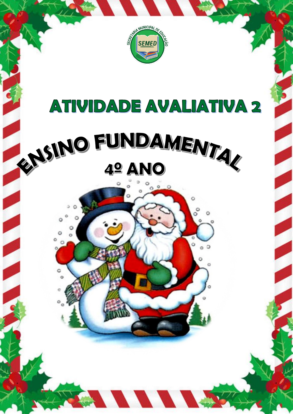 1 Prefeitura Municipal de Vigia de Nazaré SECRETARIA MUNICIPAL DE EDUCAÇÃO- SEMED ___________________________________________________________________________________ ___________________________________________________________________________________ Secretaria Municipal de Educação Vigia de Nazaré/PA Dezembro/2020 2 ATIVIDADE AVALIATIVA DE LÍNGUA PORTUGUESA (EF15LP02) - Questão 1 – Leia a tirinha e responda: a) Quais são os personagens da tirinha? _______________________________________ b) O que a Mônica está fazendo? _____________________________________________ c) Em qual época do ano, as pessoas costumam fazer o que a Mônica está fazendo? E pra quê? ________________________________________________________________________ d) A Mônica mudou de ideia. Por qual motivo ou razão ela fez isso? ________________________________________________________________________ ________________________________________________________________________ e) O que você achou da atitude da Mônica? Você faria o mesmo? Por quê? ________________________________________________________________________ ________________________________________________________________________ (EF15LP01) – Questão 2 – Leia os textos com atenção e responda: ESCOLA:___________________________________________________ DIRETOR (A): ________________________________________________ PROFESSOR (A): ___________________________________________ ANO/SÉRIE: 4º ANO TURNO:________ DATA: _____/______/______ ALUNO (A): __________________________________________________ 3 a) Em qual dos quadros acima está o trecho de uma carta? ( A ) No quadro 1 ( B ) No quadro 2 ( C ) No quadro 3 ( D ) No quadro 4 b) Qual o objetivo, do texto do primeiro quadro? ________________________________________________________________________ ________________________________________________________________________ c) Qual o gênero textual utilizado no quadro 4? ( A ) Receita ( B ) Contos de Fada ( C ) Entrevista ( D ) Piada d) O que significa “Bjs”, em uma mensagem via celular (Whatzapp)? ______________________________________________________ TEXTO DE APOIO – Questão 3 -Tipos de frases. Frase afirmativa: afirmação de alguma coisa. Ex.: O rei é rico. Frase negativa: negam alguma coisa. Ex.: O rei não é rico. Frase interrogativa: quando se faz uma pergunta. Ex.: Por que, o rei ficou rico? Frase exclamativa: indica admiração, surpresa, espanto. Ex.: Que rei lindo! 4 (EF04LP05) – Questão 3 – Leia com atenção e complete: (A) Este ponto é de _____________________________________ Nessa frase ele indica uma ____________________________ Portanto, essa frase é _________________________________ (B) Este é o ponto _________________________________ Nessa frase ele indica uma ___________________________ Portanto, essa frase é ________________________________ (C) Este é o ponto de _______________________________ Nessa frase ele indica a uma _______________________ Portanto, essa frase é ______________________________ (EF04LP07) – Questão 4 – Escolha a palavra do quadro que podem completar as frases a seguir. - Que legal! A estrela brilha no céu. Cadê o ovo que estava aqui? TEXTO DE APOIO – Questão 4 -Artigo definido e indefinido. Como você já viu, os artigos acompanham os substantivos. Eles indicam que os substantivos são definidos, determinados (conhecidos), ou indefinidos, indeterminados (desconhecidos ou qualquer um). Os artigos definidos são: o, a, os, as. Ex.: Eu comprei o carro. Os artigos indefinidos são: um, uma, uns, umas. Ex.: Eu comprei um carro. . O - A – OS – AS - UM - UMA – UNS - UMAS 5 Uma pequena cigarra Que estava com a __________________ Uma bota amarela Que caiu da _______________________ Um gato molhado Que subiu no _______________________ Um lindo passarinho Que abandonou seu __________________ a) Para conhecer ________________ pontos turísticos de Belém, não é preciso fazer ____________viagem longa. b) ______________ roteiro turístico apresenta______ informações mais importantes sobre cada atração. (EF35LP27) – Questão 5 – Complete o poema “Procura-se”, de acordo com os desenhos ao lado de cada estrofe, fazendo a rima. ATIVIDADE AVALIATIVA DE MATEMÁTICA ATIVIDADE AVALIATIVA DE MATEMÁTICA Texto de apoio, questão 6: Perímetro é a soma das medidas dos lados de uma figura. Observe o exemplo abaixo: 6 (EF04MA20) – Questão 6 – Calcule o perímetro das figuras abaixo. _ P = 30 + 25 + 10 + 25 = _______________ P = 16 + 16 + 16 + 16 + 16 = ________ (EF04MA19) – Questão 7 – Simetria – Observe a figura abaixo e complete a outra metade, depois pinte bem bonito. (EF04MA09) – Questão 8 – Escreva a fração que corresponde a parte colorida de cada figura? _____________ __________________ _______________ Texto de apoio, questão 7: Uma figura é simétrica quando dobramos uma figura pela reta de simetria e as duas partes coincidem., tanto na horizontal, como na vertical. 7 (EF04MA27) – Questão 9 – Após uma visita ao Museu Emílio Goeldi, a professora Nalva Pinto, da Escola Prof.ª Andréa Ataíde Monteiro, localizada no Bairro da Castanheira, fez uma pesquisa para saber o animal preferido dos alunos das duas salas do 4º ano. Todos os alunos dessas salas foram ao Museu Emílio Goeldi e participaram da pesquisa. Cada aluno escolheu apenas um animal. a) Qual foi o animal mais escolhido pelos alunos do 4º ano? ________________________ b) Quantos alunos escolheram o peixe-boi? ____________________________________ c) Quantos alunos no total, participaram da pesquisa? _____________________________ (EF04MA07) – Questão 10 – A prefeitura de Vigia, comprou 268 mudas de árvores frutíferas para dividir igualmente entre 2 praças da cidade. Vitória ficou encarregada de fazer a distribuição. Para saber quantas mudas seriam plantadas em cada parque, ela dividiu 268 por 2. Então resolva a operação abaixo, para saber quantas mudas de árvores foram plantadas em ca
