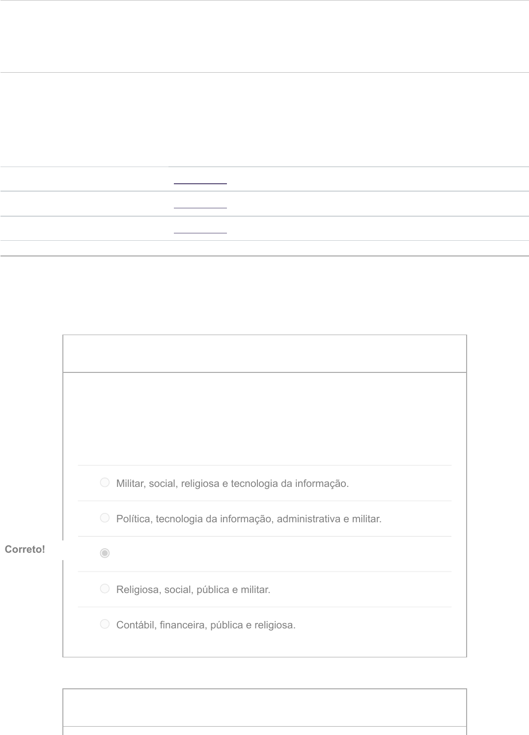 29/01/2023 10:12 Questões Objetivas - Unidade 1: GXPUB (04º) Introdução à Gestão Pública (40) https://unifamma.instructure.com/courses/19018/quizzes/41028 1/3 Questões Objetivas - Unidade 1 Entrega 20 fev em 23:59 Pontos 10 Perguntas 4 Disponível até 20 fev em 23:59 Limite de tempo 120 Minutos Tentativas permitidas 2 Histórico de tentativas Tentativa Tempo Pontuação MANTIDO Tentativa 2 2 minutos 10 de 10 MAIS RECENTE Tentativa 2 2 minutos 10 de 10 Tentativa 1 4 minutos 10 de 10 Pontuação desta tentativa: 10 de 10 Enviado 29 jan em 10:12 Esta tentativa levou 2 minutos. 2,5 / 2,5 ptsPergunta 1 De acordo com Boisier et al. (1995), a sociedade civil é composta por um conjunto de organizações sociais cujas finalidades não devem ser atuantes em que áreas? Militar, social, religiosa e tecnologia da informação. Política, tecnologia da informação, administrativa e militar. Militar, religiosa, mercado e política. Correto!Correto! Religiosa, social, pública e militar. Contábil, financeira, pública e religiosa. 2,5 / 2,5 ptsPergunta 2 https://unifamma.instructure.com/courses/19018/quizzes/41028/history?version=2 https://unifamma.instructure.com/courses/19018/quizzes/41028/history?version=2 https://unifamma.instructure.com/courses/19018/quizzes/41028/history?version=1 29/01/2023 10:12 Questões Objetivas - Unidade 1: GXPUB (04º) Introdução à Gestão Pública (40) https://unifamma.instructure.com/courses/19018/quizzes/41028 2/3 Assinale a alternativa que apresenta as três dimensões necessárias para se entender o conceito de Estado: Sociológica, política e constitucional. Correto!Correto! Ecológica, administrativa e coletiva. Ecológica, política e sociológica. Constitucional, individual e administrativa. Psicológica, individual e coletiva. 2,5 / 2,5 ptsPergunta 3 O poder discricionário está relacionado, segundo Nohara (2016), a escolha da Administração em tomar decisão a respeito das soluções para resolver determinado problema. Mas para tomar essa decisão, a Administração Pública deve atender a dois critérios. Sabendo disso, assinale a alternativa que apresenta o nome desses dois critérios: De conveniência e oportunidade. Correto!Correto! De lealdade e segurança. De publicidade e conveniência. De oportunidade e lealdade. De segurança e publicidade. 2,5 / 2,5 ptsPergunta 4 Sabendo que a disciplina de Administração Pública envolve o conhecimento em mais de uma área, assinale a alternativa que 29/01/2023 10:12 Questões Objetivas - Unidade 1: GXPUB (04º) Introdução à Gestão Pública (40) https://unifamma.instructure.com/courses/19018/quizzes/41028 3/3 corresponde a todas as áreas do conhecimento necessárias para a compreensão da disciplina de Administração Pública: I. Administração. II. Direito. III. Sociologia. IV. Ciências Políticas. I, II e IV. II e III I, III e IV. Somente I I, II, III e IV. Correto!Correto! Pontuação do teste: 10 de 10