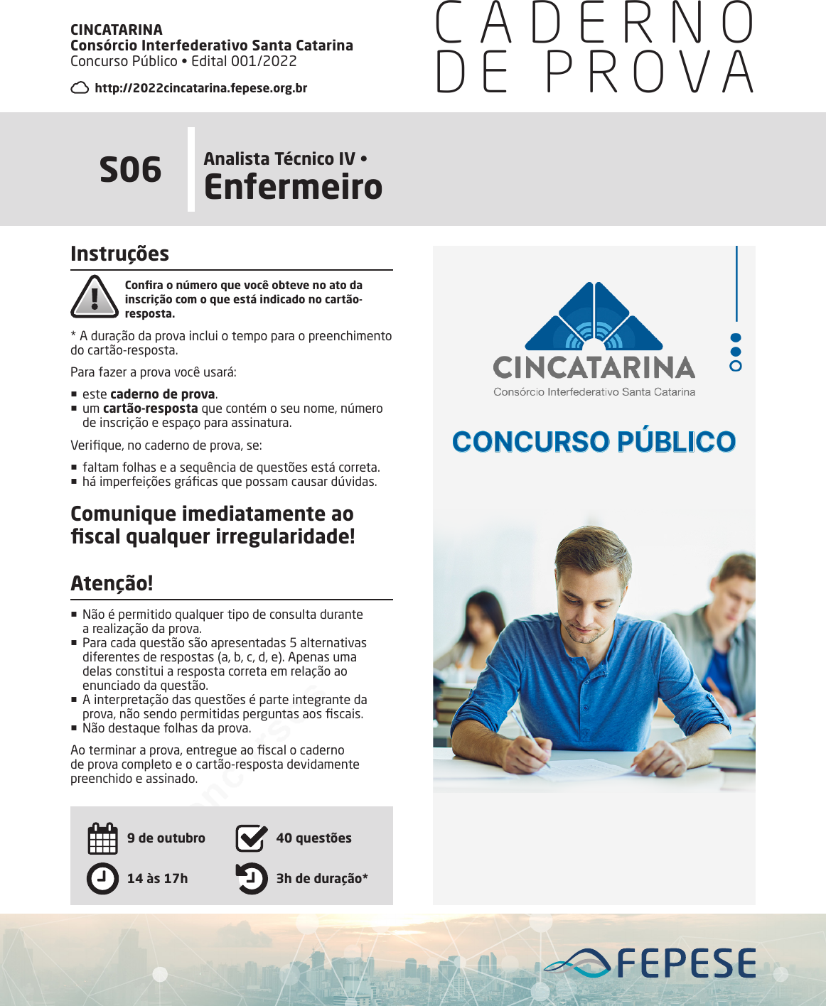 pcimarkpci MjgwNDowNTZjOmE1YjQ6YWUwMDo5ZDc1OjcwMjk6ZjYyYjphYTg2:V2VkLCAyMiBNYXIgMjAyMyAxMjo1MjozNiAtMDMwMA== www.pciconcursos.com.br C A D E R N O D E P R O V A CINCATARINA Consórcio Interfederativo Santa Catarina Concurso Público • Edital 001/2022 http://2022cincatarina.fepese.org.br S06 Analista Técnico IV • Enfermeiro Instruções Confira o número que você obteve no ato da inscrição com o que está indicado no cartão-resposta. * A duração da prova inclui o tempo para o preenchimento do cartão-resposta. Para fazer a prova você usará: � este caderno de prova. � um cartão-resposta que contém o seu nome, número de inscrição e espaço para assinatura. Verifique, no caderno de prova, se: � faltam folhas e a sequência de questões está correta. � há imperfeições gráficas que possam causar dúvidas. Comunique imediatamente ao fiscal qualquer irregularidade! Atenção! � Não é permitido qualquer tipo de consulta durante a realização da prova. � Para cada questão são apresentadas 5 alternativas diferentes de respostas (a, b, c, d, e). Apenas uma delas constitui a resposta correta em relação ao enunciado da questão. � A interpretação das questões é parte integrante da prova, não sendo permitidas perguntas aos fiscais. � Não destaque folhas da prova. Ao terminar a prova, entregue ao fiscal o caderno de prova completo e o cartão-resposta devidamente preenchido e assinado. 9 de outubro 14 às 17h 40 questões 3h de duração* pcimarkpci MjgwNDowNTZjOmE1YjQ6YWUwMDo5ZDc1OjcwMjk6ZjYyYjphYTg2:V2VkLCAyMiBNYXIgMjAyMyAxMjo1MjozNyAtMDMwMA== www.pciconcursos.com.br . pcimarkpci MjgwNDowNTZjOmE1YjQ6YWUwMDo5ZDc1OjcwMjk6ZjYyYjphYTg2:V2VkLCAyMiBNYXIgMjAyMyAxMjo1MjozNyAtMDMwMA== www.pciconcursos.com.br Página 3 CINCATARINA Consórcio Interfederativo Santa Catarina • Concurso Público • Edital 001/2022 S06 Analista Técnico IV • Enfermeiro Língua Portuguesa 10 questões Leia o texto. Revogue-se Relacionamentos se constroem ao longo dos anos de sua duração: os dois parceiros vão tramar consciente ou inconscientemente a teia que os vai envolver ou sepa- rar, o casulo onde vão abrigar ou sufocar seus filhos. Amor não deveria ser prisão ou dever, mas cresci- mento e libertação. Porém se gostamos de alguma coisa ou de alguém, queremos que esteja sempre conosco. Perda e separação significam sofrimento, mas não o fim da vida nem o fim de todos os afetos. Certa vez me entregaram um bilhete que dizia: “Se você ama alguém, deixe-o livre.” Poucas afirmações são tão difíceis de cumprir, poucas contêm tamanha sabedoria em relação aos amores, todos os amores: filhos, amigos, amantes. Amor é risco, viver é risco. Pois permitir, até querer que o outro cresça ao nosso lado, pode significar que crescerá afastando-se de nós. Mas - essa é a força e a beleza do desafio de uma vida a dois - o outro, crescendo, pode-se abrir mais para nós, que participaremos dessa expansão. Instaura-se uma instigante parceria amorosa, na qual o tempo não servirá para desgaste, mas para construção. É um processo de refinamento da cumplicidade que brilha em algumas relações mesmo depois de muitos anos, muitas perdas, e muitos difíceis recomeços - desde que haja sobre o que reconstruir. […] Lya Luft 1. Assinale a alternativa cujo antônimo da palavra sublinhada está correto. a. SQUARE Amor é risco. (ameaça) b. SQUARE Vão abrigar ou sufocar seus filhos. (reprimir) c. Check-square Instaura-se uma instigante parceria amorosa. (entediante) d. SQUARE É um processo de refinamento da cumplicidade. (apuramento) e. SQUARE Vão construir o casulo para abrigar os filhos. (invólucro) 2. Analise as afirmativas abaixo de acordo com o texto. 1. O tema do texto são os relacionamentos amo- rosos entre casais. 2. A autora usa situações antagônicas para falar de amor. 3. O texto nos faz refletir sobre a forma como amamos quem está conosco. 4. O título do texto leva a acreditar que as rela- ções amorosas duradouras são aquelas que revogam o sofrimento. 5. O título do texto dirige-se ao leitor para acon- selhar ou sugerir, buscando persuadi-lo a rever ou mesmo anular suas atitudes em rela- ção a quem ama. Assinale a alternativa que indica todas as afirmativas corretas. a. SQUARE São corretas apenas as afirmativas 1 e 2. b. SQUARE São corretas apenas as afirmativas 3 e 4. c. SQUARE São corretas apenas as afirmativas 4 e 5. d. SQUARE São corretas apenas as afirmativas 1, 2 e 3. e. Check-square São corretas apenas as afirmativas 2, 3 e 5. 3. Assinale a alternativa que mostra corretamente o ponto de vista defendido pela autora. a. SQUARE Em um relacionamento, os amantes devem crescer lado a lado necessariamente. b. SQUARE Amar é um processo de depauperação da rela- ção para uma necessária reconstrução. c. SQUARE Uma instigante parceria amorosa arrefece o crescimento de ambos os parceiros. d. Check-square A pessoa que ama deve permitir ao outro fazer suas próprias escolhas e viver em liberdade, ainda que essa atitude gere inseguranças. e. SQUARE Quando se ama, quer-se ter o ser amado sem- pre por perto, pois perda e separação signifi- cam sofrimento e fim da relação. 4. Assinale a alternativa que mostra corretamente dentro dos parênteses o objeto direto presente na frase. a. Check-square A teia que os vai envolver. (os) b. SQUARE Se você ama alguém, deixe-o livre. (livre) c. SQUARE Poucas afirmações são tão difíceis de cumprir. (difíceis) d. SQUARE Perda e separação significam sofrimento. (perda e separação) e. SQUARE É um processo de refinamento da cumplicidade. (processo) pcimarkpci MjgwNDowNTZjOmE1YjQ6YWUwMDo5ZDc1OjcwMjk6ZjYyYjphYTg2:V2VkLCAyMiBNYXIgMjAyMyAxMjo1MjozNyAtMDMwMA== www.pciconcursos.com.br Página 4 CINCATARINA Consórcio Interfederativo Santa Catarina • Concurso Público • Edital 001/2022 S06 Analista Técnico IV • Enfermeiro 5. Assinale a alternativa correta tendo por base o texto. a. SQUARE O 
