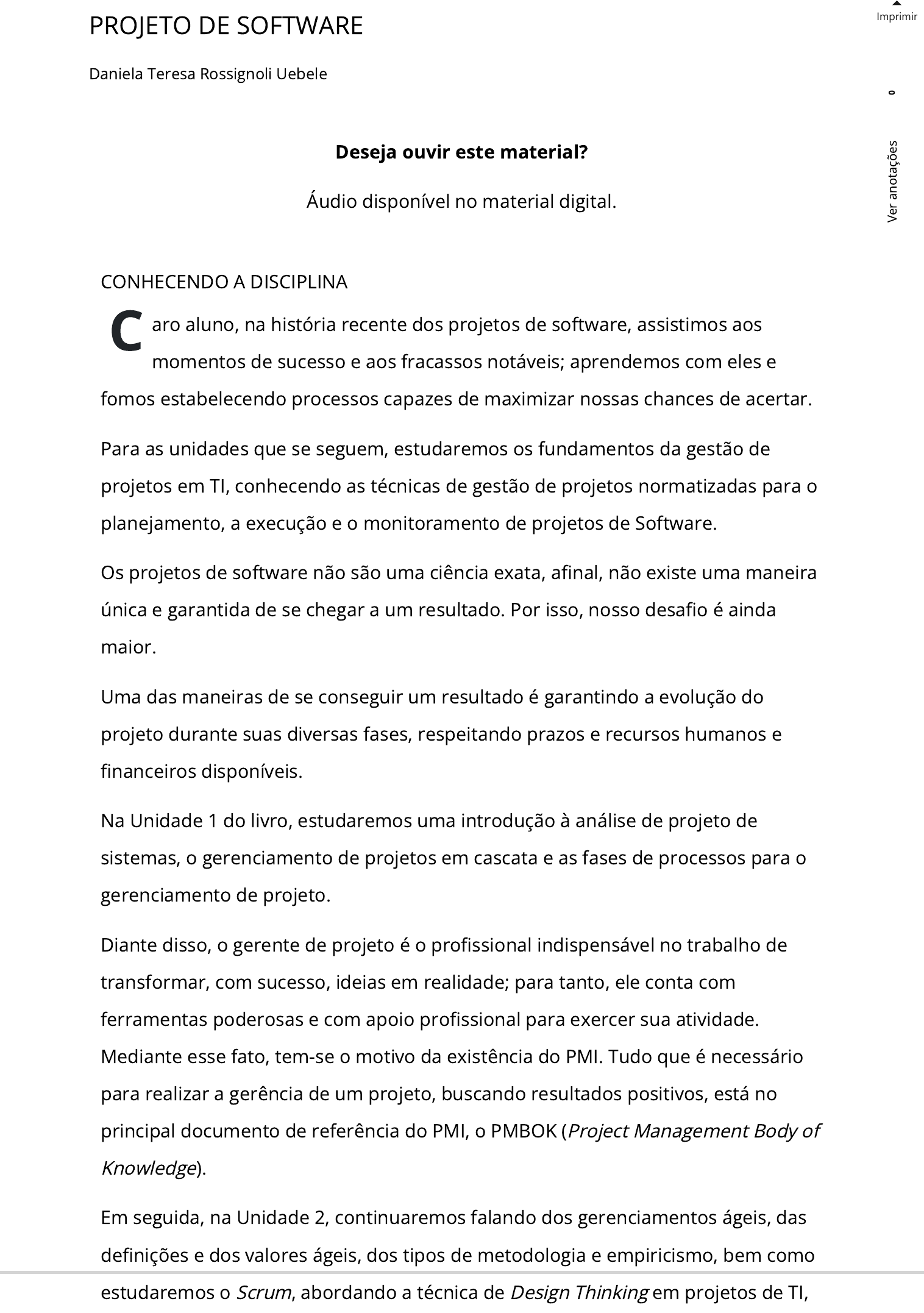 PROJETO DE SOFTWARE Daniela Teresa Rossignoli Uebele Imprimir C CONHECENDO A DISCIPLINA aro aluno, na história recente dos projetos de software, assistimos aos momentos de sucesso e aos fracassos notáveis; aprendemos com eles e fomos estabelecendo processos capazes de maximizar nossas chances de acertar. Para as unidades que se seguem, estudaremos os fundamentos da gestão de projetos em TI, conhecendo as técnicas de gestão de projetos normatizadas para o planejamento, a execução e o monitoramento de projetos de Software. Os projetos de software não são uma ciência exata, a�nal, não existe uma maneira única e garantida de se chegar a um resultado. Por isso, nosso desa�o é ainda maior. Uma das maneiras de se conseguir um resultado é garantindo a evolução do projeto durante suas diversas fases, respeitando prazos e recursos humanos e �nanceiros disponíveis. Na Unidade 1 do livro, estudaremos uma introdução à análise de projeto de sistemas, o gerenciamento de projetos em cascata e as fases de processos para o gerenciamento de projeto. Diante disso, o gerente de projeto é o pro�ssional indispensável no trabalho de transformar, com sucesso, ideias em realidade; para tanto, ele conta com ferramentas poderosas e com apoio pro�ssional para exercer sua atividade. Mediante esse fato, tem-se o motivo da existência do PMI. Tudo que é necessário para realizar a gerência de um projeto, buscando resultados positivos, está no principal documento de referência do PMI, o PMBOK (Project Management Body of Knowledge). Em seguida, na Unidade 2, continuaremos falando dos gerenciamentos ágeis, das de�nições e dos valores ágeis, dos tipos de metodologia e empiricismo, bem como estudaremos o Scrum, abordando a técnica de Design Thinking em projetos de TI, Deseja ouvir este material? Áudio disponível no material digital. 0 V e r a n o ta çõ e s o Minimum Viable Product (MVP) e os conceitos de pivotagem. Já na Unidade 3, prosseguiremos discutindo a respeito das gestões de risco e de qualidade, bem como das questões referentes à documentação. Finalizaremos, então, com a Unidade 4, tratando do modelo sequencial e ágil, veri�cando as diferenças e semelhanças na concepção e no desenvolvimento de projetos, conhecendo ferramentas viáveis tanto para a gestão do modelo ágil como sequencial e os seus respectivos ciclos de vida. E se tratando de ciclo de vida, você conhecerá importantes atividades da manutenção, do planejamento de releases e do pós- entrega. Os desa�os de adquirir e dominar tanto conhecimento são realmente vastos, mas, com certeza, a prática lhe oferecerá todo o conhecimento que precisa para evoluir e ter sucesso pro�ssional. PERSISTA! 0 V e r a n o ta çõ e s NÃO PODE FALTAR INTRODUÇÃO À ANÁLISE E AO PROJETO DE SISTEMAS Daniela Teresa Rossignoli Uebele Imprimir CONVITE AO ESTUDO No atual universo corporativo, é fundamental que os pro�ssionais da área de Tecnologia da Informação (TI) tenham conhecimento das inúmeras técnicas de gestão de projetos (preferencialmente as normatizadas) e se aprofundem nas que foram criadas ou adaptadas para o setor de tecnologia da informação e comunicação. Com as grandes transformações digitais, é um dos setores que têm apresentado maior crescimento e um desenvolvimento constante, exigindo o aprendizado de novas habilidades e aptidões e de pro�ssionais com per�l inovador para cargos que sequer existiam até então. As organizações no Brasil vivem uma era de reconstrução. O mercado passa por momentos de instabilidade, e é devido a essa variação que a área de maior destaque é a de TI. Investir em tecnologia não é voltar-se apenas para a inovação, Fonte: Shutterstock. Deseja ouvir este material? Áudio disponível no material digital. 0 V e r a n o ta çõ e s mas é uma forma de sobrevivência e de se tornar ou permanecer competitivo (ZIMMERMANN, 2001). Para contribuir com o planejamento e a execução de forma mais assertiva, independentemente do prazo, apresentando uma visão ampla para a condução do negócio, importante para a gestão de um projeto com conceitos bem fundamentados, é preciso conhecer e compreender modelos de projetos de software, podendo ser este o diferencial para obtenção ou não de sucesso no projeto. Na primeira seção desta unidade, você estudará a introdução à análise e ao projeto de sistemas, em que serão abordados os conceitos de projetos, a importância da gestão de projetos, a formação da equipe (participantes, matriz de responsabilidades e plano de comunicação), os problemas na gestão, os con�itos, as leis de Murphy e os mitos relacionados ao gerenciamento de projetos de software. Na segunda seção, partiremos para o gerenciamento de projetos em cascata, em que os assuntos estarão voltados para os Fundamentos de Processos para gestão de projetos de TI, o Ciclo de Vida do projeto, o Gerenciamento de Projetos e os Fundamentos de ITIL, COBIT, PMI e PMBOK. Na terceira e última seção, você vai estudar as fases dos processos para gerenciamento de projetos, sendo eles: o processo de iniciação, o processo de planejamento, o processo de execução, os processos de monitoramento, o controle e o encerramento. Pois bem! Acredito que você terá a oportunidade de aprender e aplicar os conhecimentos aqui apresentados. Sucesso e bons estudos! PRATICAR PARA APRENDER Todo início de uma nova fase vem recheado de desa�os, de incertezas, de expectativas e, com certeza, de muito aprendizado a ser adquirido. Diante dessa situação, vem a pergunta-chave: seguir ou recuar? A�nal, você adentrará em um mundo desconhecido, e isso, com certeza, é um tanto assustador. Você já se pegou pensando em desistir? Ficou analisando as inúmeras possibilidades do sim e do não? Pensou em todas as pessoas que poderiam lhe ajudar? 0 V e r a n o ta çõ e s Com isso, podemos perceber que é natural de nós, seres humanos, fazer uma a