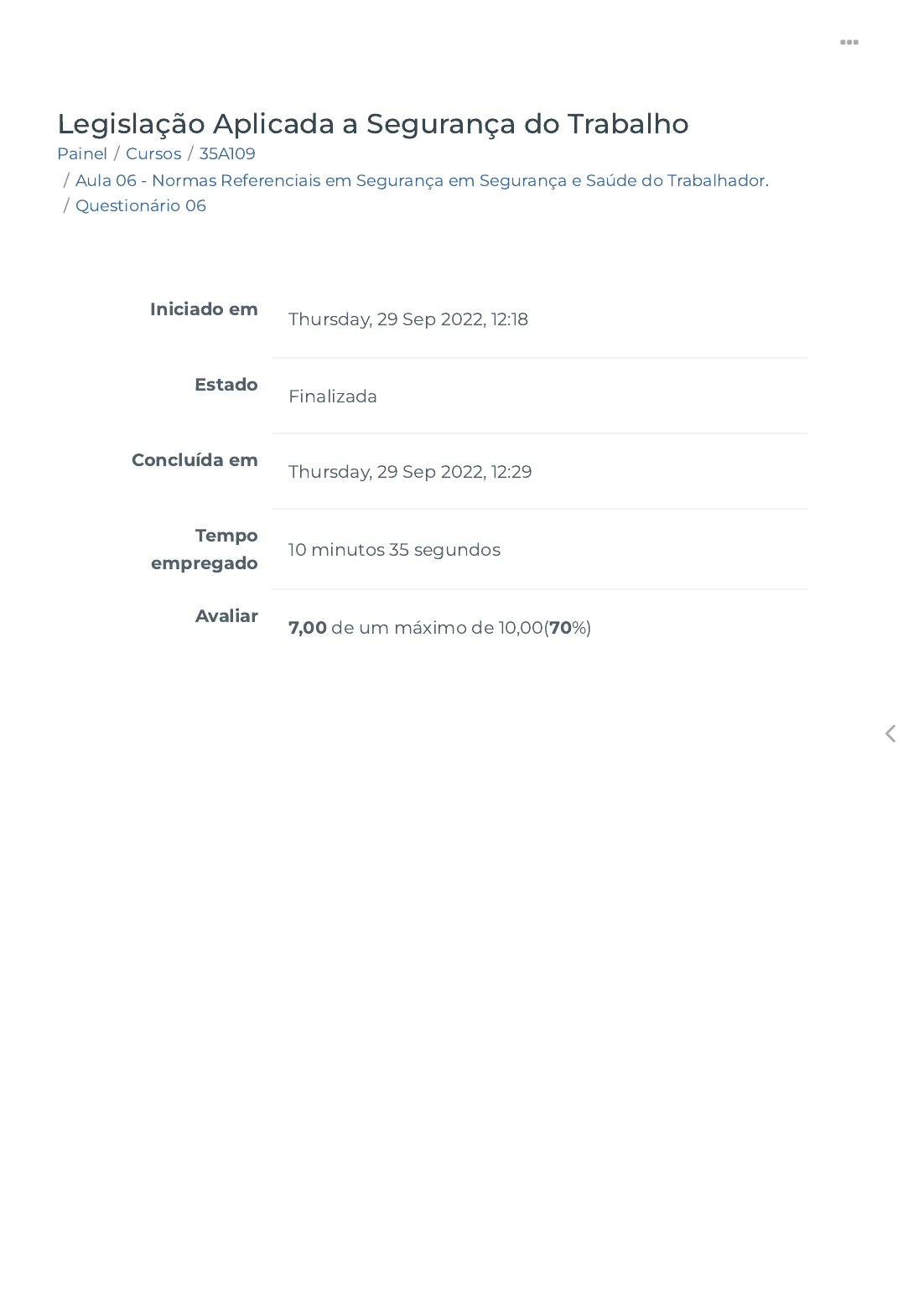 22/03/2023, 14:43 Questionário 06 https://ava.politecnicabr.com.br/mod/quiz/review.php?attempt=3702239 1/4 Painel / Cursos / 35A109 / Aula 06 - Normas Referenciais em Segurança em Segurança e Saúde do Trabalhador. / Questionário 06 Legislação Aplicada a Segurança do Trabalho Iniciado em Thursday, 29 Sep 2022, 12:18 Estado Finalizada Concluída em Thursday, 29 Sep 2022, 12:29 Tempo empregado 10 minutos 35 segundos Avaliar 7,00 de um máximo de 10,00(70%) https://ava.politecnicabr.com.br/my/ https://ava.politecnicabr.com.br/course/index.php https://ava.politecnicabr.com.br/course/view.php?id=1031 https://ava.politecnicabr.com.br/course/view.php?id=1031#section-8 https://ava.politecnicabr.com.br/mod/quiz/view.php?id=25813 https://ava.politecnicabr.com.br/ 22/03/2023, 14:43 Questionário 06 https://ava.politecnicabr.com.br/mod/quiz/review.php?attempt=3702239 2/4 Questão 1 Correto Atingiu 4,00 de 4,00 Julgue a a�rmativa a seguir: “Na ausência de limites de tolerâncias previstos na NR-15 e seus anexos, devem ser utilizados como referência para a adoção de medidas de prevenção aqueles previstos pela American Conference of Governmental Industrial Higyenists – ACGIH.” Escolha uma opção: Questão 2 Correto Atingiu 3,00 de 3,00 As Normas Regulamentadoras são emitidas pelo OIT - Organização Internacional do Trabalho. Escolha uma opção: Verdadeiro Falso Verdadeiro Falso https://ava.politecnicabr.com.br/ 22/03/2023, 14:43 Questionário 06 https://ava.politecnicabr.com.br/mod/quiz/review.php?attempt=3702239 3/4 Questão 3 Incorreto Atingiu 0,00 de 3,00 Acerca da OIT (Organização Internacional do Trabalho) julgue os itens a seguir. I- A OIT nº 29 trata da discriminação (emprego e ocupação). II- A OIT nº 87 trata da liberdade sindical e proteção do direito de sindicalização. III – A OIT nº 100 trata da igualdade de remuneração. IV – A OIT nº 105 trata da inspeção do trabalho. Escolha uma opção: a. Apenas os Itens I e IV estão corretos b. Apenas o item I está incorreto. c. Todos os itens estão corretos. d. Apenas o II item está correto. e. Apenas os itens II e III estão corretos. Entre em Contato https://www.politecnicabr.com.br 0800 084 2627 0800 084 2627 Links Úteis Dicas da nossa Diretora Acadêmica Planner de Estudos Declaração de Matrícula Orientações do AVA Abertura de Ticket https://www.politecnicabr.com.br/ https://soundcloud.com/user-501638417/sets/escola-politecnica-brasileira https://storage.googleapis.com/sirius-pubstore/semestre_plannerdeestudo%20poli.pdf https://storage.googleapis.com/sirius-pubstore/declaracao_matricula.pdf https://storage.googleapis.com/sirius-pubstore/orientacoes_ava.pdf https://storage.googleapis.com/sirius-pubstore/abertura_ticket.pdf https://ava.politecnicabr.com.br/ 22/03/2023, 14:43 Questionário 06 https://ava.politecnicabr.com.br/mod/quiz/review.php?attempt=3702239 4/4 © 2022 - Escola Politécnica Brasileira Fale com o Tutor Cronograma de Estudos Manual de Estágio Manual de Competência Siga-nos nas redes sociais https://ava.politecnicabr.com.br/mod/quiz/0 https://storage.googleapis.com/sirius-pubstore/fale_com_tutor.pdf https://storage.googleapis.com/sirius-pubstore/cronograma_estudos.pdf https://storage.googleapis.com/sirius-pubstore/manual_estagio.pdf https://storage.googleapis.com/sirius-pubstore/manual_competencia.pdf https://www.facebook.com/politecnicabr https://www.instagram.com/politecnicabr_oficial https://ava.politecnicabr.com.br/