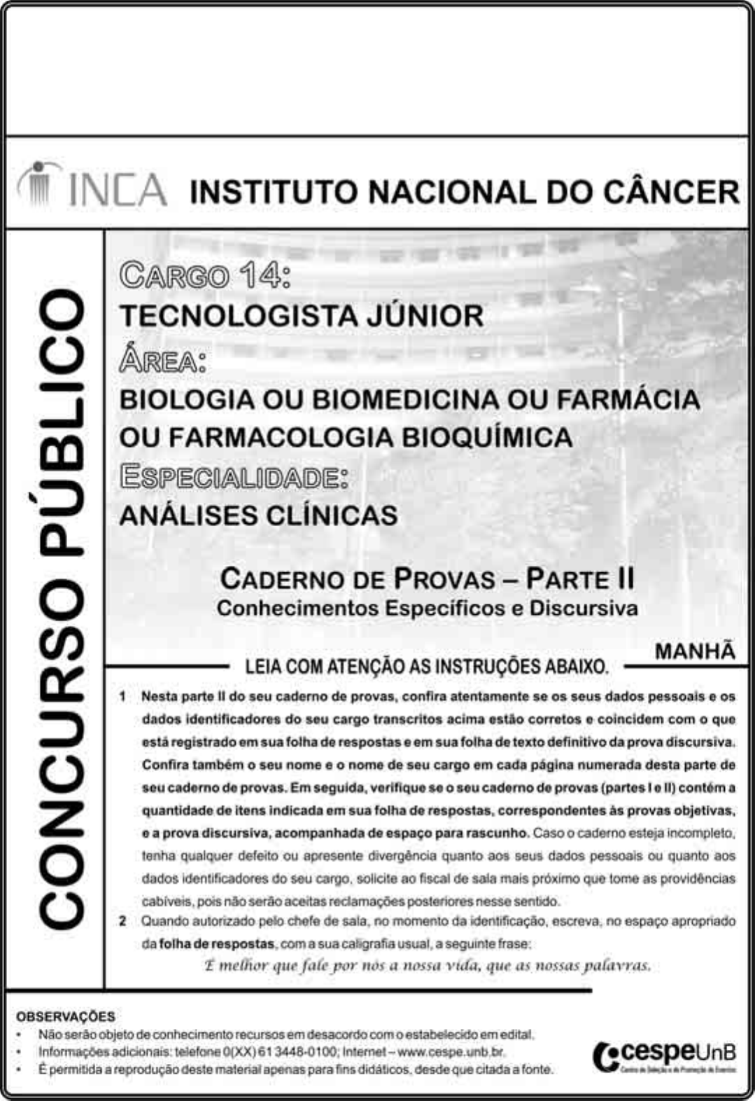 UnB/CESPE – INCA Cargo 14: Tecnologista Júnior – Área: Biologia ou Biomedicina ou Farmácia ou Farmacologia Bioquímica – Especialidade: Análises Clínicas – 1 – CONHECIMENTOS ESPECÍFICOS Considerando os aspectos de preparo, coleta e transporte de amostras referentes a análises clínicas, julgue os itens a seguir. 41 O profissional que realizar a coleta de sangue por punção venosa deve permanecer constantemente com luvas, colocando-as antes de iniciar a coleta do primeiro paciente e retirando-as somente após coletar o sangue do último paciente daquele período de trabalho. 42 A coleta de sangue venoso por punção pode ser realizada com o paciente deitado ou sentado, sendo importante que ele esteja em uma dessas posições há pelo menos 10 minutos. 43 No caso de coleta de sangue venoso utilizando-se garroteamento, o primeiro tubo de 5 mL coletado geralmente apresenta menor concentração de proteínas do que o quarto tubo. 44 Para dosagens séricas de cálcio, potássio e lactato o paciente não deve realizar movimentos de abrir e fechar a mão depois de colocado o garrote. 45 A coleta de sangue capilar por punção cutânea é corretamente realizada com lanceta, que deve penetrar 12 mm em região tibial anterior. 46 O sangue para testes de diagnóstico molecular com base na técnica de PCR deve ser coletado em tubo contendo heparina. 47 Alguns compostos comumente usados para preservar amostras de urina coletadas durante 24 horas são etanol, isopropanol e acetato de etila. 48 Amostra colhida por amniocentese para dosagem espectrofotométrica de bilirrubinas é corretamente transportada para o laboratório em frasco escuro ou revestido por papel alumínio. Acerca de diversos aspectos relacionados aos equipamentos utilizados em laboratórios de análises clínicas, julgue os itens a seguir. 49 A espectrofotometria de absorção atômica é utilizada para se determinar a absorção de átomos de um elemento específico por uma amostra. 50 O método de correção de Zeeman é aplicado à espectrofotometria ultravioleta, com detectores de matriz de diodos. 51 A fluorimetria é o método utilizado para se detectar a luz emitida por um determinado analito após sua excitação por luz em um comprimento de onda diferente do emitido. 52 A determinação de zinco protoporfirina em sangue total pode ser realizada utilizando-se um fluorímetro. 53 O termo amperometria refere-se a um processo eletroquímico em que a corrente é medida sob uma diferença de potencial controlada entre os eletrodos de referência e de amostra em uma célula eletroquímica. Com relação a aspectos de sistemas de informação laboratorial, julgue os itens de 54 a 58. 54 Uma forma eficiente e segura de armazenar cópias de segurança dos dados laboratoriais é o uso de equipamentos conhecidos como memória cache. 55 O sistema operacional Linux é considerado um tipo de software. 56 A ligação de cada instrumento de análises clínicas a um roteador ligado a um computador (via cabo USB) e cada um desses computadores ligados a um servidor constitui uma estrutura adequada e eficiente para uma rede laboratorial. 57 O registro de dados do paciente, a captação manual ou direta de resultados de equipamentos e o processamento de alguns testes estatísticos e de controle de qualidade são funções comumente encontradas nos sistemas de informação laboratorial. 58 Ao se planejar a segurança de um sistema de informação laboratorial é suficiente que se tomem precauções para evitar a perda de dados. Considere os seguintes resultados obtidos de um método para dosagem de uma determinada substância e avaliado ao se utilizar como analito uma solução conhecida, contendo exatamente 20 mg/mL da substância a ser dosada, submetida seis vezes à mesma dosagem, sendo três em cada dia, após limpeza do sistema; primeiro dia: 30,01 mg/mL; 30,02 mg/mL e 29,99 mg/mL em cada análise; segundo dia: 27,02 mg/mL; 27,03 mg/mL e 27,04 mg/mL. Com base nos dados descritos, julgue os itens que se seguem. 59 O método testado apresenta mais exatidão que precisão. 60 O método testado apresenta maior repetibilidade que reprodutibilidade. 61 Os dados relatados não são suficientes para se avaliar a linearidade do método. 62 O intervalo de medição analítica para o referido método varia de 27,02 mg/mL a 30,02 mg/mL. A respeito de métodos estatísticos e de controle de qualidade em laboratório, julgue os itens subsequentes. 63 A sensibilidade analítica geralmente é diferente do limite de detecção de um método. 64 O termo rejeições falsas refere-se aos resultados que foram rejeitados pelo sistema de controle de qualidade apesar de não apresentarem nenhum erro. Considere uma situação em que um indivíduo apresenta uma anomalia genética que reduz a atividade da enzima glicuronil transferase para cerca de 10% de sua atividade normal. Em relação aos achados laboratoriais esperados nessa situação, julgue os itens a seguir. 65 Espera-se encontrar níveis de bilirrubina conjugada elevados. 66 A exposição desse indivíduo à luz pode melhorar seu quadro clínico por converter alguns compostos à sua forma isomérica cis, mais hidrossolúvel. 67 A anomalia em questão tem como consequência o impedimento da entrada de bilirrubina nos hepatócitos. Considere uma situação em que um paciente apresenta os seguintes resultados de exames laboratoriais: a absorvância em 578nm do plasma após reação com ortocresolftaleína-complexona mostrou-se reduzida, 20% abaixo do menor valor da faixa considerada normal e a concentração de albumina sérica também se mostrou diminuída, apresentando-se com metade do valor normal. Com base nesses dados, julgue os itens que se seguem. 68 Trata-se de um caso de hipertireoidismo. 69 A aplicação dos devidos fatores de correção aos resultados obtidos revela severa hipocalcemia consequente a hipomagnesemia. 70 As dosagens de fosfatase alcalina óssea e osteocalcina são exames