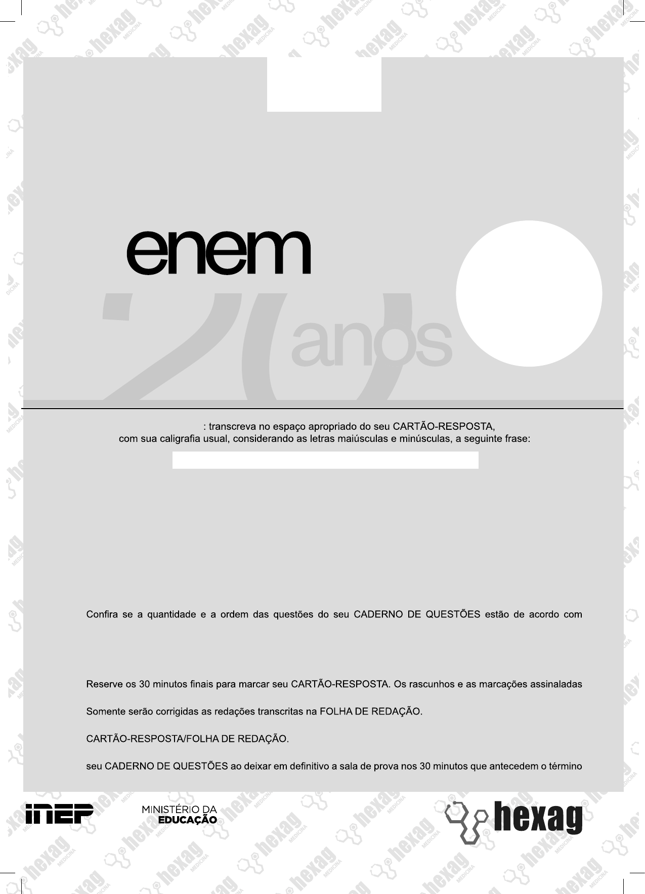 LEIA ATENTAMENTE AS INSTRUÇÕES SEGUINTES: 1. Este CADERNO DE QUESTÕES contém 90 questões numeradas de 01 a 90 e a Proposta de Redação, dispostas da seguinte maneira: a) questões de número 01 a 45, relativas à área de Linguagens, Códigos e suas Tecnologias; b) Proposta de Redação; c) questões de número 46 a 90, relativas à área de Ciências Humanas e suas Tecnologias. ATENÇÃO: as questões de 01 a 05 são relativas à língua estrangeira. Você deverá responder apenas às questões relativas à língua estrangeira (inglês ou espanhol) escolhida no ato de sua inscrição. 2. as instruções anteriores. Caso o caderno esteja incompleto, tenha defeito ou apresente qualquer divergência, comunique ao aplicador da sala para que ele tome as providências cabíveis. 3. Para cada uma das questões objetivas, são apresentadas 5 opções. Apenas uma responde corretamente à questão. 4. O tempo disponível para estas provas é de cinco horas e trinta minutos. 5. no CADERNO DE QUESTÕES não serão considerados na avaliação. 6. 7. Quando terminar as provas, acene para chamar o aplicador e entregue este CADERNO DE QUESTÕES e o 8. Você poderá deixar o local de prova somente após decorrida uma hora do início da aplicação e poderá levar das provas. EXAME NACIONAL DO ENSINO MÉDIO PROVA DE LINGUAGENS, CÓDIGOS E SUAS TECNOLOGIAS E REDAÇÃO PROVA DE CIÊNCIAS HUMANAS E SUAS TECNOLOGIAS 1º DIA CADERNO 1 A minha voz ainda ecoa versos perplexos. ATENÇÃO 29/09/2019 VESTIBULAR MEDICINA 3 LC - 1º dia LINGUAGENS, CÓDIGOS E SUAS TECNOLOGIAS Questões de 01 a 45 Questões de 01 a 05 (opção Inglês) 9 QUESTÃO 01 De acordo com o texto, é correto dizer que A a namorada de Jon é uma professora querida e expe- riente. B Jon não considera sua namorada inteligente. C Garfield aprova a ideia dela. D Jon nunca chegou a vestir Garfield. E de acordo com Garfield, a experiência ensina. QUESTÃO 02 Forgotten language Once I spoke the language of the flowers, Once I understood each word the caterpillar said, Once I smiled in secret at the gossip of the starlings, And shared a conversation with the housefly in my bed. Once I heard and answered all the questions of the crickets, And joined the crying of each falling dying flake of snow, Once I spoke the language of the flowers... How did it go? How did it go? Shel Silverstein <www.poemhunter.com/p/m/poem.asp? poet=13168&poem=177079>. Acesso em: 29 ago. 2006. Vocabulário: caterpillar: lagarta starling: tipo de pássaro europeu cricket: grilo O narrador A pensa que deveria tirar mais proveito da linguagem da natureza. B poderia falar uma nova língua, que agora está espalha- da por todo o mundo. C tem saudades de sua terra natal, onde pessoas têm tempo para falar com as plantas. D arrepende-se do tempo que costumava gastar conver- sando com animais e plantas. E possuía uma relação com a natureza, porém, isso se perdeu com o tempo. QUESTÃO 03 It's a miracle Tourists traveling to Israel to mark a certain 2,000th birthday will be able to celebrate in New Testament style. In September, the National Parks Authority is planning to open a $4.5 million submerged, crescent-shaped bridge in the Sea of Galilee. On it, as many as 80 pilgrims at a time will be able to walk on water – or at least wade in two inches of it. Bubbles rising at the edges of the 12-foot-wide transparent platform will be the only markers preventing pilgrims from taking a plunge. Is the structure sacrilegious? The Roman Catholic Church says no. “It will not improve faith, hope and love,” – says Pietro Sambi, the pope's ambassador to Jerusalem. “But from the touristic point of view, it could be just a nice idea.” Newsweek, March 99. O objetivo do texto é A anunciar uma nova atração turística. B oferecer pacotes de viagem para celebrar o novo milênio. C elogiar o plano da National Parks Authority. D fazer uma crítica pelo dinheiro gasto pela National Parks Authority. E incentivar a fé, a esperança e o amor. QUESTÃO 04 Everyday conversational narratives of personal experience might be regarded as the country cousins of more well- wrought narratives. The work of archaeologist Nicholas Toth revolutionized the understanding of Stone Age tools. Prior to Toth’s studies, the received perspective was that early hominids chipped a cobble in such a way that it could be used as a pick or a hand ax. Researchers considered the splintered flakes as waste products and examined them for information about techniques used to shape the stone core tool. While others were analyzing the morphological shapes and cognitive correlates of the chipped cores, Toth, in a radical turnabout, discovered that the flakes were the primary tools and that the large stone was an incidental by-product, possibly a secondary tool. The flakes turned out to be “extremely effective cutting tools” for animals, wood, hides, and other work. We posit that, like stone flakes, mundane conversational narratives of personal experience constitute the prototype of narrative activity rather than the flawed by-product of more artful and planned narrative discourse. OCHS, E. & CAPPS, L. (2001) Living Narrative – creating lives in everyday storytelling. Harvard University Press, England, p. 3. 4 LC - 1º dia 9 Glossary: Chip – pequena peça de algo Cobble – pedra de calçamento; paralelepípedo Well-wrought – decorado De acordo com o texto, Nicholas Toth A descobriu uma nova maneira de trabalhar rochas, de modo produtivo. B mudou a visão que existia sobre as ferramentas feitas de pedra. C criou novas possibilidades para a elaboração de textos sobre a Idade da Pedra. D chegou a uma importante conclusão sobre narrativas bem elaboradas. E propôs que textos orais se originam de textos escritos bem elaborados. QUESTÃO 05 1,000 Mira stars The first detailed study of variable stars in a galaxy outside our Local Group has turned up more than 1,000 luminous red variables in Centaurus A, a giant