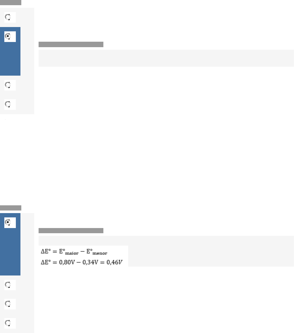 Questão 1/10 - Química Geral O Carvão é um combustível amplamente usado na indústria, principalmente siderúrgica, cuja composição quase que exclusiva é de Carbono (C) sendo obtido por mineração, quando é o carvão mineral oriundo de processos geológicos, ou do processo de carbonização de madeira, normalmente Pinho ou Eucalipto. Sobre os tipos de carvão, temos que: Nota: 10.0 A O carvão mineral representa aproximadamente 75% do carvão usado em siderúrgicas. B O carvão vegetal tem em sua obtenção um valor positivo no Crédito de Carbono. Você assinalou essa alternativa (B) Você acertou! ALTERNATIVA CORRETA (Conforme Aula 6, Tema 2) C O carvão mineral é um subproduto do petróleo. D O carvão vegetal é composto cerca de 50% em massa de Carvão (C), 6% de Hidrogênio (H) e 44% de Oxigênio (O) Questão 2/10 - Química Geral Em uma pilha galvânica, um eletrodo é cobre imerso em solução de Cu+2 1,0M e o outro é prata imerso em solução de Ag+1 1,0 M. Dados os potenciais-padrão de redução a 25°C para: Cu+2 + 2e →→ Cu° Eo = 0,34 V Ag+1 + 1e →→ Ag° Eo = 0,80 V O potencial padrão da célula para esta pilha é: Nota: 10.0 A 0,46 V Você assinalou essa alternativa (A) Você acertou! B 1,26 V C 1,94 V D 0,16 V Questão 3/10 - Química Geral Um estudo da empresa norte-americana CCTechnologies avaliou que de 1% a 5% do Produto Interno Bruto (PIB) dos países industrializados são consumidos pela corrosão. Medidas preventivas e preditivas de manutenção contra a corrosão podem levar a uma diminuição deste valor consumido em até 25%. Para medidas preventivas é importante que o engenheiro responsável esteja atento à identificação dos tipos de corrosão e tenha noções de como pode preveni-las ou mesmo corrigir as condições que possam estar levando ao processo de corrosão identificado. Dentro desse enfoque temos o tipo de corrosão mais comum, normalmente de baixa penetração e que só afeta as propriedades de uma forma mais significativa, em um tempo próximo ao da vida útil do equipamento ou instalação industrial. Que tipo de corrosão é esse? Nota: 10.0 A Corrosão Superficial ou Uniforme. Você assinalou essa alternativa (A) Você acertou! ALTERNATIVA CORRETA (Conforme Aula 6, Tema 1, Item 1.2.1) B Corrosão por Placas. C Corrosão Alveolar. D Corrosão por Pite. Questão 4/10 - Química Geral A reação de oxirredução, também conhecida como reação redox, é na verdade uma interação entre duas reações concomitantes e dependentes uma da outra, que são a reação de oxidação e a reação de redução. A reação de oxidação é aquela na qual um elemento perde elétrons, adquirindo carga positiva se transformando em um cátion. A reação de redução é aquela na qual um elemento recebe elétrons, adquirindo carga negativa e se transformando em um ânion. Um elemento só oxida por que há outro elemento reduzindo e só reduz porque há outro elemento oxidando. Portanto, na reação de oxirredução envolvendo a produção de ferrugem abaixo: Nota: 10.0 A O Ferro reduz e é agente oxidante do Oxigênio. B O Ferro oxida e é agente redutor do Oxigênio. Você assinalou essa alternativa (B) Você acertou! ALTERNATIVA CORRETA (Conforme Aula 5, Tema 1, Item 1.2.1) C O Ferro reduz e é agente redutor do Oxigênio. D O Ferro oxida e é agente oxidante do Oxigênio. Questão 5/10 - Química Geral Em uma pilha eletroquímica sempre ocorre: Nota: 10.0 A oxidação do cátodo. B movimento de elétrons no interior da solução eletrolítica. C reação com diminuição de calor. D reação de neutralização. E passagem de elétrons, no circuito externo, do ânodo para o cátodo. Você assinalou essa alternativa (E) Você acertou! Aula 5 - Eletroquímica Questão 6/10 - Química Geral Na pilha eletroquímica sempre ocorre: Nota: 10.0 A oxidação do catodo; B reação com diminuição de calor; C passagem de elétrons, no circuito externo, do anôdo para o catôdo; Você assinalou essa alternativa (C) Você acertou! D reação de neutralização. Questão 7/10 - Química Geral Uma das grandes preocupações urbanas diz respeito ao estado de deterioração das construções, devido ao fenômeno espontâneo da corrosão. Sabendo-se que a velocidade de desgaste dos materiais, como o concreto e o ferro de suas armaduras, depende da temperatura, da umidade relativa do ar, do grau de insolação e do teor de cloreto, analise as afirmativas abaixo e marque a opção correta. Nota: 10.0 A num processo espontâneo, a variação de entropia é menor do que zero B quanto maior a temperatura, maior a corrosão, por ser maior a energia de ativação C uma alta umidade relativa do ar favorece a formação de eletrólito de uma célula eletroquímica Você assinalou essa alternativa (C) Você acertou! Aula 5 D quanto maior a concentração de cloreto, maior é a velocidade de redução do ferro Questão 8/10 - Química Geral Eletroquímica é o estudo da relação entre a eletricidade e a química. Assim, é uma área de estudos da química que engloba conceitos de física e de química integrados (físico-química) no estudo de reações químicas de transferência de elétrons para gerar energia elétrica, ou a aplicação da energia elétrica para gerar ou inibir reações químicas de transferência de elétrons. Como são chamadas estas reações? Nota: 10.0 A Reações de adição. B Reações de condensação. C Reações de combustão. D Reações de oxirredução. Você assinalou essa alternativa (D) Você acertou! ALTERNATIVA CORRETA (Conforme Aula 5, Tema 1, Item 1.2.1) Questão 9/10 - Química Geral Uma reação química é o resultado da interação entre substâncias para gerar outras substâncias. As substâncias que reagem para formar outras substâncias são chamadas de Reagentes. As substâncias geradas são chamadas de Produtos. Assim, se reagirmos a substância AxBy com a substância CzDw para gerarmos EkFl e GmHn, como escrevere