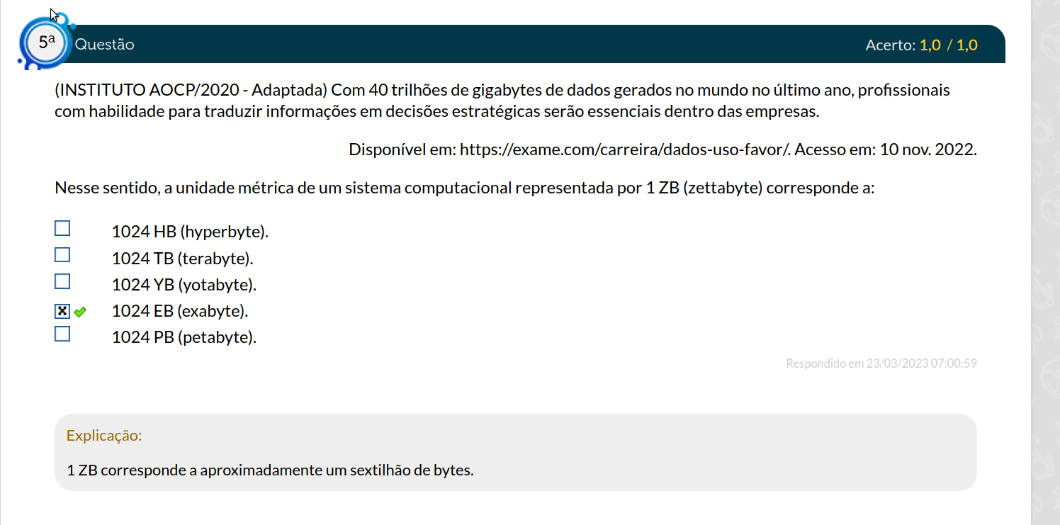 (INSTITUTO AOCP2020 - Adaptada) Com 40 trilhões de gigabytes de dados gerados no mundo no último ano, profissionais com habilidade para traduzir informações em decisões estratégicas serão essenciais d