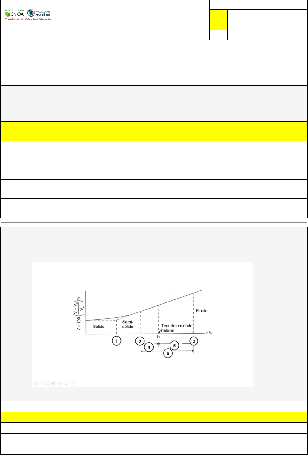 Pincel Atômico - 23/03/2023 11:06:24 1/2 FLÁVIA MACHADO SOUSA Avaliação Online (SALA EAD) Atividade finalizada em 14/03/2023 14:54:27 (777627 / 1) LEGENDA Resposta correta na questão # Resposta correta - Questão Anulada X Resposta selecionada pelo Aluno Disciplina: MECÂNICA DOS SOLOS [204114] - Avaliação com 5 questões, com o peso total de 15,00 pontos [capítulos - 1,2,3] Turma: Graduação: Engenharia Civil - Grupo: FEVEREIRO/2021 - ENG.CIV [21015] Aluno(a): 91420552 - FLÁVIA MACHADO SOUSA - Respondeu 5 questões corretas, obtendo um total de 15,00 pontos como nota [362090_1894 98] Questão 001 A necessidade de organizar e classificar os objetos que o cercam, fez com que o homem reunisse os materiais e indivíduos em tipos homogêneos, com características comuns, e isso também aconteceu com os solos, surgindo os sistemas de classificação. A respeito da classificação dos solos, assinale a alternativa correta. X O objetivo de uma taxonomia é organizar conhecimentos, de forma que as características possam ser mais facilmente entendidas. O programa de investigação do solo serve para possibilitar um estudo mais criterioso de forma teórica, mas não é aplicável em determinados problemas reais. Os sistemas de classificação modernos não consideram as propriedades de índices físicos como a granulometria e consistência do solo. Não existe um modelo que abrange as generalidades dos solos em campo e com isso não um sistema de classificação considerado válido. Os diferentes tipos de solos com atributos similares não devem ser classificados em conjuntos e subconjuntos conforme o seu comportamento. [362090_1903 55] Questão 002 (TRANSPETRO/2018) A figura a seguir apresenta limites de consistência (LC = Limite de Contração; LL = Limite de Liquidez; LP = Limite de Plasticidade) do solo e os índices (IC = índice de Consistência; IL = Índice de Liquidez; Índice de Plasticidade) em função da variação volumétrica. Os valores circulados representam: (1) LC; (2) LL; (3) LP; (4) IC; (5) IP e (6) IL X (1) LC; (2) LP; (3) LL; (4) IL x IP; (5) IC x IP e (6) IP (1) LC; (2) LL; (3) LP; (4) IC x IP; (5) IL x IP e (6) IP (1) LC; (2) LP; (3) LL; (4) IL; (5) IP e (6) IC (1) LC; (2) LP; (3) LL; (4) IL; (5) IC e (6) IP Pincel Atômico - 23/03/2023 11:06:24 2/2 [362090_1903 54] Questão 003 (PETROBRAS/2018 - Adaptado) A figura a seguir apresenta 4 curvas de distribuições granulométricas de solos diferentes A, B, C e D. Considerando-se a figura, conclui-se que: a curva de distribuição granulométrica do solo C possui 10% de argila. a distribuição granulométrica do solo B foi obtida por meio de sedimentação. a distribuição granulométrica do solo D foi obtida por meio do peneiramento. X o solo A tem permeabilidade superior ao solo D. as curvas de distribuição granulométricas dos solos A e B foram obtidas por meio de ensaio de sedimentação. [362091_1894 77] Questão 004 Permite identificar o solo como sendo uma areia, uma argila, um silte ou uma mistura desses componentes. Para isso, utiliza-se uma porção de solo e uma quantidade de água para a realização do ensaio em campo. O trecho anterior se refere ao ensaio de análise granulométrica. limite de plasticidade. X tátil-visual. limite de consistência. ensaio de peneiramento. [362092_1894 79] Questão 005 O gráfico é uma representação em escala logarítmica no eixo das abscissas, representando o diâmetro das partículas e no eixo das ordenadas os valores referentes ao percentual que passa nas peneiras no momento do peneiramento e na sedimentação dos sólidos. O trecho anterior se refere ao ensaio de limite de consistência. X análise granulométrica. limite de plasticidade. grau de saturação. tátil-visual.
