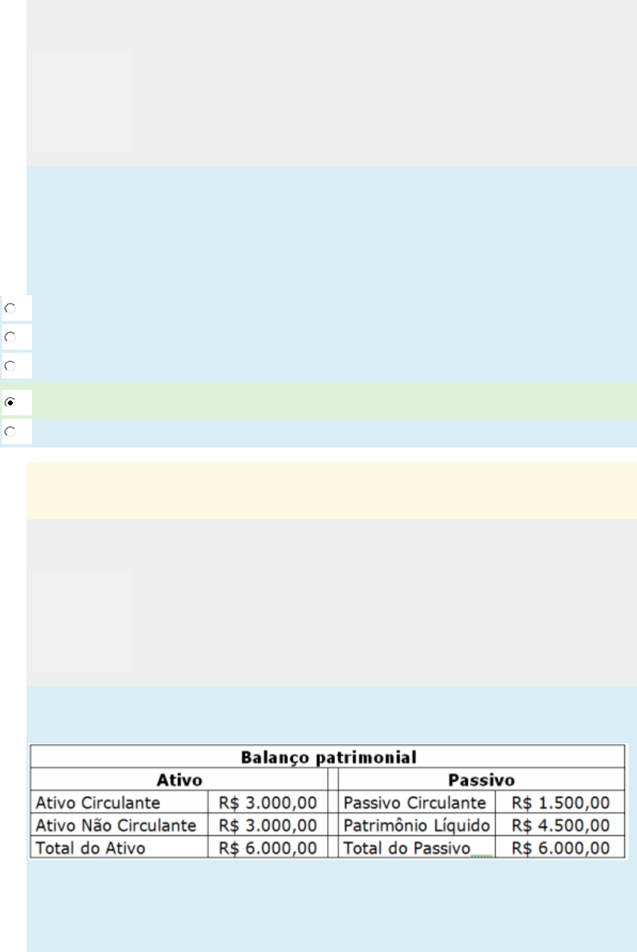 Prova Questão 1 Correto Atingiu 5,00 de 5,00 Marcar questão Texto da questão A partir da análise das demonstrações financeiras da empresa AGA, obteve-se os seguintes indicadores: Grau de Endividamento 200%; Composição do Endividamento 40%, Liquidez Corrente 1,6 e Liquidez Geral 1,0. Sabendo que o Ativo Total era R$ 375.000,00, o seu Ativo Circulante era, em reais, Escolha uma opção: a. 100.000. b. 240.000. c. 150.000. d. 160.000. e. 125.000. Feedback Sua resposta está correta. Questão 2 Correto Atingiu 5,00 de 5,00 Marcar questão Texto da questão Uma determinada empresa apresentou o seguinte Balanço Patrimonial: Se a empresa adquirir R$ 1.000,00 de mercadorias para revenda a prazo, o índice de liquidez corrente será de: Escolha uma opção: a. 2,6. b. 1,6. c. 4,0. d. 2,0. e. 1,2. Feedback Sua resposta está correta. Questão 3 Correto Atingiu 5,00 de 5,00 Marcar questão Texto da questão De acordo com as afirmativas I - Dividido em dois grandes grupos, o Balanço Patrimonial é composto por uma coluna do lado esquerdo denominada Ativo, e uma do lado direito, denominada Passivo. II - A análise das Demonstrações Contábeis é um exame minucioso dos dados financeiros disponíveis sobre a empresa, bem como das condições internas e externas que afetam financeiramente a empresa. III - O Balanço Patrimonial é um dos relatórios contábeis obrigatórios, ele apresenta a situação patrimonial de um grupo de empresas em um determinado momento, sempre no início do exercício. Assinale a alternativa que corresponda às afirmações acima: Escolha uma opção: a. As Afirmativas I, II e III estão incorretas; b. Apenas as Afirmativas I e III estão corretas; c. As Afirmativas I, II e III estão corretas; d. Apenas as Afirmativas I e II estão corretas; e. Apenas as Afirmativas II e III estão corretas; Feedback Sua resposta está correta. Questão 4 Correto Atingiu 5,00 de 5,00 Marcar questão Texto da questão De acordo com A Lei 8.666/93, responsável pela regulamentação das licitações, podemos afirmar que: Escolha uma opção: a. Qualquer índice econômico ou financeiro pode ser utilizado como critério de licitação; b. Uma licitação não pode se utilizar de índices como critério de classificação; c. A empresas precisam obrigatoriamente comprovar boa situação financeira para participar da licitação; d. Uma má gestão dos índices não interfere na qualificação da empresa para a licitação e. A capacidade financeira pode ser exigida para atestar que a empresa cumprirá os compromissos firmados na licitação; Feedback Sua resposta está correta. Questão 5 Correto Atingiu 5,00 de 5,00 Marcar questão Texto da questão Para uma boa análise o analista deve: Escolha uma opção: a. agir com parcialidade e detalhamento; b. entender os processos de venda da empresa; c. agir isenção e imparcialidade; d. conhecer o contador da empresa; e. conhecer a estrutura organizacional da empresa; Feedback Sua resposta está correta. Questão 6 Correto Atingiu 5,00 de 5,00 Marcar questão Texto da questão [QUESTÃO ANULADA] O fato de as empresas que pagarem mais juros do que recebem de retorno em relação aos seus ativos e, mesmo assim, continuam a distribuir muito dividendo para o acionista, evitando quitar empréstimos redutores de patrimônio tendem a ter grande interferência na sua rentabilidade. Diante da afirmação acima, assinale a alternativa correta: Escolha uma opção: a. é melhor ser credor da empresa, pois o retorno sobre o capital aplicado é maior e a depender da capacidade de geração de caixa do negócio, o retorno pode não ser garantido. b. é melhor ser credor da empresa, pois o retorno sobre o capital aplicado é menor e a depender da capacidade de geração de caixa do negócio, o retorno será garantido. c. é melhor ser credor da empresa, pois o retorno sobre o capital aplicado é maior e a depender da capacidade de geração de caixa do negócio, o retorno será garantido. d. é pior ser credor da empresa, pois o retorno sobre o capital aplicado é maior e a depender da capacidade de geração de caixa do negócio, o retorno será garantido. e. é melhor ser devedor da empresa, pois o retorno sobre o capital aplicado é maior e a depender da capacidade de geração de caixa do negócio, o retorno será garantido. Feedback Sua resposta está correta. Questão 7 Correto Atingiu 5,00 de 5,00 Marcar questão Texto da questão Quanto ao termômetro de Kanitz podemos dizer que: Escolha uma opção: a. Determina o total do endividamento da empresa b. Prevê a situação líquida da empresa c. Atesta a situação financeira da empresa d. Prevê o grau de solvência de uma empresa e. Determina os índices de endividamento da empresa Feedback Sua resposta está correta. Questão 8 Correto Atingiu 5,00 de 5,00 Marcar questão Texto da questão O método DuPont analisa o desempenho do retorno de uma empresa, com base neste método e nos dados abaixo, assinale a alternativa correta: Vendas Líquidas: $120.000,00. Ativo Operacional: $230.000,00. Lucro Operacional: $35.000,00. Escolha uma opção: a. O retorno é de 52,17%. b. O retorno é de 29,17%. c. O retorno é de 15,22%. d. O retorno é de 29,17%. e. O retorno é de 12,56%. Feedback Sua resposta está correta. Questão 9 Correto Atingiu 5,00 de 5,00 Marcar questão Texto da questão Uma determinada empresa apresentou o seguinte Balanço Patrimonial: Se a empresa adquirir R$ 1.000,00 de mercadorias para revenda a prazo, o índice de liquidez corrente será de: Escolha uma opção: a. 1,2. b. 2,6. c. 1,6. d. 4,0. e. 2,0. Feedback Sua resposta está correta. Questão 10 Correto Atingiu 5,00 de 5,00 Marcar questão Texto da questão A análise de balanço transforma esses dados em informações e será tanto mais eficiente quanto melhores informações produzir. Essa declaração pode afirmar que? Escolha uma opção: a. Existem várias técnicas, mas todas levam a um mesmo entendimento. b. As técni
