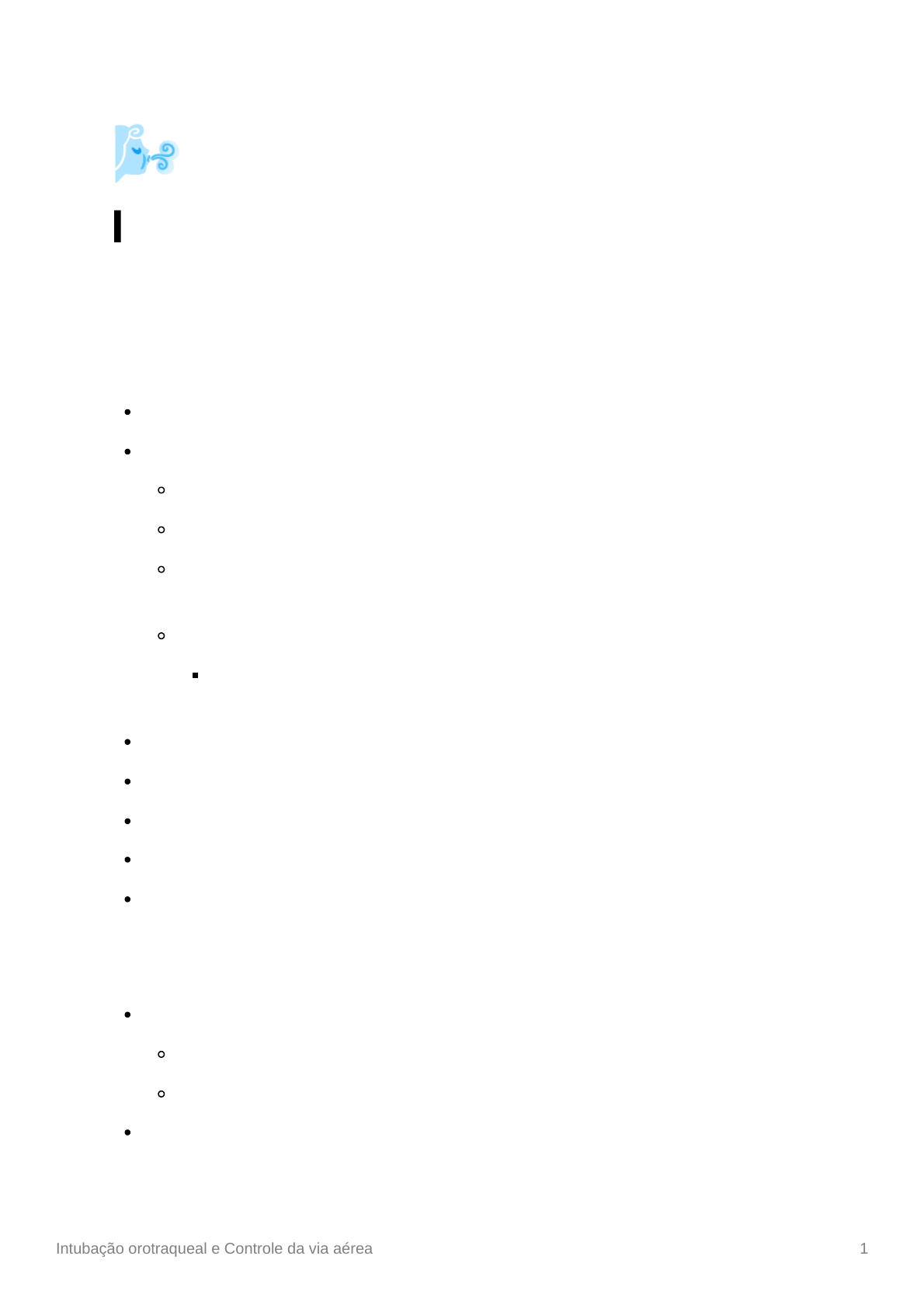 Intubação orotraqueal e Controle da via aérea 1 🌬 Intubação orotraqueal e Controle da via aérea Indicações Anestesia geral com ventilação controlada Insuficiência respiratória aguda Depressão do SNC inflamatória, infecciosa, tumoral ou por trauma Trauma por arma branca, arma de fogo, etc Doenças neuromusculares (Duchenne, ELA, miastenia grave, pneumotórax, hemotórax, lesão de parênquima pulmonar com SARA) Inflamação pulmonar por pneumonia aspirativa, etc Doença de Parkinson e outras doenças degenerativas por perda da fisiologia normal da laringe e faringe Rebaixamento do nível de consciência (Glasgow < 9) Ventilação por máscara difícil ou impossível Ventilação controlada prolongada Incapacidade de proteção da via aérea inferior (risco de aspiração) Insuficiência respiratória Preditores de via aérea difícil História pregressa do paciente em intubações anteriores Quebradura de dentes Acordou rouco da cirurgia Doenças que envolvem articulações cervicais e temporomandibulares ou outras doenças Intubação orotraqueal e Controle da via aérea 2 Espondilite anquilosante Artrose de ATM Artrite reumatóide Diabetes Mellitus (longo tempo e mal controlada) Glicolisação das proteínas que compõem os ligamentos cervicais (enrijecimento articular) Sinal da Prece Traumas, fraturas Osteomielite Síndrome de Pierre-Roban Exame físico Cavidade oral Abertura bucal de pelo menos 3 dedos Condições de arcada dentária e mucosas Presença de próteses dentárias Prova de Mallampati Exteriorizar a língua sem fonação, sentado ou em pé Classe I: observa-se a amídala Classe II: não se observa a amídala, mas se observa os pilares anteriores Classe III: não se observa os pilares anteriores, mas se observa a úvula Classe IV: não se observa nem os pilares anteriores nem a úvula Intubação orotraqueal e Controle da via aérea 3 Mobilidade cervical Mobilidade das arcadas Anteriorizar a arcada inferior e morder o lábio superior Consegue morder completamente (fácil) Não conseque morder completamente (difícil) Eixos alinhados (meato auditivo na linha esternal) Eixo oral Eixo faríngeo Eixo laríngeo Distância mento-cartilagem tireóidea Adulto: 5.5 cm ou mais ou 4 dedos Difícil: < 3 dedos Distância entre mento e manúbrio esternal Adulto: 12.5 cm Intubação orotraqueal e Controle da via aérea 4 🌪 Em casos de pacientes com via aérea difícil que tem risco de intubação difícil deve-se avisar a família e o paciente sobre esse risco e preparar os materiais e a equipe para executar manobras de ressussitação. Anatomia Técnica de intubação orotraqueal Pré-oxigenação Observar a frequência respiratória para escolher entre cateter e máscara Observar a saturação Intubação orotraqueal e Controle da via aérea 5 Tipos de oferta Cateter (menor fluxo) Máscara (maior fluxo) Venturi (monitorização da fração de oxigênio ofertada) Apoiar a borda superior na glabela Apoiar a borda inferior do mento Posição das mãos: C: apoiar a máscara E: elevar a mandíbula Aberta Cânula oro faríngea (nasal) Observar a distância entre o lóbulo da orelha e a rima bucal para escolher a cânula Introduzir a cânula com a ponta distal virada para cima Tocar no palato superior Girar em 180° Continuar a introduzir a cânula até o final Contraindicada em traumas crânio-faciais Máscara laríngea Introduzir com a mão, com a máscara desinsuflada, segurando-a semelhante a um lápis Progredir a máscara até ela encontrar resistência (estreito superior da faringe) Insuflar o balão Cricotireoideostomia Incisão da membrana laríngea do ligamento cricotireóideo Inserir o tubo com o fio guia Retirar o fio guia Intubação orotraqueal e Controle da via aérea 6 Intubação naso-traqueal Paciente acordado, tubo com xilocaína Passar o tubo nasotraqueal quando o paciente respirar fundo Laringoscopia Entrar com o laringoscópio pela rima labial direita, apontando com o cabo para o ombro esquerdo Empurrar a língua para a esquerda Visualizar a epiglote Descer com a lâmina até a valécula Fazer força na direção do teto dos pés do paciente Visualizar as cordas vocais Classificação de Cormack-Lahene Intubação orotraqueal e Controle da via aérea 7 Intubação Passar o tubo com o fio guia Retirar o fio guia Introduzir o tubo até a marcação de 22 cm Retirar o laringoscópio Insuflar o cuff Fixar o tubo