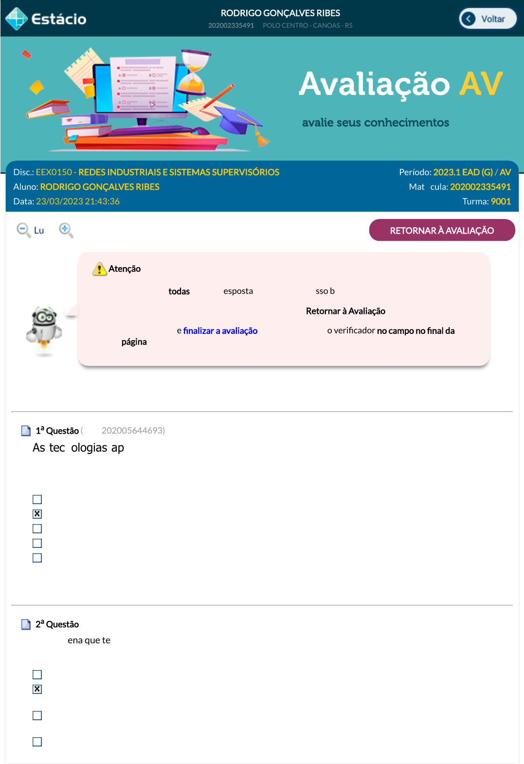 2. Caso você queira voltar à prova clique no botão "Retornar à Avaliação".