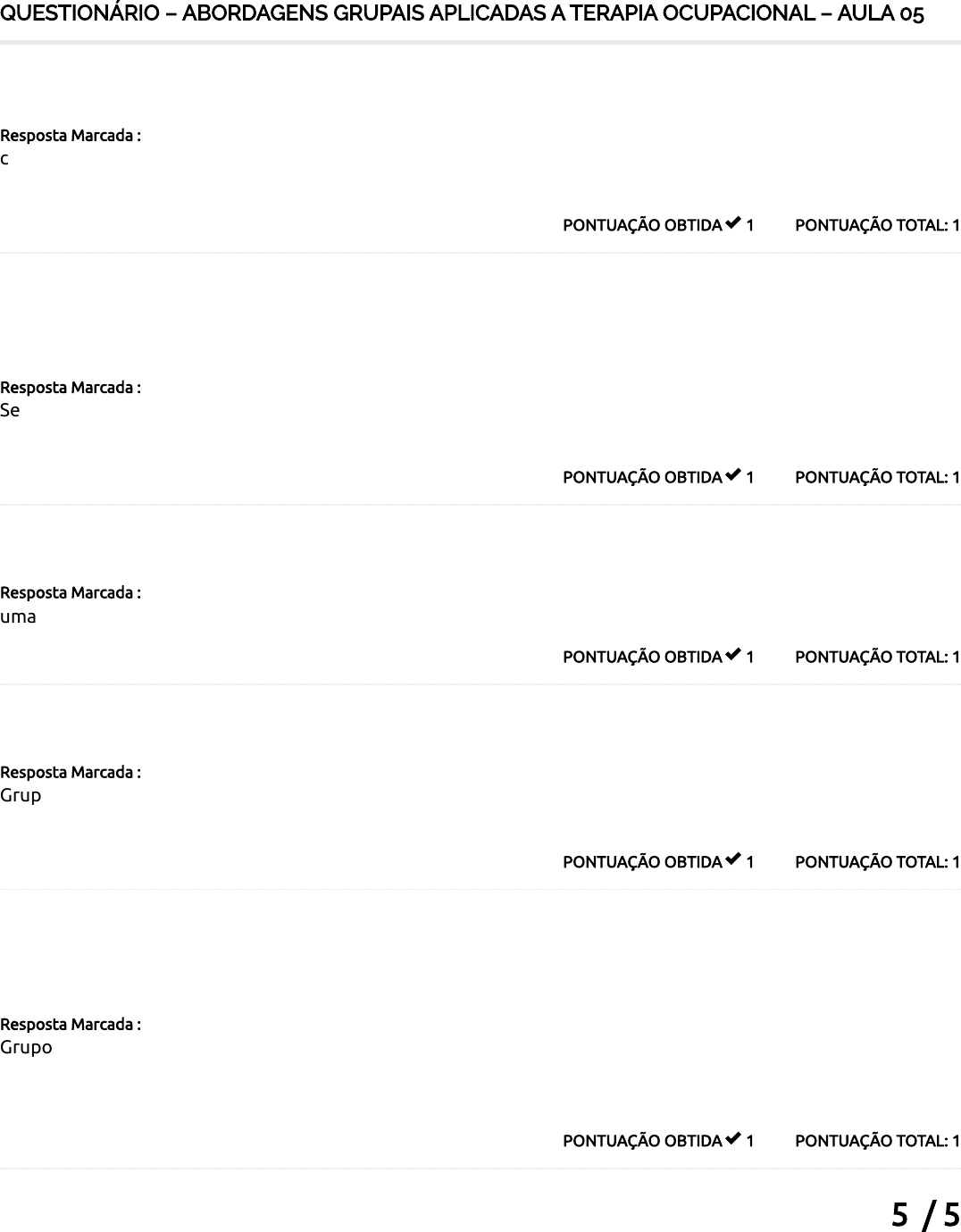 24/03/2023, 07:28 Course Status – AVA Saúde Unifaveni https://ava.saude.unifaveni.com.br/course-status/ 1/1 5 / 5 QUESTIONÁRIO – ABORDAGENS GRUPAIS APLICADAS A TERAPIA OCUPACIONAL – AULA 05 NO CONTEXTO DAS PROPOSTAS DE FORMAÇÃO GRUPAIS, DENTRO DA EXPERIENCIA RELATADA NO ARTIGO, BUSCAVA-SE: PONTUAÇÃO TOTAL: 1PONTUAÇÃO OBTIDA 1 Resposta Marcada : composição de coletivos que tivessem certa constância e a criação de um enquadre no qual �casse clara a continuidade do processo. NO DESENVOLVIMENTO DAS SESSÕES DO GRUPO DE TERAPIA, EDUARDO INICIOU O DESENHO DE SUA CASA -PROPOSTO AO GRUPO – APENAS UMA LINHA DE CONTORNO QUE SE FECHAVA EM SI MESMA, DELIMITANDO UM DENTRO E UM FORA. MAS TANTO O DENTRO QUANTO O FORA ERAM GRANDES ESPAÇOS VAZIOS, SEM NENHUMA PASSAGEM OU COMUNICAÇÃO ENTRE ELES. WINNICOTT (1990) NOS DIZ SOBRE ESSE EVENTO: PONTUAÇÃO TOTAL: 1PONTUAÇÃO OBTIDA 1 Resposta Marcada : Seguindo essa hipótese, podemos pensar que Eduardo tentava organizar-se e diferenciar-se do exterior, mas habitava uma interioridade esvaziada e enclausurada, sem espaços de comunicação e passagem. UM DOS PRINCÍPIOS BÁSICOS QUE CARACTERIZAM OS GRUPOS, SEJAM ELES OPERATIVOS OU TERAPÊUTICOS, EVIDENCIA QUE PONTUAÇÃO TOTAL: 1PONTUAÇÃO OBTIDA 1 Resposta Marcada : uma interação afetiva, de natureza múltipla e variada, sempre ocorre entre os integrantes de um grupo. AS PSICOTERAPIAS DE GRUPO SURGIRAM A PARTIR DA NECESSIDADE DE ESTENDER A UM NÚMERO MAIOR DE PESSOAS AS POSSIBILIDADES DE ATENDIMENTO PSICOTERÁPICO. É CORRETO AFIRMAR: PONTUAÇÃO TOTAL: 1PONTUAÇÃO OBTIDA 1 Resposta Marcada : Grupos com enfoque cognitivo-comportamental têm objetivos claros e são estruturados a semelhança das sessões da terapia individual. PRATICAMENTE TODOS OS GRUPOS DESENVOLVEM CONVICÇÕES, ATITUDES E COMPORTAMENTOS QUE CONSIDERAM CORRETOS OU INCORRETOS. OS MEMBROS QUE SE AFASTAM DESSAS CONCEPÇÕES PODEM SER ADVERTIDOS OU MESMO ISOLADOS, E AQUELES QUE SE COMPORTAM NO SENTIDO DA ADESÃO PODEM SER RECONHECIDOS E VALORIZADOS. NESSE SENTIDO, ANALISE AS ALTERNATIVAS ABAIXO E IDENTIFIQUE A CORRETA: ALTERNATIVAS PONTUAÇÃO TOTAL: 1PONTUAÇÃO OBTIDA 1 Resposta Marcada : Grupos de referência são aqueles com os quais nos identi�camos, in�uenciando nossas opiniões e ações, podendo fornecer uma perspectiva pela qual percebemos o mundo. Como importantes grupos de referência para muitas crianças e adolescentes, podem ser citadas a família, amigos, professores e colegas de escola. Total de Pontos