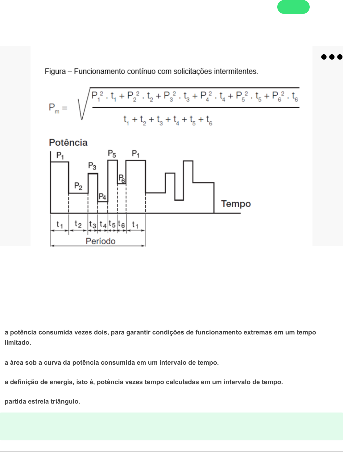 24/03/2023, 19:21 Comentários https://sereduc.blackboard.com/ultra/courses/_146737_1/outline/assessment/_7203716_1/overview/attempt/_24468468_1/review/inline-feedbac… 1/11 Ocultar opções de resposta Pergunta 1 1 / 1 Veja a seguinte figura, que representa uma equação da potência média do motor consumida em distintos intervalos de tempo, considerando que não existe repouso do motor. Fonte: WEG. Motores Elétricos guia de especificação. Rev. 22, Jaraguá do Sul: WEG EQUIPAMENTOS ELÉTRICOS S.A., 2019. p. 43. De acordo com a figura e os conteúdos estudados sobre especificações dos motores, é correto afirmar que, para motores de funcionamento contínuo com solicitações intermitentes, a potência média ao quadrado pode ser calculada como: a potência consumida vezes dois, para garantir condições de funcionamento extremas em um tempo limitado. a área sob a curva da potência consumida em um intervalo de tempo. a definição de energia, isto é, potência vezes tempo calculadas em um intervalo de tempo. partida estrela triângulo. Resposta correta a somatória da potência solicitada pelo motor ao quadrado em cada intervalo, dividida pelo período de funcionamento. 24/03/2023, 19:21 Comentários https://sereduc.blackboard.com/ultra/courses/_146737_1/outline/assessment/_7203716_1/overview/attempt/_24468468_1/review/inline-feedbac… 2/11 Ocultar opções de resposta Pergunta 2 Crédito total dado 1 / 1 Entre as especificações dos motores, existe uma classificação relacionada ao grau de proteção do motor, sendo alguns motores abertos e outros fechados, de acordo com o ambiente industrial onde funcionam. A forma define esse grau de proteção com as letras IP e dois algarismos. O primeiro representa a proteção contra sólidos pequenos e o segundo representa a proteção contra água. De acordo essas informações e os conteúdos estudados sobre especificações do motor, considere as seguintes nomeações de grau de proteção e relacione-as com a forma como cada uma funciona: 1) IP23 2) IP44 3) IP54 4) IP66 ( ) Máquina protegida contra corpos sólidos de dimensões acima de 1mm e contra projeções de água. Geralmente são tipos de motores fechados, protegidos contra toques com ferramentais. ( ) Máquina totalmente protegida contra poeira e contra jatos potentes de água, cujos motores estão protegidos completamente contra toque e são fechados. ( ) Máquina protegida contra corpos sólidos de dimensões acima de 12mm e contra aspersão de água. Esse tipo de motor também é protegido de toque com os dedos, apesar de ser um motor aberto. ( ) Máquina protegida contra poeira e contra projeções de água, sendo motores fechados, protegidos completamente contra toque. Agora, assinale a alternativa que apresenta a sequência correta: 2, 1, 4, 3. 3, 4, 2, 1. 3, 4, 1, 2. Resposta correta2, 4, 1, 3. 2, 1, 3, 4. Pergunta 3 1 / 1 24/03/2023, 19:21 Comentários https://sereduc.blackboard.com/ultra/courses/_146737_1/outline/assessment/_7203716_1/overview/attempt/_24468468_1/review/inline-feedbac… 3/11 Ocultar opções de resposta Existem várias formas de controlar a velocidade de um motor de indução, as quais se sustentam nas relações que as variáveis que descrevem o comportamento da máquina podem ter no comportamento da velocidade. As variáveis consideradas para alterar a velocidade são o número de pólos, a frequência e o escorregamento. De acordo essas informações e com os conteúdos estudados sobre como controlar um motor de indução, considere as seguintes formas de controlar a velocidade do motor e relacione-as com a forma como cada uma funciona: 1) Alteração do número de pólos. 2) Variação da frequência de linha. 3) Variação da tensão de linha. 4) Variação da resistência do rotor. ( ) Se aplica porque o conjugado de carga é diretamente proporcional ao quadrado da tensão e, quanto maior a carga, maior o escorregamento ( ) Se aplica porque a velocidade é inversamente proporcional a essa grandeza, sendo necessário que exista uma alteração construtiva pelo fabricante. ( ) Se aplica pois essa variável é diretamente proporcional à velocidade síncrona. Se o valor da velocidade síncrona mudar, também muda o valor da velocidade do motor. ( ) É possível para o motor de indução que tem rotor bobinado, não podendo ser aplicada no rotor com gaiola de esquilo. Agora, assinale a alternativa que apresenta a sequência correta: 2, 4, 1, 3. 3, 4, 1, 2. Resposta correta3, 1, 2, 4. 2, 1, 3, 4. 3, 4, 2, 1. Pergunta 4 1 / 1 24/03/2023, 19:21 Comentários https://sereduc.blackboard.com/ultra/courses/_146737_1/outline/assessment/_7203716_1/overview/attempt/_24468468_1/review/inline-feedbac… 4/11 Ocultar opções de resposta Veja a figura a seguir, na qual se apresentam as curvas de carga, perdas elétricas e temperatura de um motor com regime de serviço S9. Figura – Regime de serviço S9. Fonte: WEG. Motores Elétricos guia de especificação. Rev. 22, Jaraguá do Sul: WEG EQUIPAMENTOS ELÉTRICOS S.A., 2019. p. 41. Observe na figura que a rotação do motor se inicia por um tempo D. Durante o tempo L, a velocidade é constante. Durante um tempo F, o motor diminui a velocidade de forma linear e durante um tempo R ele está em repouso. Continue observando a figura e veja que o sentido de rotação se inverte e depois a velocidade aumenta em seguida a uma curva quadrática. De acordo com essas informações e os conteúdos estudados sobre especificações dos motores, pode-se afirmar que: Resposta corretao regime de serviço é não periódico. as perdas elétricas são maiores que para outros regímenes de serviços. o motor considera um tipo de partida reversora. o regime de serviço é de tempo limitado. a temperatura atingirá o valor máximo com mais facilidade. Pergunta 5 1 / 1 24/03/2023, 19:21 Comentários https://sereduc.blackboard.com/ultra/courses/_146737_1/outline/assessment/_7203716_1/overview/attempt/_24468468_1/review/inline-fee