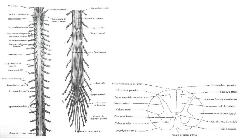 · O limite inferior da medula é geralmente a 2ª vértebra lombar (L2) · Existem duas dilatações denominadas intumescência cervical e intumescência lombar, situadas nos níveis cervical e lombar, respectivamente · Estas intumescências correspondem às áreas em que as grossas raízes nervosas que formam os plexos braquial e lombossacral, destinadas à inervação dos membros superiores e inferiores, respectivamente, fazem conexão com a medula · · O sulco intermédio posterior só existe na medula cervical, que divide o funículo posterior em fascículos grácil e cuneiforme · A substância cinzenta é dividida em três colunas que aparecem nos cortes como cornos e que são as colunas anterior, posterior e lateral. · A coluna lateral, entretanto, só aparece na medula torácica e parte da medula lombar · No centro da substância cinzenta localiza-se o canal central da medula (ou canal do epêndima), resquício da luz do tubo neural do embrião · Existem 31 pares de nervos espinhais, aos quais correspondem 31 segmentos medulares assim distribuídos: 8 cervicais, 12 torácicos, 5 lombares, 5 sacrais e, geralmente, 1 coccígeo. · No entanto, existem 7 vértebras cervicais e 4 coccígeas · Até o quarto mês de vida intrauterina, medula e coluna crescem no mesmo ritmo. Por isso, a medula ocupa todo o comprimento do canal vertebral, e os nervos, passando pelos respectivos forames intervertebrais, dispõem-se horizontalmente, formando com a medula um ângulo aproximadamente reto. Entretanto, a partir do quarto mês, a coluna começa a crescer mais do que a medula, sobretudo em sua porção caudal · Entre os níveis das vértebras C2 e T10, adiciona-se 2 ao número do processo espinhoso da vértebra e tem-se o número do segmento medular subjacente. · Aos processos espinhosos das vértebras T 11 e T 12 correspondem os cinco segmentos lombares, enquanto ao processo espinhoso de L 1 correspondem os cinco segmentos sacrais · · Prolongamentos laterais da dura-máter embainham as raízes dos nervos espinhais, continuando com o tecido conjuntivo (epineuro) que envolve estes nervos. Os orificios necessários à passagem de raízes ficam então obliterados, não permitindo a saída de liquor · Quando a medula termina no cone medular, a pia-máter continua caudalmente, formando um filamento esbranquiçado denominado filamento terminal. Este filamento perfura o fundo-do-saco durai e continua caudalmente até o hiato sacral. · Ao atravessar o saco dural, o filamento terminal recebe vários prolongamentos da dura-máter e o conjunto passa a ser denominado filamento da dura-máter espinhal. Este, ao inserir-se no periósteo da superficie dorsal do cóccix, constitui o ligamento coccígeo. · A pia-máter forma, de cada lado da medula, uma prega longitudinal denominada ligamento denticulado, que se dispõe em um plano frontal ao longo de toda a extensão da medula · · As agulhas na medula penetram no espaço entre as vértebras L2-L3, L3-L4 ou L4-L5