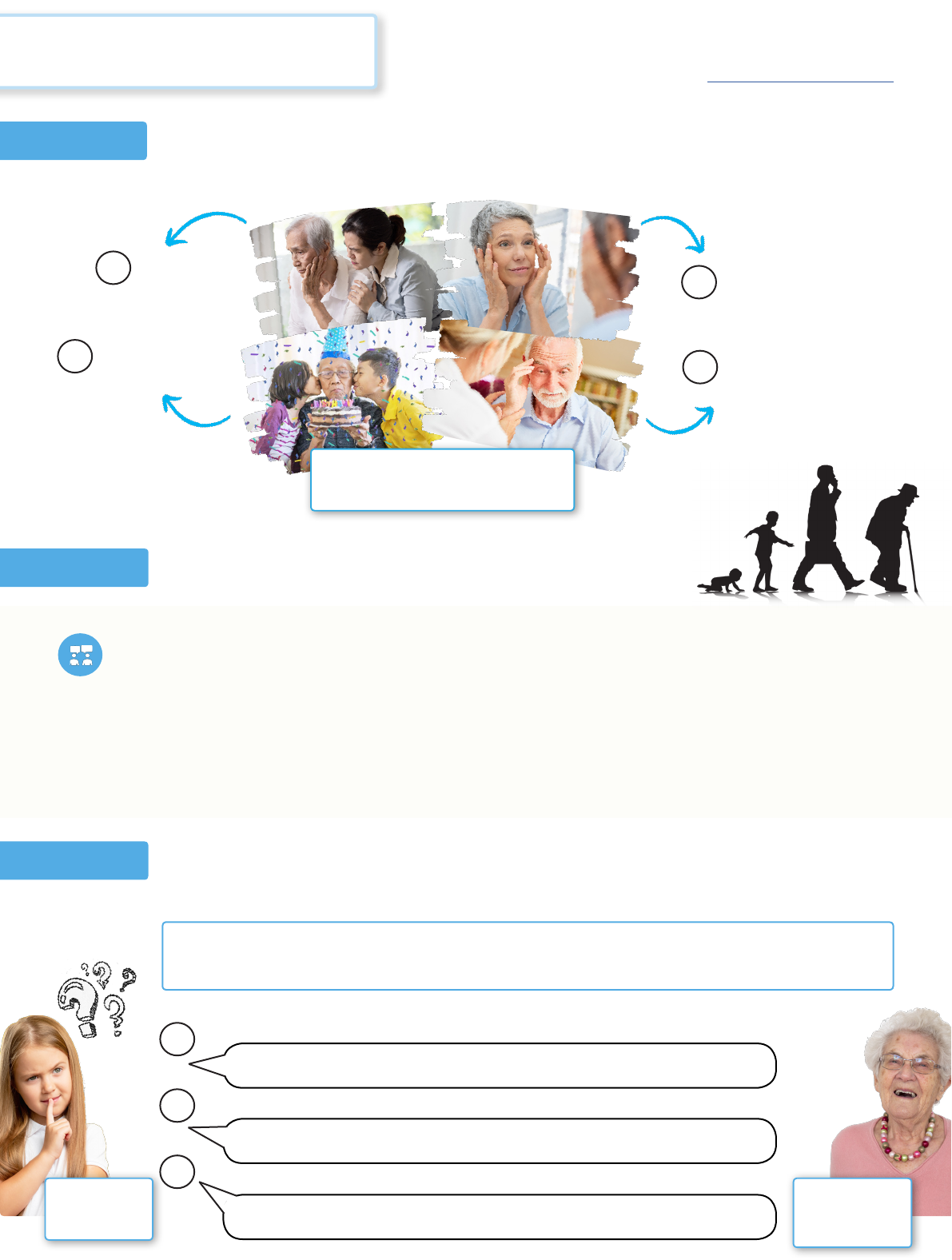 101-YEAR-OLD WOMAN PREVIEW ACTIVITY Fluentize, LLC. Copyright 2023. For use only with license. Kids Meet A 101-Year-Old (B1) PAGE 1 Imagine a 6-year-old kid interviews a 101-year-old woman about her life. Write three questions you think the kid might ask her. Use 3 of the 6 words in your questions. wars | secret | favorite | dying | fun | hardest 1 2 3 6-YEAR-OLD KID Discuss the topics in the mind map below about aging/getting old. Benefits/ Advantages Fears1 3 4 Physical Changes/ Problems 2 Discuss the questions below about age and time. 1 What does “old” mean to you? Do you feel that you’re old? Why or why not? 2 What do you think the phrase “age is just a number” means? Do you agree or disagree with this phrase? Explain your answer. 3 Think about life and the world 100 years ago. What do you think it was like back then? OLD AGE / GETTING OLD Mental Changes/ Problems PART 1 PART 2 PART 3 https://app.fluentize.com/lesson/101-year-old VIEWING ACTIVITY What do you think are the secret(s) to living a long life? How do you think a person can live to be over 100 years old? KIDS MEET A 101-YEAR OLD Fluentize, LLC. Copyright 2023. For use only with license. Kids Meet A 101-Year-Old (B1) PAGE 1 PREVIEW DISCUSSION PART 1 PART 4 List the topics that the kids and the 101-year-old woman (Alice) talk about in order from 1 - 10. The first one has been done as an example. Alice’s past hobbies and dress What life was like in the past What Alice did for work Alice’s hometown Alice’s role in the Second World War 1 Alice’s current hobbies Alice’s favorite insect Being afraid of dying The secret to living a long life The challenges of aging 1 - 5 6 - 10 PART 2 Go through each topic in Part 1. What does Alice say about each one? If necessary, watch the video again. PART 3 Were any of your questions in Preview, Part 3 the same as the kids’ questions in the video? If so, which ones? Watch the video again from 3:38. Answer the questions below. 1 According to Alice, what kinds of problems or qualities do some old people have? 2 Who died in Clara’s family? What reminds her of this person? 3 What did Alice’s doctor tell her? 4:18 3:38 4:41 https://app.fluentize.com/lesson/101-year-old EX. How friends with others when you were a kid? 1 Where on trips or vacations when you were a kid? 2 How to school when you were younger? 3 What kinds of games or sports in the past? 4 Who the most time with when you were a kid? 5 How to music in the old days? VIEWING FOLLOW-UP Fluentize, LLC. Copyright 2023. For use only with license. Kids Meet A 101-Year-Old (B1) PAGE 3 PART 4 PART 1 Choose the correct auxiliary verb that fits each question asked by one of the kids in the video. One auxiliary verb below is not used! 1 What it like back then? 2 Back then, you see any wars? 3 What you do for fun in the old days? 4 What the hardest part about getting old? 5 What you like to do for fun? 6 you afraid of dying? would you make is | are | was | were | do | did | would PART 2 Refer to the question in Part 3 with the auxiliary verb would. Why is would used in this question instead of the past simple? Choose the correct answer below. a. It’s used to ask her about something she did only once in the past. b. It’s used to ask her about what she did repeatedly or regularly in the past. c. It’s used to ask her about what she did in the past and still does today. Work with a classmate/your teacher. Take one of the roles below. Find out a bit about your classmate’s/ teacher’s past habits. Ask them a few questions from Part 3. Then reverse roles. Your classmate/teacher will ask you a few questions from Part 3. Answer their questions. Then reverse roles. STUDENT A STUDENT B PART 3 Finish the sentences below using the auxiliary verb would + [base verb]. Use any base verb that fits the context. https://app.fluentize.com/lesson/101-year-old GET TO KNOW EACH OTHER INTERVIEW TASK Fluentize, LLC. Copyright 2023. For use only with license.Kids Meet A 101-Year-Old (B1) PAGE 4 • If possible, change classmates. If not, stay with the same classmate (or teacher). • Imagine you’re new colleagues or classmates. • Write/Prepare 5 new questions about each other’s past life and their life now. • Use a different auxiliary verb in each question. • Use a mix of different question words. (Who... / What... / Where... / When... , etc.) • Ask each other your questions. Take turns after each question. STEP 3: Discuss how your interviews went. What did you learn about each other? 1 What’s your favorite…? 2 What do you like to...? 3 What was life like when you...? 4 Are you afraid of...? • Work with a classmate/your teacher. Choose one of the roles below (Student A or B). • Try to get to know them a little bit more using the question prompts below. • Ask each other your questions. Take turns after each question. 1 2 3 4 5 is | are | was | were | do | did | would 1 What’s your favorite…? 2 Did you... in the past? 3 What would you... when you were a kid? 4 What is the hardest part about...? STEP 1 STEP 2 STUDENT A STUDENT B https://app.fluentize.com/lesson/101-year-old QUIZ & REVIEW ACTIVITY Work with a partner. Complete the quiz and review activities below. Fluentize, LLC. Copyright 2023. For use only with license. Kids Meet A 101-Year-Old (B1) PAGE 5 PART 2 PART 3 Finish writing the missing parts of the questions that the kids ask Alice in the video. Discuss the questions below. EX. What back then? 1 Back then, any wars? 2 What for fun in the old days? 3 What about getting old? 4 What to do for fun? 5 Are you afraid ? PART 1 Discuss the questions below about the video. 1 What happens in the video? Describe what you remember about it. 2 What kinds of topics are discussed in the video? 3 According to Alice, what kinds of problems or qualities do some old people have? 4 What did Alice’s doctor tell her? 1 How did Alice answer each question above in Part 2? 2 Refer to the question in Part 2 with the auxiliary ver