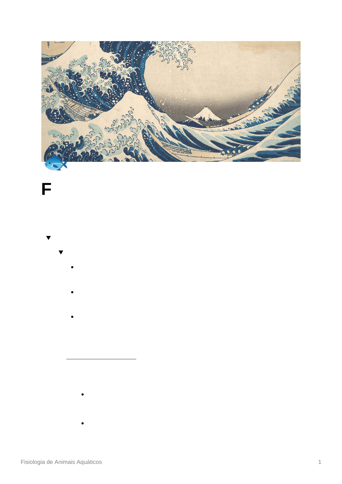 Fisiologia de Animais Aquáticos 1 🐟 Fisiologia de Animais Aquáticos Prova 1: Respiração, Circulação e Sangue Tópico 1: Introdução à Fisiologia Funcionamento dos sistemas dos organismos de forma integrada + Regulação de todas as funções Conceito de HOMEOSTASE: constância no m,eio interno dos animais e a existência de sistemas regulatórios que mantém essa constância Animais interagem de forma dinâmica com o meio (temperatura, pH, sais) Respostas fisiológicas: variações nos organismos em função das mudanças no meio 1) Conformação: permite que condições internas e externas se igualem Ex.: peixes são conformadores para Temperatura 2) Regulação: meio interno constante frente à variabilidade externa Ex.: peixes são reguladores para sais como Cl (através da osmorregulação) Fisiologia de Animais Aquáticos 2 Exemplos de respostas fisiológicas em resposta ao meio externo Aclimatação/Aclimatização: descrevem ajustes às mudanças num ambiente, sejam metabólicos, bioquímicos ou anatômicos Adaptação: ocorre a nível de espécie-população e de forma lenta; envolve modificações genéticas herdáveis que são irreversíveis Tópico 2: Respiração De forma resumida: captação de O2 e liberação de CO2 através da HEMATOSE; O2 direcionado para a cadeia respiratória na mitocôndria Diferença em ambientes: meio terrestre é rico em O2, enquanto meio aquático é pobre em O2 Transporte de Gases via DIFUSÃO: meio + concentrado para o - concentrado Disponibilidade de gases afetada por: Altitutude: < pressão atmosférica Alta Pressão Parcial do gás - > difusão Alta Temperatura e Salinidade - < difusão Em função dessa diferença entre ambientes, animais aquáticos desenvolveram mecanismos + eficientes para remoção de O2 da água Órgãos respiratórios Pulmões (são invaginações) - podem se associar a outros órgãos em alguns grupos de animais: Ex.: A pele em anfíbios Brânquias (são evaginações) Externas (em salamandras) Internas (em peixes; protegidas por opérculos) Respiração Aquática Fisiologia de Animais Aquáticos 3 Peixes e outros animais aquáticos fazem trocas gasosas através da ventilação das brânquias 1. Movimentação das brânquias pela água: só é viável para animais pequenos 2. Movimentação da água pelas brânquias: a. Bombeamento opercular: movimento combinado de abertura da boca e do opérculo Acúmulo de água na cavidade bucal (expansão com o abaixamento da mandíbula e do assoalho da boca) Água direcionada para o opérculo e posteriormente liberada A pressão na cavidade bucal permanece mais alta qie na cavidade opercular, de forma a gerar um fluxo contínuo de água sobre as brânquias. b. Ventilação forçada (ou RAM) Boca e opérculo são mantidos abertos permanentemente, de forma que a água flui continuamente pelo animal. Movimentos respiratórios (de boca e opérculo) não são detectados. Ex.: Tubarões: não têm opérculos, apenas fendas branquiais; mantêm a boca um pouco aberta e a água flui via cavidade bucal até sair pelas fendas branquiais Atuns: são peixes pelágicos grandes que nadam a velocidade de cruzeiro; não fazem movimentos respiratórios Fisiologia de Animais Aquáticos 4 e dependem de movimentação constante para fazer a respiração Respiração por Ventilação Forçada não é exclusiva de peixes pelágicos grandes Vários peixes conseguem fazer a mudança no tipo de respiração: Fazem bombeamento a velocidades baixas, e caso precisem atingir velocidades mais altas, começam a fazer ventilação forçada A transição ocorre em velocidades em torno de 0,5 a 1 m/s - Acima desta velocidade, os movimentos respiratórios ativos cessam A ventilação branquial não é sem custo após a transição da modalidade respiratória, o trabalho é apenas deslocado O trabalho dos músculos das bombas operculares é transferido para os músculos natatórios do corpo e da cauda O fluxo contínuo durante a Ventilação Forçada é mais econômico do ponto de vista energético que o Bombeamento Opecular ao considerarmos o ritmo necessário para a natação rápida Outras funções das brânquias Osmorregulação: peixes de modo geral fazem balanço de sais e ghases pelas brânquias Alimentação: animais filtradores como mexilhões pegam seus alimentos através das brânquias Trocas gasosas e o fluxo de água Brânquias dependem de uma área de superfície que seja adequada para as trocas gasosas - Relacionado ao tipo de vida do animal Ex.: Cavalas, que são muito ativas, terão áreas branquiais maiores que um Linguado ou um Peixe-sapo, que são animais menos ativos Fisiologia de Animais Aquáticos 5 Fluxo Contracorrente: arranjo que faz com que a corrente de água que flui sobre a brânquia (lamelas branquiais) e o sangue no interior fluam em direções opostas Reduz o custo energético envolvido no bombeamento: apesar de haver gasto energético no bombeamento opercular, o fluxo garante uma extração massiva de oxigênio da água. Quando o sangue sai da lamela branquial, ele entra em contato com a água cujo Oxigênio ainda não foi removido, de forma que o sangue obtenha Oxigênio da água que ainda tem o conteúdo de Oxigênio da água inspirada anteriormente, fazendo assim, com que o conteúdo de oxigênio do sangue atinja o nível mais alto possível À medida que a água corre entre as lamelas ela encontra um o sangue com um conteúdo cada vez mais baixo de oxigênio, de modo que cada vez mais oxigênio é liberado. Tipos de Respiração nos Peixes A respiração pode ser influenciada por condições ambientais Presença de oxigênio na água: através de difusão pela lâmina superficial ou derivado da fotossíntese de fitoplâncton Águas podem ser classificadas em função da [oxigênio] Fisiologia de Animais Aquáticos 6 a. Hiperóxida - 18 mgO2/L b. Normóxida - 7 a 4 mgO2/L c. Hipóxica - 3 a 0,5 mgO2/L d. Anóxica - < 0,5 mgO2/L Ambientes dulcícolas podem passar por to