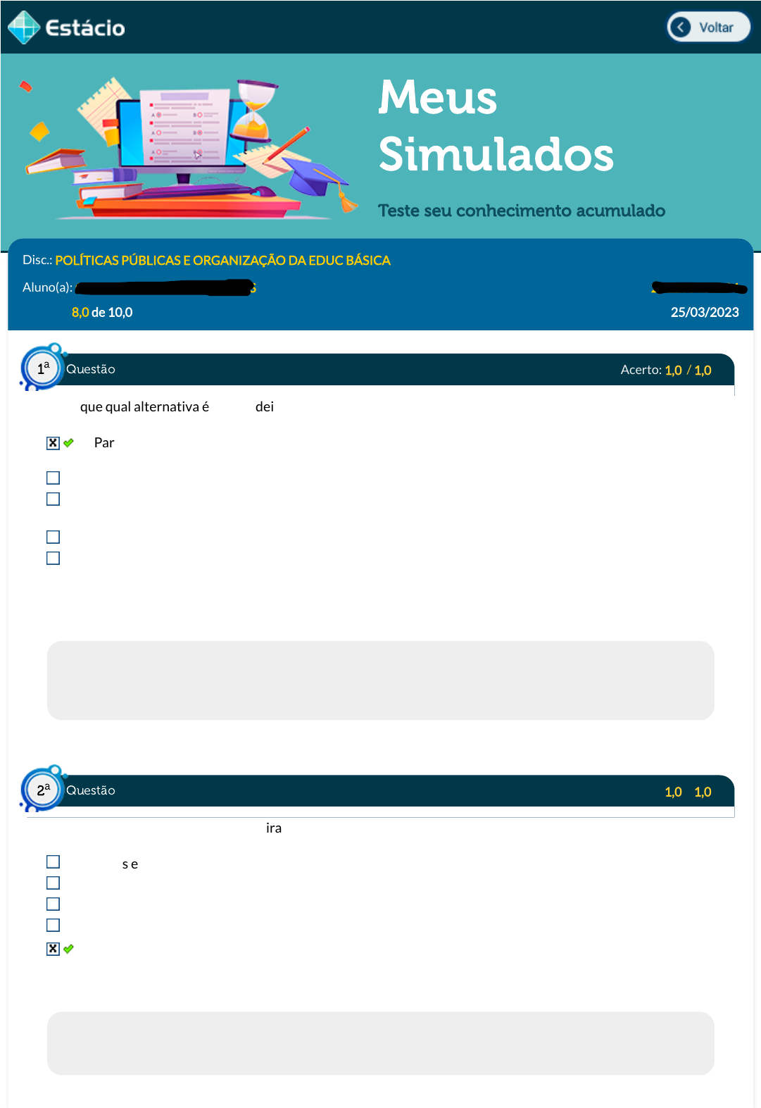 25/03/2023, 13:58 Estácio: Alunos https://simulado.estacio.br/alunos/ 1/5 Meus Simulados Teste seu conhecimento acumulado Disc.: POLÍTICAS PÚBLICAS E ORGANIZAÇÃO DA EDUC BÁSICA Aluno(a): GIOVANA ROCHA MALAQUIAS 202208481604 Acertos: 8,0 de 10,0 25/03/2023 Acerto: 1,0 / 1,0 Veri�que qual alternativa é a verdadeira: Para o Teorema de Coase funcionar é essencial ter direitos de propriedade bem de�nidos e não existir custo de transação. A existência de externalidade positiva não gera peso morto. Uma solução possível para o caso da Tragédia dos Comuns é transformar o recurso comum em bem público. O imposto pigouviano serve para corrigir qualquer tipo de externalidade. De acordo com o Teorema de Coase, a solução e�ciente depende do agente que tem o direito de propriedade. Respondido em 25/03/2023 13:43:19 Explicação: A resposta correta é: Para o Teorema de Coase funcionar é essencial ter direitos de propriedade bem de�nidos e não existir custo de transação. Acerto: 1,0 / 1,0 Veri�que qual é a a�rmativa verdadeira: Umas estrada congestionada e com pedágio é um bem público. Uma estrada congestionada e sem pedágio é um bem público. A assinatura de TV a cabo é um bem público. A assinatura de TV a cabo é um bem privado. Uma estrada congestionada e com pedágio é um bem privado. Respondido em 25/03/2023 13:44:38 Explicação: A resposta correta é: Uma estrada congestionada e com pedágio é um bem privado. Questão1 a Questão2 a O seu texto aqui 1O seu texto aqui 2 https://simulado.estacio.br/alunos/inicio.asp javascript:voltar(); 25/03/2023, 13:58 Estácio: Alunos https://simulado.estacio.br/alunos/ 2/5 Acerto: 1,0 / 1,0 Educação é uma área em que o governo faz intervenções. Por que o governo deveria agir nessa área? Porque não existe oferta privada de educação. Porque o consumo de educação gera uma externalidade positiva. Porque a educação é um bem público. Porque a produção de educação gera externalidade negativa. Porque não existe oferta pública de educação. Respondido em 25/03/2023 13:45:02 Explicação: A resposta correta é: Porque o consumo de educação gera uma externalidade positiva. Acerto: 0,0 / 1,0 A respeito de políticas públicas na educação, analise as a�rmativas abaixo e responda: I. As diretrizes para a organização e o funcionamento escolar constam no projeto político-pedagógico II. A função do executivo é propor leis e �scalizar a atividade do legislativo. III. A lei propõe que toda a comunidade e interessados (stakeholders) estejam envolvidos na elaboração do projeto político-pedagógico. IV. A LDB con�gura o trabalho de especialistas, pois, para que a educação aconteça, é necessário que àqueles que realmente compreendem o processo educacional tomem as decisões. I, II, III e IV II e IV I e IV II e III I e III Respondido em 25/03/2023 13:46:38 Explicação: No projeto político-pedagógico, constam as diretrizes para a organização e o funcionamento escolar. Assim como em qualquer outro projeto, nele deve constar as propostas da escola, os objetivos delas e aonde desejam chegar. O Legislativo Sua função é �scalizar as decisões e as ações do Executivo. É formado por deputados federais e senadores, que compõem o Congresso Nacional, por deputados estaduais, que integram as Assembleias Legislativas dos estados, e por vereadores, que compõem as Câmaras municipais. A LDB propõe que professores, gestores, demais trabalhadores da escola e a comunidade estejam envolvidos na elaboração do projeto político-pedagógico. A LDB con�gura o trabalho coletivo, pois, para que a educação aconteça, é necessário que muita gente esteja envolvida Acerto: 1,0 / 1,0 Muitas vezes, especialmente durante os períodos eleitorais no Brasil, escutamos os candidatos a cargos públicos falarem sobre educação, sobre como ela é um direito de cada cidadão ao mesmo tempo em que se fala como ela Questão3 a Questão4 a Questão5 a 25/03/2023, 13:58 Estácio: Alunos https://simulado.estacio.br/alunos/ 3/5 tem sido negligenciada em nosso país nos últimos anos. É correto a�rmar que ela é um direito, assegurada no artigo 205 de qual documento legal brasileiro? Estatuto da Criança e do Adolescente Constituição Federal de 1988 Constituição Federal de 1888 Consolidação das Leis do Trabalho Lei de diretrizes e bases para a educação Respondido em 25/03/2023 13:47:47 Explicação: O artigo 205 da Constituição brasileira, de 1988, deixa claro que ''a educação é direito de todos e dever do Estado e da família, será promovida e incentivada com a colaboração da sociedade''. Acerto: 0,0 / 1,0 Nossa democracia, em termos históricos ainda é bastante recente. Havia passado 11 anos do �m da ditadura civil militar e apenas 7 desde a primeira eleição direta para presidente da república quando, em 1996, se publicou a primeira versão da Lei de Diretrizes e Bases da Educação (LDB). Por essa razão que este primeiro texto ainda apresenta forte in�uência de qual tipo de pensamento? Pedagógico Capitalista Liberal Nacional desenvolvimentista Socialista Respondido em 25/03/2023 13:48:54 Explicação: Com nove títulos que versam sobre vários temas, a lei abrange e organiza todo o campo da educação no Brasil e foi homologada em um cenário onde a redemocratização ainda estava em curso, uma das razões de seu texto apresentar ainda fortes in�uências de uma política liberal Acerto: 1,0 / 1,0 As políticas públicas no Brasil, a partir da Constituição Federal de 1988, foram ampliadas. A extensão do papel do Estado brasileiro e o desa�o de reduzir as desigualdades sociais demandam o desenvolvimento de técnicas, princípios e ferramentas de gestão (planejamento, execução, monitoramento e avaliação) de políticas públicas dentre as quais se destaca a: metas governamentais, sendo estas consideradas um �m e não um meio para reduzir as desigualdades sociais. impess