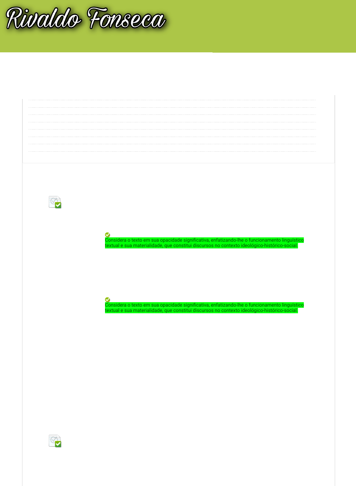Revisar envio do teste: QUESTIONÁRIO UNIDADE IANÁLISE DE DISCURSO CRÍTICA 7756-60_59624_R_E1_20231 CONTEÚDO Usuário xenia.bezerra @aluno.unip.br Curso ANÁLISE DE DISCURSO CRÍTICA Teste QUESTIONÁRIO UNIDADE I Iniciado 17/03/23 07:56 Enviado 17/03/23 08:18 Status Completada Resultado da tentativa 3 em 3 pontos Tempo decorrido 21 minutos Resultados exibidos Todas as respostas, Respostas enviadas, Respostas corretas, Comentários, Perguntas respondidas incorretamente Pergunta 1 Resposta Selecionada: c. Respostas: a. b. c. d. e. Feedback da resposta: A Análise do Discurso surgiu na França, nos anos de 1960, para suprir as insuficiências da análise de conteúdo (das ciências humanas), que concebia o texto em sua transparência, como representação da realidade no mundo (extradiscursivo) sem considerar as relações linguístico-textuais com as práticas ideológicas em sua exterioridade. Nessa análise de conteúdo, atravessa-se o texto, buscando encontrar nele um sentido. A AD, ao contrário, considera o texto em outra perspectiva. Assinale a alternativa que explicita corretamente essa perspectiva. Considera o texto em sua opacidade significativa, enfatizando-lhe o funcionamento linguístico- textual e sua materialidade, que constitui discursos no contexto ideológico-histórico-social. Os sentidos produzidos nos textos não vão muito além da sua literalidade lexical e nem estão marcados pela sua historicidade na memória enunciativo-discursiva. A produção de sentidos nos textos não relaciona os elementos linguísticos à sua exterioridade discursiva. Considera o texto em sua opacidade significativa, enfatizando-lhe o funcionamento linguístico- textual e sua materialidade, que constitui discursos no contexto ideológico-histórico-social. Toma como maior unidade de análise linguística e textual a frase (e não o texto, o discurso, a enunciação). Investiga o texto com base no estruturalismo, que via o texto em sua imanência. Resposta: C Comentário: O texto é considerado em sua opacidade significativa (e não em sua transparência ) para que seja possível a investigação das questões linguístico-textuais considerando o contexto ideológico-histórico-social. Pergunta 2 Na perspectiva discursiva francesa, há geralmente duas forças que trabalham continuamente o dizer, de tal modo que todo discurso se faz nessa tensão: entre o mesmo e o diferente. Se toda a vez que falamos, ao tomar a palavra, produzimos uma mexida na rede de filiação dos sentidos, no entanto, falamos com palavras já ditas. É nesse jogo entre o mesmo e o diferente, entre o já dito e o a se dizer, que os sujeitos e os sentidos se movimentam, fazem seus percursos, significam. (ORLANDI, E. Análise de Discurso: Princípios e Procedimentos. SP: Pontes,1999.) Assinale a alternativa correta: Como se denominam esses processos que têm a ver com “o mesmo” e “o diferente”? CONTEÚDOS ACADÊMICOS BIBLIOTECAS MURAL DO ALUNO TUTORIAIS LABORATÓRIOS xenia.bezerra @aluno.unip.br UNIP EAD 0,3 em 0,3 pontos 0,3 em 0,3 pontos QUESTIONÁRIO UNIDADE I ANÁLISE DISCURSO CRÍTICA UNIP 2023 http://company.blackboard.com/ https://ava.ead.unip.br/webapps/blackboard/execute/courseMain?course_id=_286382_1 https://ava.ead.unip.br/webapps/blackboard/content/listContent.jsp?course_id=_286382_1&content_id=_3387165_1&mode=reset https://ava.ead.unip.br/webapps/portal/execute/tabs/tabAction?tab_tab_group_id=_25_1 https://ava.ead.unip.br/webapps/portal/execute/tabs/tabAction?tab_tab_group_id=_27_1 https://ava.ead.unip.br/webapps/portal/execute/tabs/tabAction?tab_tab_group_id=_47_1 https://ava.ead.unip.br/webapps/portal/execute/tabs/tabAction?tab_tab_group_id=_29_1 https://ava.ead.unip.br/webapps/portal/execute/tabs/tabAction?tab_tab_group_id=_64_1 https://ava.ead.unip.br/webapps/portal/execute/tabs/tabAction?tab_tab_group_id=_10_1 https://ava.ead.unip.br/webapps/login/?action=logout Resposta Selecionada: d. Respostas: a. b. c. d. e. Feedback da resposta: Paráfrase, polissemia. Assujeitamento, intradiscurso. Formação ideológica, formação discursiva. Polissemia, interdiscurso. Paráfrase, polissemia. Interpretação, polissemia. Resposta: D Comentário: A paráfrase é responsável pela produtividade na língua, porque, ao enunciar um discurso, o sujeito resgata um dizer que já está estabelecido na memória e o reformula. A polissemia é o deslocamento, a ruptura, a emergência do diferente e da multiplicidade de sentidos no discurso. Pergunta 3 Resposta Selecionada: b. Respostas: a. b. c. d. e. Feedback da resposta: A AD, mais do que simplesmente fazer parte do arcabouço teórico da linguística, opta epistemologicamente pelos mecanismos de análise linguística, mas sem restringir-se apenas a eles – “é preciso ser linguista e deixar de sê-lo ao mesmo tempo” (MAINGUENEAU, 1997). Assim sendo, Orlandi (2007) sintetiza um pouco mais sistemática e especificamente as balizas teórico-epistemológicas da AD, as quais podem ser desenhadas a partir de três rupturas teórico-filosóficas que estabelecem novos campos de saber. Marque a alternativa que apresenta corretamente essas três rupturas: Marxismo, linguística e psicanálise. Linguística, teorias do texto e psicanálise. Marxismo, linguística e psicanálise. Pragmática, psicanálise e marxismo. Teorias da enunciação, linguística aplicada, marxismo. Psicanálise, linguística e Análise de Discurso Crítica. Resposta: B Comentário: Influência do pensamento marxista por meio de Althusser; a influência da psicanálise freudiana por meio de Lacan: influência da linguística estrutural (a AD apoia-se criticamente em Saussure), reconhecendo nele o ponto de origem da ciência linguística, mas afirma que o estruturalismo saussuriano não dá conta da semântica discursiva e de suas condições sociohistóricas de produção e constituição. Pergunta 4 Resposta Selecionada: e. Respostas: a. Em Análise de Discurso: Princípios e Procedimentos, Eni 