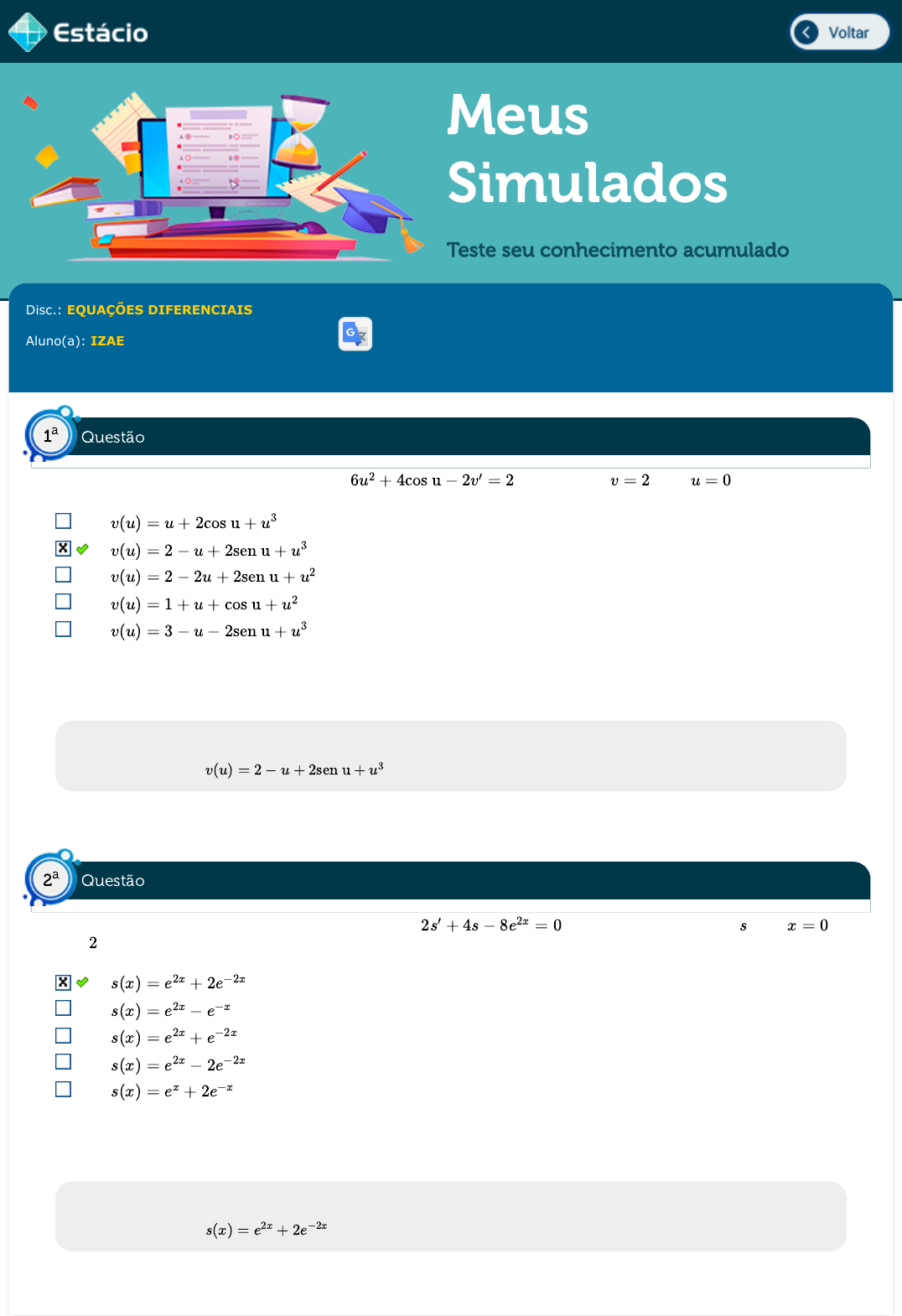 25/03/2023, 23:10 Estácio: Alunos https://simulado.estacio.br/alunos/ 1/5 Meus Simulados Teste seu conhecimento acumulado Disc.: EQUAÇÕES DIFERENCIAIS Aluno(a): IZAEL OLIVEIRA BORGES 202201178124 Acertos: 10,0 de 10,0 25/03/2023 Acerto: 1,0 / 1,0 Obtenha a solução da equação diferencial que atenda a para : Respondido em 25/03/2023 19:19:52 Explicação: A resposta correta é: Acerto: 1,0 / 1,0 Obtenha a solução particular da equação diferencial , sabendo que o valor de pata vale : Respondido em 25/03/2023 19:14:48 Explicação: A resposta correta é: 6u2 + 4cos u − 2v′ = 2 v = 2 u = 0 v(u) = u + 2cos u + u3 v(u) = 2 − u + 2sen u + u3 v(u) = 2 − 2u + 2sen u + u2 v(u) = 1 + u + cos u + u2 v(u) = 3 − u − 2sen u + u3 v(u) = 2 − u + 2sen u + u3 2s′ + 4s − 8e2x = 0 s x = 0 2 s(x) = e2x + 2e−2x s(x) = e2x − e−x s(x) = e2x + e−2x s(x) = e2x − 2e−2x s(x) = ex + 2e−x s(x) = e2x + 2e−2x Questão1 a Questão2 a https://simulado.estacio.br/alunos/inicio.asp javascript:voltar(); 25/03/2023, 23:10 Estácio: Alunos https://simulado.estacio.br/alunos/ 2/5 Acerto: 1,0 / 1,0 Determine a solução da equação diferencial para . Respondido em 25/03/2023 19:21:15 Explicação: A resposta correta é: Acerto: 1,0 / 1,0 Resolva a equação diferencial com e . Respondido em 25/03/2023 19:22:58 Explicação: A resposta correta é: Acerto: 1,0 / 1,0 Determine a soma da série associada à sequência . A série se inicia para Respondido em 25/03/2023 19:09:36 2x2y ′′ + 6xy ′ + 2y = 0 x > 0 y = + lnx, a e b reais. a x b x y = aex + bxex, a e b reais. y = − lnx, a e b reais.2a x 1 x y = ax + , a e b reais. b x y = aln(x2) + , a e b reais. b x y = + lnx, a e b reais.a x b x y ′′ − 2y ′ = sen(4x) y(0) = 1 40 y ′(0) = 9 5 y = 1 − e2x − cos4x − sen(4x) 1 40 1 20 y = e2x − 1 + cos4x − sen(4x)1 20 1 40 y = 1 + e2x − cos4x + sen(4x)1 40 1 20 y = e2x − 1 + cos4x − sen(4x) 1 40 1 20 y = 1 + e2x + cos4x − sen(4x) 1 20 1 20 y = e2x − 1 + cos4x − sen(4x)1 40 1 20 an = 3n−1 5n−1 n = 1 11 2 9 2 5 2 7 2 3 2 Questão3 a Questão4 a Questão5 a 25/03/2023, 23:10 Estácio: Alunos https://simulado.estacio.br/alunos/ 3/5 Explicação: A resposta correta é: Acerto: 1,0 / 1,0 Determine o raio e o intervalo de convergência, respectivamente, da série de potência Respondido em 25/03/2023 19:06:01 Explicação: A resposta correta é: Acerto: 1,0 / 1,0 Sabendo que a transformada de Laplace da função f(t) vale sendo n um número inteiro, obtenha a transformada de Laplace de e3t f(t). Respondido em 25/03/2023 18:59:51 Explicação: A resposta certa é: Acerto: 1,0 / 1,0 5 2 Σ∞1 (x+4)k (k+1)! 1 e ( − , ]1 2 1 2 ∞ e (−∞, ∞) e ( − , ]1 2 1 2 1 2 e ( − 1, ]1 2 1 2 0 e [ ]1 2 ∞ e (−∞, ∞) 1 (s2+4)(n+1) 1 (s2−6s+13)(n+1) s−4 (s2−6s+26)(n+1) s−4 (s2−6s+13)(n+4) 4 (s2+6s+26)(n+1) s (s2−6s+13)(n+1) 1 (s2−6s+13)(n+1) Questão6 a Questão7 a Questão 8 a 25/03/2023, 23:10 Estácio: Alunos https://simulado.estacio.br/alunos/ 4/5 Obtenha a transformada de Laplace da função g(t)= arctg(s) ln(2s) arctg + - arctg Respondido em 25/03/2023 18:58:10 Explicação: A resposta certa é: - arctg Acerto: 1,0 / 1,0 Um objeto com massa de 2 kg está em queda livre em um ambiente cuja constante de proporcionalidade da resistência do ar é de k Ns2/m. O objeto sai do repouso. Determine o valor de k sabendo que ele atinge uma velocidade máxima de 80 m/s. 0,35 0,15 0,50 0,25 1.00 Respondido em 25/03/2023 18:55:18 Explicação: A resposta certa é:0,25 Acerto: 1,0 / 1,0 Seja um circuito RC em série com resistência de 100Ω e capacitor de 1F. A tensão é fornecida por meio de uma fonte contínua de 50V ligada em t = 0s. Determine a corrente no capacitor após 2 s. 0,25 e -1 0,5 e - 0,5 e - 0,25 e - 0,25 e- Respondido em 25/03/2023 18:54:57 Explicação: A resposta certa é:0,25 e - sen(2t) t ( )22 π 2 π 2 ( )s 2 π 4 π 2 ( )s 2 1 100 1 50 1 50 1 100 1 50 Questão9 a Questão10 a 25/03/2023, 23:10 Estácio: Alunos https://simulado.estacio.br/alunos/ 5/5