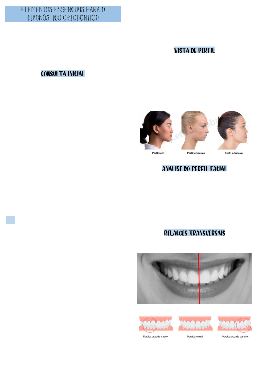 - Anamnese/entrevista com o paciente. - Exame clínico. - Avaliação dos exames complementares de diagnóstico. - Modelos, radiografias e fotografias. - Procedimento de coleta de dados. - Tentativa de diagnóstico. - Anamnese ou entrevista. - Estado geral do paciente. - Comportamento. - Histórico odontológico. - Preenchimento da ficha de consulta (considerações gerais): 1. Saúde bucal do paciente. 2. Estética da face. 3. Como está o alinhamento. 4. Relação entre o arco superior e arco inferior. 5. Como está o relacionamento transversal (presença de mordida cruzada ou não). 6. Mordida aberta. 7. Mordida profunda. OBS: - Descrever os problemas do paciente. - Economia de palavras. - Obter um quadro claro da situação. - Detalhar as principais características da maloclusão. - Avaliação da dentição: 1. Dentição decídua. 2. Dentição mista (ela é dividida em 3 momentos: 1º período transitório, período intertransitório e 2º período transitório). 3. Dentição permanente (existem maloclusões que se auto corrigem. Por exemplo, a mordida aberta anterior, se o fator etiológico for removido, até os 4 a 5 anos de idade, nós temos grandes chances do problema se corrigir sem que NADA seja feito). - Erupção dentária. - Cronologia. - Sequencia. - Nº de dentes irrompidos. Relação ântero-posteriores da face: - Ossos maxiliares. - Nariz, lábios e mento. Tônus muscular: - Selamento labial. - Relação ântero-posterior da maxila e da mandíbula com a face. - Relação dos lábios ao nariz e ao mento. - Bom posicionamento. - Protrusão. - Retrusão. - Avaliação das regiões transversais. - Linhas médias: coincidentes e desvios. - Mordidas cruzadas. - Sobremordida. - Overbite/transpasse vertical. - Mordida aberta. - Sobremordida exagerada. - Transpasse horizontal (overjet). - Classificação de maloclusões (ANGLE). 1. Classe I: 2. Classe II: (1ª divisão e 2ª divisão): 3. Classe III: - Transpasse horizonatal: 1. Overjet. 2. Sobressaliência. - Respiração. - Deglutição (lábios selados, sem contração da musculatura facial). - Fonação (sem interposição lingual entre os dentes). - ATM. - Hábitos parafuncionais: 1. Sucção digital. 2. Respiração bucal. 3. Bruxismo. 4. Onicofagia. 5. Morder lábios ou objetos. 6. Postura de língua em repouso. - Radiografias (panorâmica, periapicais, interproximais, cefalométrica – perfil e frontal). - Tomografia. - Fotografia (faciais – frente, perfil, sorriso; intrabucais – frente, laterais, oclusais). - Modelos. - Relações entre as dentições, maxilares e ATM. - Estágio de desenvolvimento dos dentes permanentes e reabsorções dos dentes decíduos. - Pesquisa de lesões patológicas. - Distorções e ampliação. - Sequência de erupção. - Ausência congênita de dentes. - Avaliação detalhada de cada dente e periápice. - Bitewing (pouca utilidade na análise ortodôntica). - Avaliação das relações entre a dentição e o esqueleto ósseo. - Estudo do crescimento craniofacial. - Planejamento do tratamento ortodôntico. - Alinhamento dentário, intercuspidação, forma do arco e do palato, simetria, forma dos dentes, rotações, inclinações axiais dos dentes. - Relações oclusais, linhas médias, inserção do freio. - Vista da oclusão por lingual.