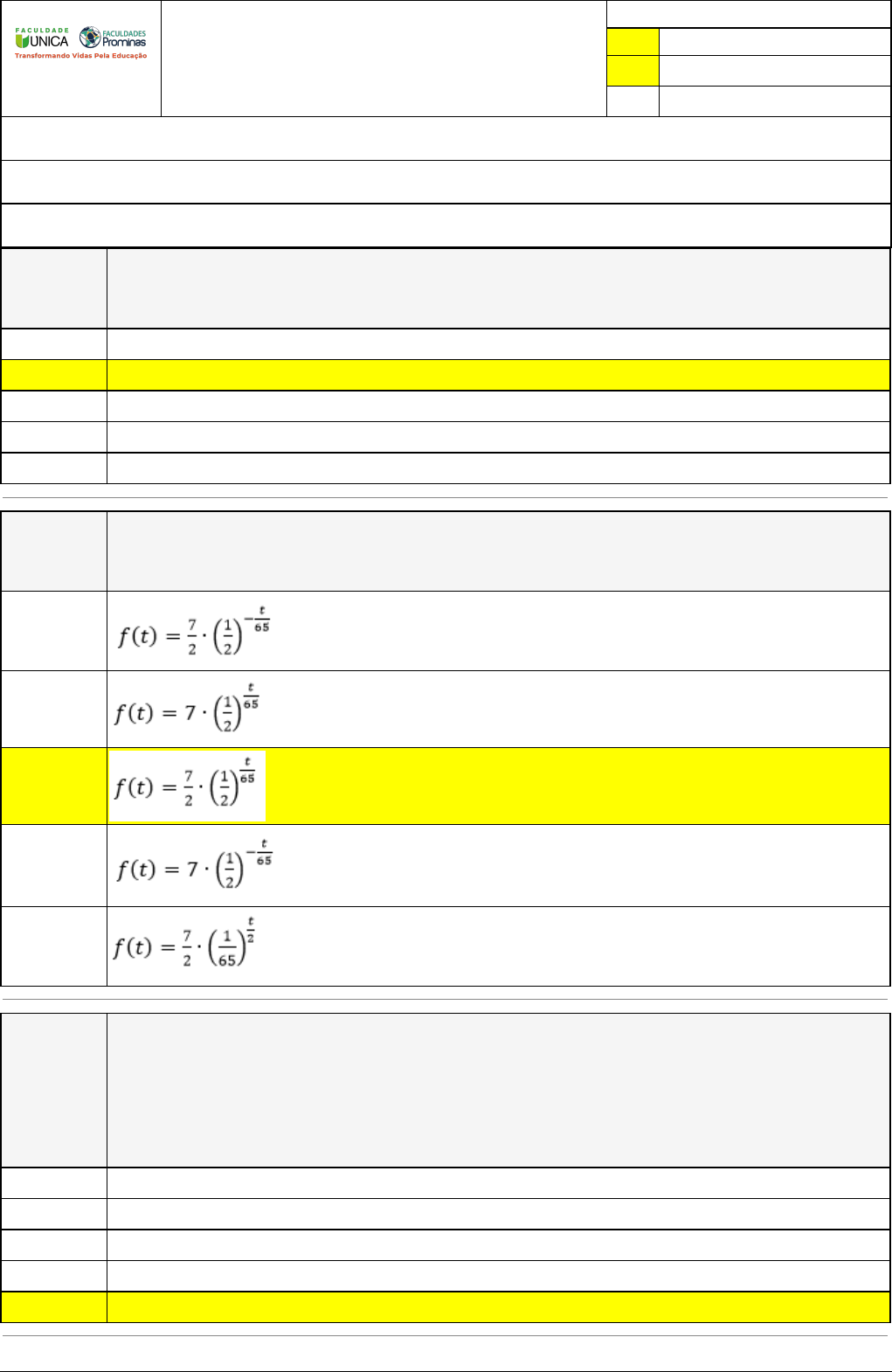 Pincel Atômico - 26/03/2023 12:16:05 1/3 CÂNDIDA RIBEIRO DA ROSA RANGEL Exercício Caminho do Conhecimento - Etapa 16 (21723) Atividade finalizada em 19/02/2023 18:24:25 (726405 / 1) LEGENDA Resposta correta na questão # Resposta correta - Questão Anulada X Resposta selecionada pelo Aluno Disciplina: FUNDAMENTOS DA MATEMÁTICA [785510] - Avaliação com 8 questões, com o peso total de 1,67 pontos [capítulos - 2] Turma: Segunda Graduação: Segunda Graduação 6 meses - Licenciatura em Matemática - Grupo: FPD-FEV2022 - SGegu0A271222 [80645] Aluno(a): 91389563 - CÂNDIDA RIBEIRO DA ROSA RANGEL - Respondeu 3 questões corretas, obtendo um total de 0,63 pontos como nota [359498_139466] Questão 001 Um investimento de R$ 8700,00 ocorre a uma taxa de juros de 3% ao mês. Qual deve ser o prazo da aplicação com arredondamento para o inteiro mais próximo, para que esse investimento atinja o valor de R$ 11.000,00? 70 meses. X 8 meses. 7meses. 11 meses. 80 meses. [359498_139459] Questão 002 A meia vida de uma substância radioativa é igual a 65 dias. Inicialmente há 3,5 gramas. A alternativa que representa a quantidade remanescente como função do tempo é: X [359500_139309] Questão 003 (Cefet - MG - 2015) Um motorista de táxi cobra, para cada corrida, uma taxa fixa de R$ 5,00 e mais R$ 2,00 por quilômetro rodado. O valor total arrecadado (R) num dia é função da quantidade total (x) de quilômetros percorridos e calculado por meio da função R(x) = ax + b, em que a é o preço cobrado por quilômetro e b, a soma de todas as taxas fixas recebidas no dia. Se, em um dia, o taxista realizou 10 corridas e arrecadou R$ 410,00, então a média de quilômetros rodados por corrida, foi de 14 20 22 16 X 18 Pincel Atômico - 26/03/2023 12:16:05 2/3 [359498_139441] Questão 004 (Prefeitura de Landri Sales – Auditor Fiscal- 2020) O domínio da função é dado por: X [359498_139463] Questão 005 X [359498_139468] Questão 006 A função é contínua e ímpar. Tem assíntotas horizontais em y=3 e y= -3. A função é periódica e crescente no intervalo de ] 0,2π [. X As raízes assume os valores O Máximo absoluto é 3. [359498_139448] Questão 007 Para as funções ƒ(x)=mx+b, com ƒ(- 2)=3 e ƒ(4)=1, os valores de m e b, respectivamente, são: X Pincel Atômico - 26/03/2023 12:16:05 3/3 [359499_139306] Questão 008 (PUC-SP) Numa certa cidade, o número de habitantes, num raio de r km a partir do seu centro é dado por P(r) = k . 23r, em que k é constante e r > 0. Se há 98 304 habitantes num raio de 5 km do centro, quantos habitantes há num raio de 3 km do centro? 1512 X 1550 1526 1519 1536