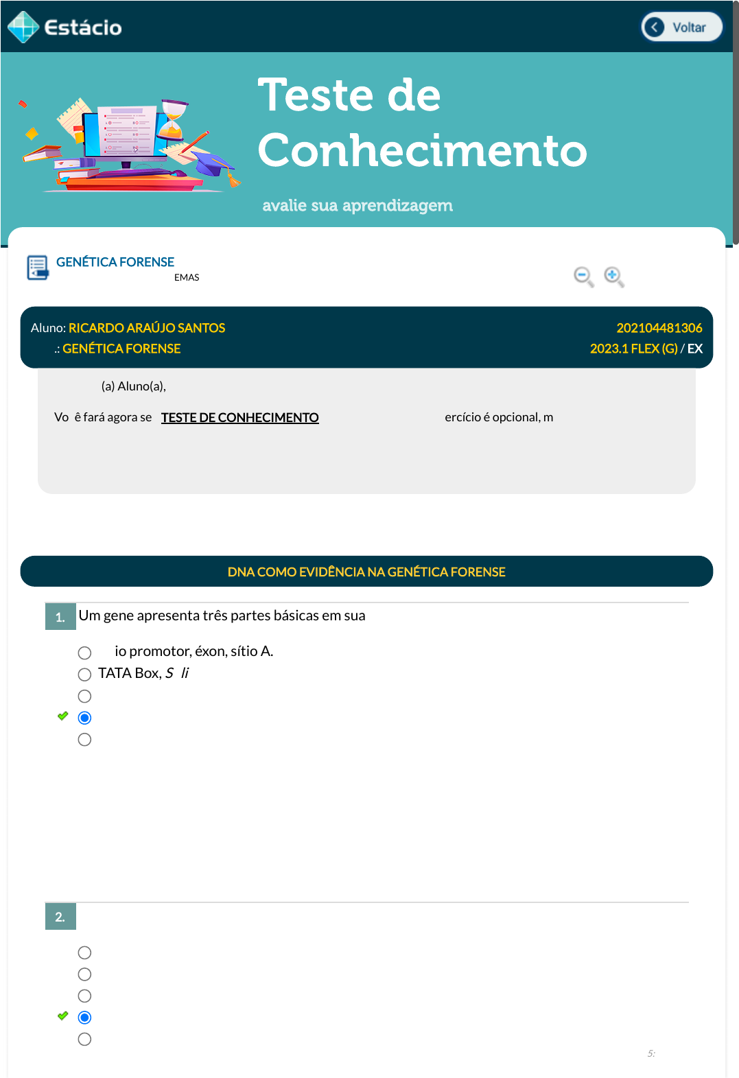 26/03/2023, 18:10 Estácio: Alunos https://simulado.estacio.br/alunos/ 1/1 Teste de Conhecimento avalie sua aprendizagem Um gene apresenta três partes básicas em sua estrutura. Essas partes são: No alongamento da tradução, os códons são lidos no ribossoma pelo sítio: GENÉTICA FORENSE Lupa DGT1005_202104481306_TEMAS Aluno: RICARDO ARAÚJO SANTOS Matr.: 202104481306 Disc.: GENÉTICA FORENSE 2023.1 FLEX (G) / EX Prezado (a) Aluno(a), Você fará agora seu TESTE DE CONHECIMENTO! Lembre-se que este exercício é opcional, mas não valerá ponto para sua avaliação. O mesmo será composto de questões de múltipla escolha. Após responde cada questão, você terá acesso ao gabarito comentado e/ou à explicação da mesma. Aproveite para se familiarizar com este modelo de questões que será usado na sua AV e AVS. DNA COMO EVIDÊNCIA NA GENÉTICA FORENSE 1. Sítio promotor, éxon, sítio A. TATA Box, Splicing e sítio promotor. Cabeça, tronco e membro. Sítio promotor, éxons e íntrons. Enhancer, fator de transcrição e éxons. Data Resp.: 26/03/2023 15:16:32 Explicação: A resposta correta é: Sítio promotor, éxons e íntrons. 2. Menor. C. P. A. Maior. Data Resp.: 26/03/2023 15:17:08 javascript:voltar(); javascript:voltar(); javascript:diminui(); javascript:aumenta();