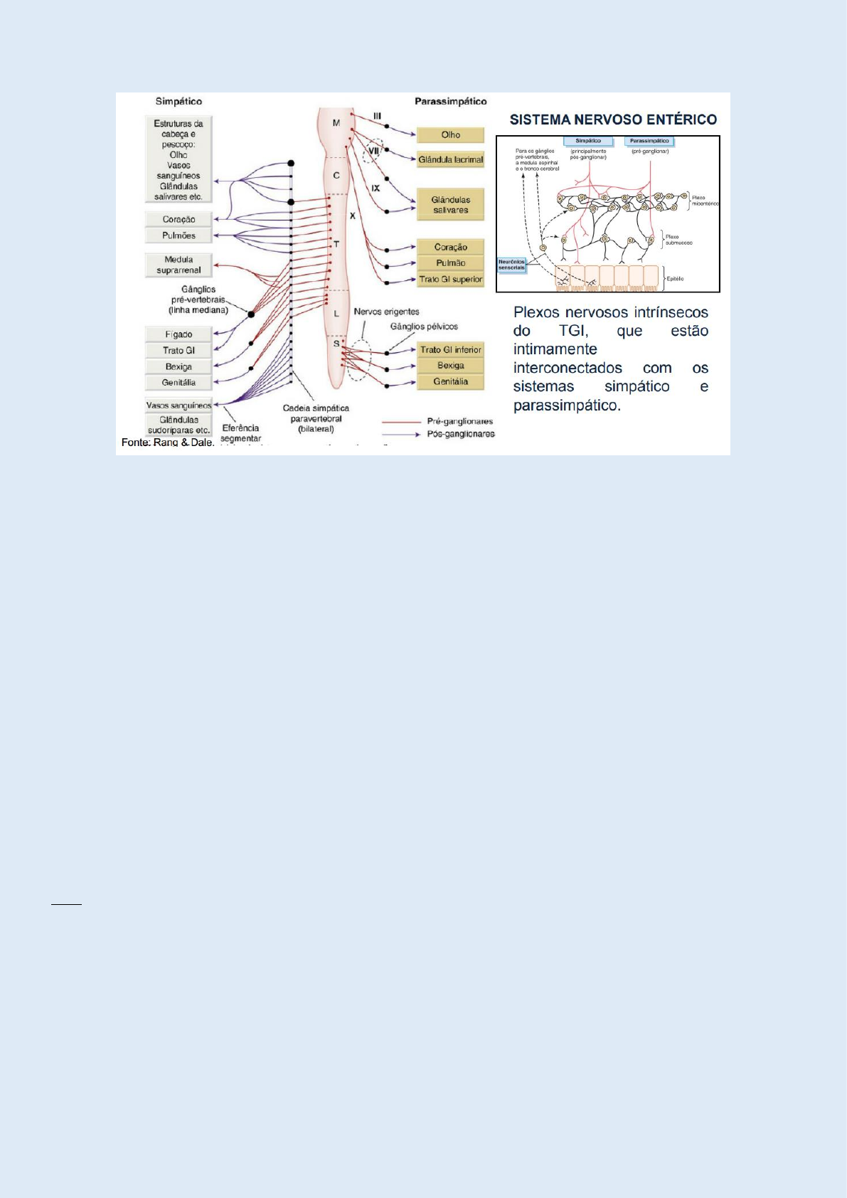 SISTEMA NERVOSO AUTÔNOMO  O sistema nervoso autônomo conduz todas as informações provenientes do sistema nervoso central para o restante do organismo, exceto para a inervação motora dos músculos esqueléticos.  O sistema nervoso entérico dispõe de recursos integrativos suficientes que possibilitam o seu funcionamento de modo independente do sistema nervoso central; no entanto, os sistemas simpático e parassimpático são agentes do sistema nervoso central e não são capazes de funcionar sem ele.  O sistema nervoso autônomo está em grande parte fora da influência do controle voluntário.  Os principais processos que ele regula são: o A contração e o relaxamento da musculatura lisa de vasos e vísceras. o Todas as secreções exócrinas e algumas endócrinas. o Os batimentos cardíacos. o O metabolismo energético, particularmente no fígado e nos músculos esqueléticos  Certo grau de controle autonômico também afeta muitos outros sistemas, que incluem os rins, o sistema imunológico e o sistema somatossensorial.  A via eferente autônoma consiste em dois neurônios dispostos em série;  Enquanto, no sistema motor somático, um único neurônio motor conecta o sistema nervoso central à fibra muscular esquelética OBS:  SNC: Sinapses estão situadas gânglios autônomos, que se localizam fora do SNC e contêm as terminações nervosas das fibras préganglionares e os corpos celulares dos neurônios pósganglionares.  PARASSIMPÁTICO: Nas vias parassimpáticas, as células pósganglionares são encontradas principalmente nos órgãos-alvo, e gânglios parassimpáticos isolados (por exemplo, gânglio ciliar) são encontrados apenas na cabeça e no pescoço. TRANSMISSORES:  Acetilcolina  PARASSIMPÁTICO  Norepinefrina (noradrenalina)  SIMPÁTICO RECEPTORES:  Todas as fibras nervosas autonômicas que deixam o sistema nervoso central liberam acetilcolina, que age nos receptores nicotínicos (embora, nos gânglios autônomos, uma pequena parte da estimulação seja resultante da ativação de  Todas as fibras parassimpáticas pós-ganglionares liberam acetilcolina, que age nos receptores muscarínicos.  Todas as fibras simpáticas pós-ganglionares (com uma exceção importante) liberam norepinefrina, que pode agir sobre receptores α ou β- adrenérgicos. o A única exceção consiste na inervação simpática das glândulas sudoríparas, em que a transmissão resulta da ação da acetilcolina sobre receptores muscarínicos. RECEPTORES DA ACETILCOLINA NICOTÍNICOS  Os receptores nicotínicos estão ligados diretamente a canais de cátions e medeiam a transmissão sináptica excitatória rápida na junção neuromuscular, nos gânglios autônomos e em vários locais do SNC. MUSCARÍNICOS  Os receptores muscarínicos estão acoplados à proteína G e produzem: o Ativação da fosfolipase C (e, consequentemente, a formação de trisfosfato de inositol e diacilglicerol como segundos mensageiros); o Inibição da adenilil ciclase; o Ativação dos canais de potássio ou inibição dos canais de cálcio. o Os receptores muscarínicos e nicotínicos são encontrados tanto na região pré-sináptica quanto na pós-sináptica e agem regulando a liberação do transmissor  Os receptores muscarínicos medeiam os efeitos da acetilcolina nas sinapses pós-ganglionares parassimpáticas (principalmente no coração, nos músculos lisos e nas glândulas) e contribuem para a estimulação ganglionar. São encontrados em muitas partes do SNC.  Há três tipos principais de receptores muscarínicos: o Receptores M1 (“neuronais”), que produzem a excitação lenta dos gânglios. São bloqueados de modo seletivo pela pirenzepina;  Perinzepina age como antagonista o Receptores M2 (“cardíacos”), que provocam a diminuição da frequência cardíaca e da força de contração (principalmente dos átrios). São bloqueados de modo seletivo pela galamina. Os receptores M2 também medeiam a inibição pré-sináptica; o Receptores M3 (“glandulares”), que são responsáveis por fenômenos como secreção, contração dos músculos lisos das vísceras e relaxamento vascular. A cevimelina é um agonista seletivo de M3.  Dois outros subtipos moleculares de receptores muscarínicos, M4 e M5, são encontrados principalmente no SNC.  Todos os receptores muscarínicos são ativados pela acetilcolina e bloqueados pela atropina. Há também agonistas e antagonistas seletivos para cada subtipo EFEITOS DE FÁRMACOS NA TRANSMISSÃO COLINÉRGICA: Alguns fármacos são capazes de influenciar a transmissão colinérgica tanto agindo como agonistas ou antagonistas sobre os receptores pós-sinápticos da acetilcolina quanto afetando a liberação ou a destruição da acetilcolina endógena:  Agonistas muscarínicos;  Antagonistas muscarínicos;  Fármacos estimulantes ganglionares;  Fármacos bloqueadores ganglionares;  Fármacos bloqueadores neuromusculares;  Anticolinesterásicos e outros fármacos que intensificam a transmissão colinérgica. *PILOCARPINA  colírio que leva à miose (constrição da pupila) – utilizado no tratamento de GLAUCOMA (aumento da pressão intraocular). Tanto a PILOCARPINA quanto o CEVIMELINA (agonista seletivo do M3) podem ser utilizados para aumentar a produção e secreção salivar e lacrimal em pacientes com boca e olhos secos (ex: após irritação ou em pacientes com lesão autoimune das glândulas salivares ou lacrimais, com a síndrome de sjogren) BETANECOL ou a DISTIGMINA (inibidor de colinesterase)  utilizados como laxativos estimulantes ou para estimular o esvaziamente da bexiga USO CLÍNICO DOS ANTAGONISTAS MUSCARÍNICOS  Cardiovascular: No tratamento da bradicardia sinusal (p. ex., após infarto agudo do miocárdio: atropina.  Oftálmico: Na dilatação da pupila: por exemplo, colírio de tropicamida ou ciclopentolato.  Neurológico: o Na prevenção da cinetose: por exemplo, hioscina (por via oral ou transdérmica). o No parkinsonismo, principalmente para neutrali
