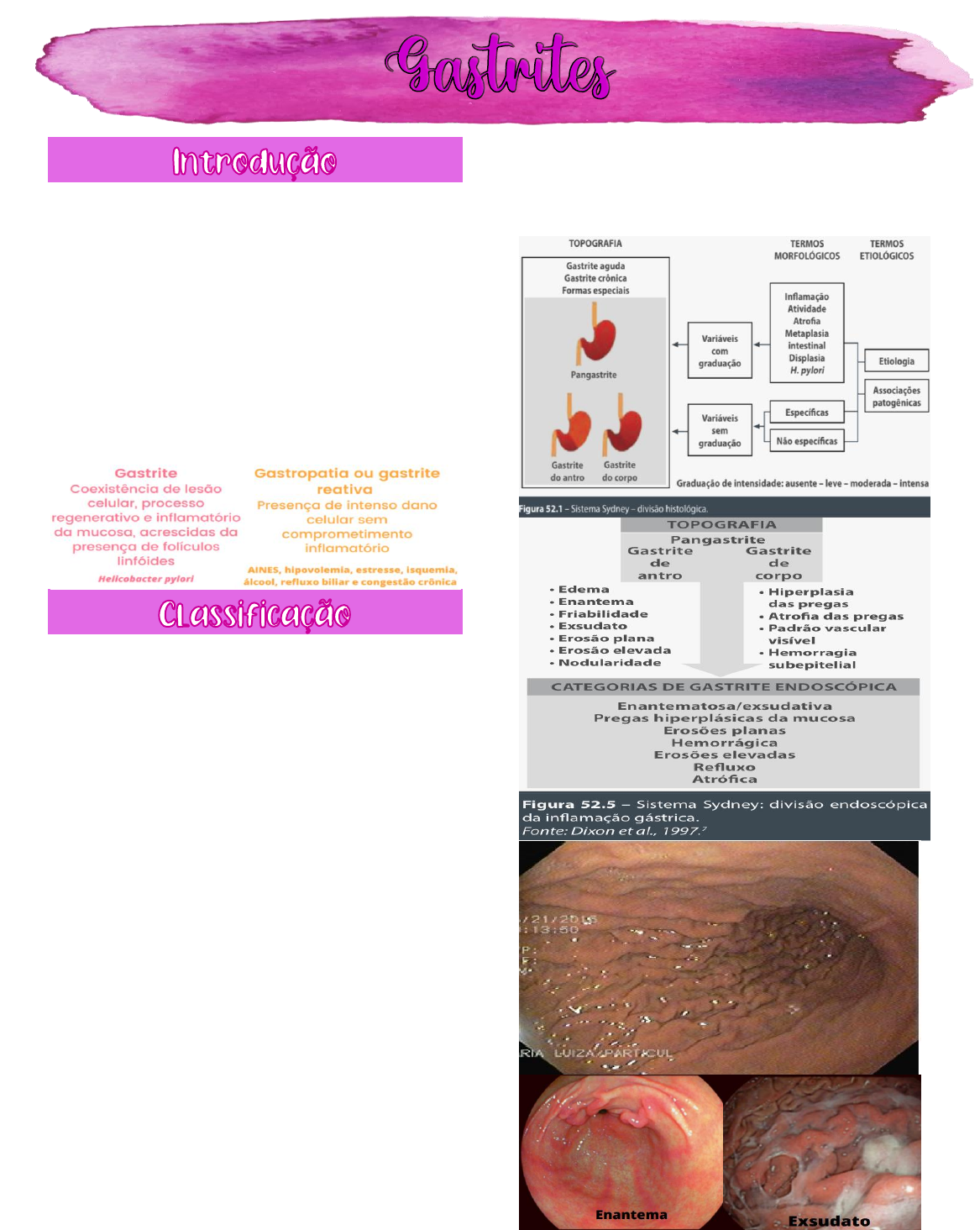 Lourdes Laryssa Melo da Costa Lôbo – Turma 09 UPE Garanhuns – Prática Médica V – Gastroenterologia 1 Inflamação do revestimento do estômago, as- sociada à lesão da mucosa gástrica. Caracterizada por presença de infiltrado leuco- citário inflamatório na mucosa gástrica, que pode ou não se associar a alterações endoscó- picas. Entidade histológica bem definida que, nor- malmente, é assintomática. Gastrite ≠ Dispepsia Helicobacter pylori é fator etiológico mais co- mum. Classificação de Sidney (endoscópica e histo- lógica); Aspectos morfológicos, topográficos e etioló- gicos; o Ramo topográfico: distribuição da gastrite (antro, corpo ou todo estômago). o Ramo morfológico: Gastrite aguda: geralmente, condição transi- tória. O diagnóstico baseia-se em um infil- trado inflamatório da mucosa predominan- temente de neutrófilos, sendo mínimo, se houver, o aumento de linfócitos e plasmóci- tos. Edema, erosões e hemorragia, são co- muns. Gastrite crônica: aumento de linfócitos e plasmócitos no interior da lâmina própria. A atividade da gastrite crônica é dada pelo in- filtrado de neutrófilos que pode acompa- nhá-la na lâmina própria, criptas gástricas e epitélio superficial. Formas especiais: variedade de entidades nas quais o epitélio ou o infiltrado inflama- tório tem um modelo reconhecido, com im- plicações clínicas ou patogênicas estabele- cidas, embora seja desconhecida a etiologia exata. Pode ser a manifestação gástrica de uma doença sistêmica. o Ramo etiológico: se houver (H. pylori, au- toimune etc.). Lourdes Laryssa Melo da Costa Lôbo – Turma 09 UPE Garanhuns – Prática Médica V – Gastroenterologia 2 Bacilo Gram-negativo secretor de urease (en- zima que converte a ureia em amônia, alcalini- zando o meio ambiente), que se adere à muco- sa gástrica. Incubação – 3 a 7 dias Duração de 3-4 semanas → evolução para gas- trite crônica Inicialmente afeta todo o estômago (pangastri- te aguda superficial). Pode ser totalmente assintomática ou se apre- sentar com dispepsia (dor epigástrica, náuseas e vômitos). Quadro clínico: dor epigástrica, plenitude pós-prandial, náuseas, vômitos, mal-estar, ce- faleia. Endoscopia: exantema, erosões, úlceras. Histopatológico: gastrite neutrofílica. Gastrite crônica leve: o Fenótipo mais comum; o Forma assintomática e sem repercussões clí- nicas no futuro. Gastrite antral crônica: o Associa-se à HIPERcloridria e à úlcera péptica (principalmente duodenal); o H. pylori danifica de forma seletiva células D do antro (somatostatina) → suprime o feed- back (-) deste hormônio sobre as células G (gastrina) → hipergastrinemia → estimula a secreção ácida do corpo e fundo gástrico (os quais se encontram livres de doença nesta forma de gastrite). Pangastrite crônica grave (atrófica) o Forma menos frequente; o Destruição e atrofia das glândulas oxínticas do corpo e fundo gástrico → HIPOcloridria; o Associa-se às úlceras gástricas, à metaplasia intestinal (lesão precursora do adenocarci- noma) e à hiperestimulação do tecido linfoi- de associado à mucosa, aumentando o risco de linfoma B de baixo grau (linfoma MALT do estômago). Em todas elas, o histopatológico revela gastrite linfocítica. Atrofia acentuada na área do estômago → bactéria perde seu nicho ecológico, formado pelas células mucosas, e desaparece. Lourdes Laryssa Melo da Costa Lôbo – Turma 09 UPE Garanhuns – Prática Médica V – Gastroenterologia 3 Antro – 1ª região acometida Distribuição no estômago → indicador do pa- drão de evolução da gastrite Geralmente assintomática Achado endoscópico: nodosidade antral (espe- cificidade 90%), enantema, erosão, úlceras. Evolução para gastrite atrófica e metaplasia intestinal → condições pré-malignas. Só pode ser estabelecido por biópsia gástrica; Não há correlação entre sintomas, aspecto endoscópico e gastrite no exame histológico. Histopatológico: especificidade e sensibilida- de. Múltiplos fragmentos de biópsias devem ser obtidos para explorar os diferentes comparti- mentos da mucosa. Recomendam-se, ao me- nos, 5 amostras: o Grande e pequena curvaturas do antro distal (mucosa mucossecretora); o Pequena curvatura na incisura angularis, na qual ocorrem principalmente as alterações atrófico-metaplásicas mais precocemente; o Paredes anterior e posterior do corpo proxi- mal (mucosa oxíntica). Erradicação do H. pylori. Tipo A: Gastrite atrófica autoimune – atrofia do corpo gástrico e preservação da mucosa antral e presença de anticorpo anti-cel parietal. Tipo B: Gastrite atrófica multifocal (H. pylori) – predominantemente antral sem a presença de anticorpo anti-cel parietal. Gastrite crônica restrita a mucosa fúndica, ca- racterizada pela atrofia intensa e difusa das glândulas cloridropépticas; Doença hereditária autossômica dominante; Presença de anticorpos anti-célula parietal (mais frequente) e anti-fator intrínseco (mais específico); Evolução para anemia perniciosa em 15-20% Coexiste com outras doenças autoimunes (Ti- reoidite autoimune, Vitiligo, DM tipo I, Doença celíaca, LES, AR, Hepatite autoimune, doença de Graves). Importante fator de risco para adenocarcinoma gástrico. Manifestações: Anemia, Pólipos gástricos (hi- perplásicos), ↑ risco de neoplasia gástrica (car- cinoides, adenocarcinoma). Anemia perniciosa: anemia macrocítica associ- ada com níveis baixos de cobalamina e gastrite atrófica de fundo/corpo, na presença de anti- corpo anticélula parietal e anti-fator intrínseco. Sintomas: Fraqueza, palpitações, parestesia, anormalidades neuropsiquiátricas, anemia ou pancitopenia. Tratamento: Suplementação de ferro e vitami- na B12; Erradicação de H. pylori se presente; Seguimento endoscópico a cada 3 anos. O antro é quase sempre envolvido; Lourdes Laryssa Melo da Costa Lôbo – Turma 09 UPE Garanhuns – Prática 