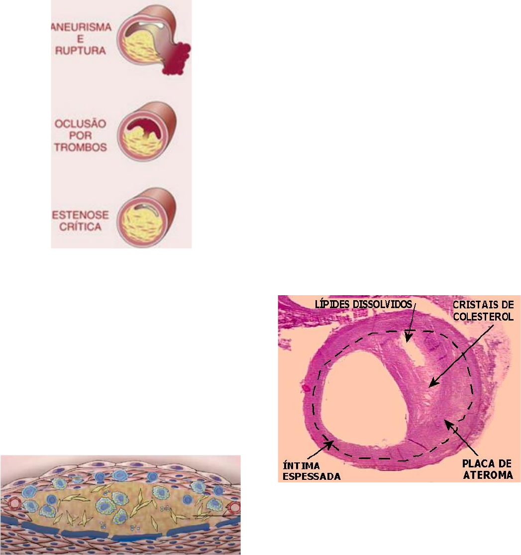 Aterosclerose A aterosclerose caracteriza-se por leso es, principalmente na camada intima do vaso, chamadas ateromas ou placas ateromatosas, que fazem protusa o na luz dos vasos, podendo ocluir a passagem sanguí nea. Ale m do crescimento progressivo da placa e, posterior, oclusa o do fluxo sanguí neo, as placas aterosclero ticas podem romper-se, causando uma trombose de vasos, e enfraquecer a camada me dia subjacente, levando a formaça o de um aneurisma. OBS: A placa ateromatosa e uma lesa o elevada com centro mole, amarelo e grumoso de lipí dios. Na imagem abaixo pode-se observar um desenho esquema tico de uma placa ateromatosa, em que e possí vel observar a capsula fibrosa, composta por ce lulas musculares lisas, ce lulas espumosas, linfo citos, cola geno, macro fagos e neovascularizaça o, um centro necrótico, composto por restos celulares, cristais de colesterol, ce lulas espumosas e ca lcio, e a camada média, ainda sem alteraço es. Os fatores de risco não modificáveis (constitucionais) sa o: idade, gênero e genética. Indiví duos mais velhos, do sexo masculino e com histo rico familiar de doença aterosclero tica possuem maior predisposiça o para o desenvolvimento de aterosclerose. No entanto, e importante destacar que na menopausa, a predisposiça o de indiví duos do sexo masculino e feminino se iguala. Os fatores de risco modificáveis incluem hiperlipidemia, hipertensão, tabagismo e diabetes. Patogenia da aterosclerose A aterosclerose e caracteriza como uma resposta a inflamaça o cro nica da parede arterial. Assim, a lesa o endotelial resulta no aumento da permeabilidade vascular, adesa o de leuco citos e trombose. A adesa o de mono citos ao endote lio e seguida de migraça o para a intima e transformaça o em macro fagos. Esses macro fagos ira o fagocitar os lipí dios na camada í ntima, e, com isso, va o se transformar em ce lulas espumosas. O acu mulo de ce lulas espumosas resulta na formaça o de estrias gordurosas, leso es precursoras da aterosclerose. Com a progressa o do quadro, ocorrera o recrutamento e proliferaça o das ce lulas musculares lisas, que tambe m englobam lipí dios, ale m da produça o de MEC e cola geno, responsa vel por estabilizar a placa e transformar as estrias gordurosas em ateromas maduros. A aterosclerose coronariana pode se apresentar de tre s formas: assintoma tica, cro nica e aguda. Na forma assintoma tica, o paciente na o apresenta sintomas, embora ja esteja com a doença aterosclero tica em esta gio inicial. A forma cro nica e a forma esta vel e pode perdurar por anos, manifestando-se apenas durante a realizaça o de esforços. A forma aguda esta relacionada com a instabilidade da placa de ateroma, evoluindo em um curto espaço de tempo e se manifestando em repouso (anina insta vel, infarto com supra ou infarto sem supra).