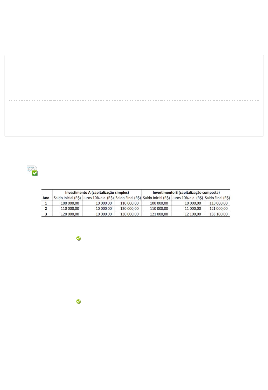 14/03/23, 20:26 Revisar envio do teste: QUESTIONÁRIO UNIDADE I – ... https://ava.ead.unip.br/webapps/assessment/review/review.jsp?attempt_id=_91378152_1&course_id=_264977_1&content_id=_3148195_1&retur… 1/7 Revisar envio do teste: QUESTIONÁRIO UNIDADE IMATEMÁTICA FINANCEIRA 4650-30_55821_R_E1_20231 CONTEÚDO Usuário leandro.vitorio @aluno.unip.br Curso MATEMÁTICA FINANCEIRA Teste QUESTIONÁRIO UNIDADE I Iniciado 14/03/23 19:49 Enviado 14/03/23 20:26 Status Completada Resultado da tentativa 5 em 5 pontos Tempo decorrido 36 minutos Resultados exibidos Todas as respostas, Respostas enviadas, Respostas corretas, Comentários, Perguntas respondidas incorretamente Pergunta 1 Resposta Selecionada: c. Respostas: a. b. c. d. e. Comentário da resposta: (ENADE 2015) O gerente �nanceiro de uma empresa de serviços analisou as opções de investimento A e B, apresentadas na tabela a seguir, sobre um capital de $ 100.000,00 no período de três anos. Em ambas as opções, os juros são capitalizados anualmente à taxa de 10% ao ano, segundo regimes de capitalização diferentes. Com base na análise dos dados apresentados, conclui-se que: O investimento B é mais atrativo, porque os juros são calculados sobre o montante, o qual inclui os juros do período anterior. O investimento A gerou para a empresa o valor de $ 30.000,00, o que corresponde à apuração de juros sobre juros, ao �nal do período de três anos. O investimento B é mais atrativo, porque os juros são calculados de forma linear e incidem sobre o capital inicial investido pela empresa. O investimento B é mais atrativo, porque os juros são calculados sobre o montante, o qual inclui os juros do período anterior. O investimento A é menos atrativo, porque os juros aumentaram a cada período de forma exponencial. O investimento A gera para a empresa montante inferior ao investimento B, ao �nal de cada ano. Resposta: C Comentário: Se analisarmos cada uma das a�rmações veremos que todas, com exceção da a�rmação da alternativa “c”, possuem algum erro: UNIP EAD BIBLIOTECAS MURAL DO ALUNO TUTORIAISCONTEÚDOS ACADÊMICOS 0,5 em 0,5 pontos http://company.blackboard.com/ https://ava.ead.unip.br/webapps/blackboard/execute/courseMain?course_id=_264977_1 https://ava.ead.unip.br/webapps/blackboard/content/listContent.jsp?course_id=_264977_1&content_id=_3147195_1&mode=reset https://ava.ead.unip.br/webapps/portal/execute/tabs/tabAction?tab_tab_group_id=_10_1 https://ava.ead.unip.br/webapps/portal/execute/tabs/tabAction?tab_tab_group_id=_27_1 https://ava.ead.unip.br/webapps/portal/execute/tabs/tabAction?tab_tab_group_id=_47_1 https://ava.ead.unip.br/webapps/portal/execute/tabs/tabAction?tab_tab_group_id=_29_1 https://ava.ead.unip.br/webapps/portal/execute/tabs/tabAction?tab_tab_group_id=_25_1 https://ava.ead.unip.br/webapps/login/?action=logout 14/03/23, 20:26 Revisar envio do teste: QUESTIONÁRIO UNIDADE I – ... https://ava.ead.unip.br/webapps/assessment/review/review.jsp?attempt_id=_91378152_1&course_id=_264977_1&content_id=_3148195_1&retur… 2/7 • Na alternativa “a” o valor dos juros, ao �nal de cada período, é o mesmo no valor de $ 10. 000,00 o que descarta a a�rmação juros sobre juros; • Na alternativa “b” os juros são calculados sobre o valor atualizado, ao �nal de cada período. Observe que os valores dos juros se alteram em cada ano; • Na alternativa “d” os juros se mantêm constantes, ou seja, não aumentam de forma exponencial; • Na alternativa “e”, somente a partir do segundo ano que o montante produzido por A é inferior ao montante produzido por B; Portanto, a a�rmação correta é a alternativa “c” que, de fato, os juros são calculados sobre o valor atualizado, ao �nal de cada período. Pergunta 2 Resposta Selecionada: e. Respostas: a. b. c. d. e. Comentário da resposta: No �nal de 2 anos, a empresa XYZ deverá efetuar um pagamento de $ 200.000,00, referente ao valor de um empréstimo contraído hoje, mais os juros compostos devidos, correspondente a uma taxa de 3% a.m. Qual foi o valor aproximado emprestado à empresa hoje? $ 98.386,75. $ 81.713,44. $ 85.584,65. $ 88.548,07. $ 93.911,17. $ 98.386,75. . Pergunta 3 Resposta Selecionada: b. Respostas: a. b. c. d. O banco KLM fez uma aplicação de $ 1.000.000,00 por 12 meses a uma taxa de 18% ao ano sob o regime de capitalização composta. O valor resgatado após os 12 meses foi de: $ 1.180.000,00. $ 1.188.100,00. $ 1.180.000,00. $ 1.192.200,00. $ 1.191.300,00. 0,5 em 0,5 pontos 0,5 em 0,5 pontos 14/03/23, 20:26 Revisar envio do teste: QUESTIONÁRIO UNIDADE I – ... https://ava.ead.unip.br/webapps/assessment/review/review.jsp?attempt_id=_91378152_1&course_id=_264977_1&content_id=_3148195_1&retur… 3/7 e. Comentário da resposta: $ 1.193.700,00. . Pergunta 4 Resposta Selecionada: a. Respostas: a. b. c. d. e. Comentário da resposta: Qual o montante auferido em uma aplicação de $ 50.058,80 em regime de juros compostos, pelo prazo de um ano, à taxa de 2,08% a.m.? $ 64.086,77. $ 64.086,77. $ 64.011,49. $ 63.936,28. $ 63.861,16. $ 63.786,11. . Pergunta 5 Resposta Selecionada: b. Respostas: a. b. Um banco anuncia o seguinte: "aplique hoje $ 10.000,00 e receba daqui a três anos $ 20.000,00". Qual a taxa paga pelo banco no triênio? 100%. 50%. 100%. 0,5 em 0,5 pontos 0,5 em 0,5 pontos 14/03/23, 20:26 Revisar envio do teste: QUESTIONÁRIO UNIDADE I – ... https://ava.ead.unip.br/webapps/assessment/review/review.jsp?attempt_id=_91378152_1&course_id=_264977_1&content_id=_3148195_1&retur… 4/7 c. d. e. Comentário da resposta: 150%. 200%. 250%. Resposta: B Comentário: Para o cálculo da taxa de correção, utilizamos uma das relações básicas da Matemátca Financeira: Pergunta 6 Um capital A de $ 1.000,00 é aplicado a juros simples, à taxa de 12% a.a., ao passo que um outro capital B, também de $ 1,000,00, é aplicado a juros compostos, à taxa de 10% a.a. Demonstre em um �uxo de caixa a partir de quantos