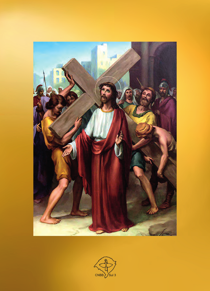 VIAS-SACRAS DA CRUZ E DA RESSURREIÇÃO APRESENTAÇÃO Muitos fiéis estão habituados a rezar a Via-Sacra da Cruz durante a Quaresma. É o caminho da dor de Jesus que as- sumiu nossas dores. Nela contemplam-se tantos crucifica- dos de ontem e de hoje que participam misteriosamente da Paixão de Cristo e de sua salvação. Percorre-se, assim, o caminho dAquele que disse: “Ninguém tem maior amor do que aquele que dá a vida por seus amigos”. (Jo 15, 13). Para o tempo pascal, a Igreja oferece a Via-Sacra da Res- surreição, para meditar as passagens bíblicas da Ressurrei- ção do Senhor. Diante de tantos sinais de morte do nosso tempo, a Via-Sacra da Ressurreição celebra e promove a vida que Deus nos oferece em Jesus. A morte foi vencida pelo Senhor da vida. A Via-Sacra da Cruz na Quaresma e a Via-Sacra da Res- surreição no Tempo Pascal, se unem formando uma só me- ditação sobre o mistério central da fé cristã: a paixão, morte e ressurreição do Senhor. Todo discípulo de Jesus Cristo reza e reflete sobre esse caminho pascal para se configurar ao Crucificado-ressusci- tado. E assim espera a feliz realização do Reino de Deus, para onde se orientam todos os caminhos de sua vida. 5 Sinal da Cruz ORAÇÃO Senhor Jesus, hoje nos repetis o que um dia dissestes a Pedro: “Segue-me!” Queremos seguir-vos passo a passo no caminho de vossa paixão. Amém! CANTO: Prova de amor maior não há, que doar a vida pelo irmão! 6 1ª ESTAÇÃO JESUS É CONDENADO À MORTE 7 Nós vos adoramos, Senhor Jesus Cristo e vos bendizemos! Porque pela vossa Santa Cruz remistes o mundo! LEITURA Logo de manhã, os sumos sacerdotes, com os anciãos, os escribas, isto é, o sinédrio inteiro, reuniram em conselho. Depois de algemarem Jesus, levaram-no e o entregaram a Pilatos (Mc 15,1). MEDITAÇÃO Jesus não se retrai, não se defende e nem foge, mas reúne todas as forças e põe em ação um amor sem limites. Tinha diante de si a causa, pela qual o Pai o havia enviado a este mundo: “Eu vim para que todos tenham vida e a tenham em abundância” (Jo 10,10). Pilatos, porém, age por interesses políticos e econômicos. ORAÇÃO Senhor Jesus, viestes ao mundo, não para condenar, mas para salvar. Porém, fostes condenado sem motivos e entregue por inveja. Hoje são tantas vidas condenadas à morte por sistemas políticos e econômicos injustos. Que cessem no mundo os gritos: “Seja crucificado!” Senhor Jesus, vós viveis e nos quereis vivos! Amém! CONTEMPLAÇÃO (Fazer um momento de silêncio contemplando a imagem). Canto: Contemplando este momento do inocente condenado, segue o servo sofredor, vence a angústia pelo amor. 8 2ª ESTAÇÃO JESUS CARREGA A CRUZ 9 Nós vos adoramos, Senhor Jesus Cristo e vos bendizemos! Porque pela vossa Santa Cruz remistes o mundo! LEITURA Os judeus responderam-lhe: “Nós temos uma Lei, e segundo esta Lei ele deve morrer, porque se fez Filho de Deus” (Jo 19,7). MEDITAÇÃO Santa Teresa de Calcutá nos diz: “Muitas vezes olhamos, mas não vemos nada! Todos nós temos que levar a cruz e seguir o Cristo ao calvário se quisermos nos encontrar com Ele”. Ele transforma a cruz que lhe foi imposta, como um castigo, em proposta de vida para quem quer segui-lo e investir na dignidade da vida. ORAÇÃO Senhor Jesus, vossa cruz é o ponto mais alto de vossa revelação. Nela assumistes o pecado do mundo e a força ameaçadora da morte. Em vossa cruz confirmastes do que é capaz o amor de Deus, que nos quer vivos. Senhor, estamos dispostos a assumir com fé a nossa cruz de cada dia e seguir o vosso caminho. Amém! CONTEMPLAÇÃO (Fazer um momento de silêncio contemplando a imagem). Canto: Contemplando a vossa cruz, de castigo um instrumento, Vossos ombros, ó Jesus, levam nosso sofrimento. 10 3ª ESTAÇÃO JESUS CAI PELA PRIMEIRA VEZ 11 Nós vos adoramos, Senhor Jesus Cristo e vos bendizemos! Porque pela vossa Santa Cruz remistes o mundo! LEITURA Entretanto, ele assumiu as nossas fraquezas, e as nossas dores, ele as suportou. E nós achávamos que ele era um castigado, alguém por Deus ferido e humilhado. Mas eles foi ferido por causa de nossas iniquidades, esmagado por causa de nossos crimes. O castigo que nos dá a paz caiu sobre e ele, por seus ferimentos fomos curados (Is 53,4-5). MEDITAÇÃO O Papa Francisco nos diz: “Também nos jovens estão os golpes, os fracassos, as tristes memórias gravadas na alma. São as feridas da própria história, dos desejos frustrados, das discriminações e injustiças sofridas de não se sentirem amados... Jesus se faz presente nessas cruzes dos jovens para oferecer-lhes alívio...” (Christus Vivit, 83). ORAÇÃO Senhor Jesus, sois o sinal e a imagem real de cada pessoa, que não consegue suportar o peso da cruz da indiferença e dos maus tratos. Convertei-nos para que possamos ver, ter compaixão e cuidar para que ninguém permaneça caído no caminho. Amém! CONTEMPLAÇÃO (Fazer um momento de silêncio contemplando a imagem). Canto: Contemplando a vossa queda renunciais à onipotência. Sois fiel em vosso amor, Deus humilde e sofredor! 12 4ª ESTAÇÃO JESUS ENCONTRA SUA MÃE 13 Nós vos adoramos, Senhor Jesus Cristo e vos bendizemos! Porque pela vossa Santa Cruz remistes o mundo! LEITURA Assim serão revelados os pensamentos de muitos corações. Quanto a ti, uma espada traspassará a tua alma” (Lc 2,35). MEDITAÇÃO Maria é sinal de esperança para os povos que sofrem as dores de parto. É a missionária que se aproxima de nós, para nos acompanhar ao longo da vida. Como uma verdadeira mãe, caminha conosco, luta conosco e aproxima-nos sem cessar do amor de Deus” (Alegria do Evangelho, 286). ORAÇÃO Ó Maria, vosso Filho revela as extremas consequências do amor pela vida de cada ser humano. Sois a primeira discípula da cruz. Cuidai de todos os órfãos da terra, protegei as mulheres vítimas da exploração e da violência. Suscitai mulheres corajosas e inspirai cada mãe a educar os filhos na ternura do amo