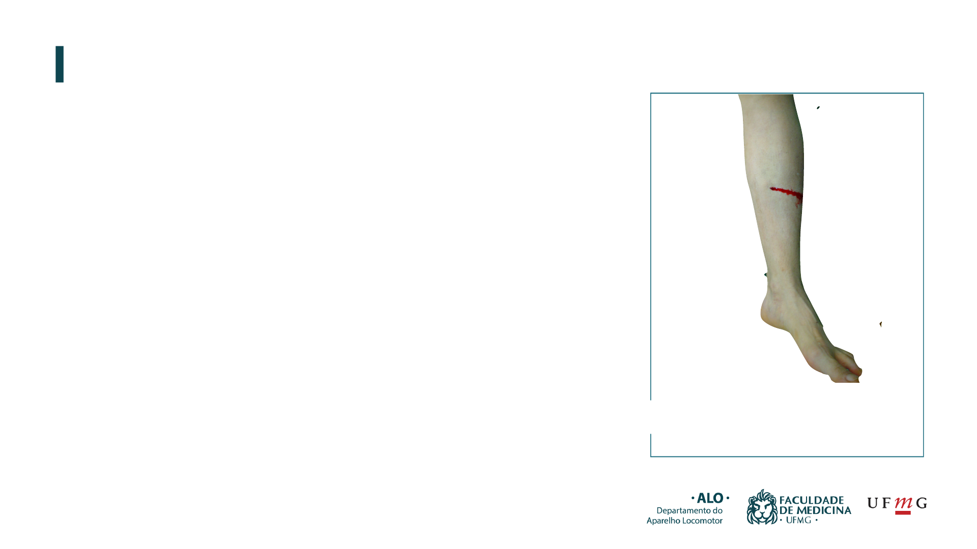 Caso clínico Paciente do gênero feminino, 30 anos, sofreu queda de um cavalo e apresentou dor na perna esquerda e impotência funcional. Ao exame físico, edema na perna e ferimento puntiforme na face anteromedial da perna, com sangramento ativo contendo gotículas de gordura. Figura 1: Radiografia do joelho direito em anteroposterior e perfil mostrando fratura do planalto tibial lateral com cisalhamento (seta amarela) e afundamento articular (seta vermelha) Figura 2: Radiografia dos ossos da perna esquerda em anteroposterior e perfil mostrando fratura diafisária da tíbia e fíbula esquerdas. A fratura da tíbía apresenta traço simples, oblíquo curto, com desvios lateral e anterior. Segundo a classificação AO, esta fratura é classificada como 42A2, pois a obliquidade do traço de fratura é maior que 30º. Diagnóstico: Fratura exposta dos ossos da perna esquerda •A fratura exposta é uma urgência ortopédica •A ferida deve ser coberta com gaze estéril e o membro deve ser imobilizado, provisoriamente. •A exploração da ferida e limpeza da mesma na sala de urgência estão contra-indicados. •A utilização precoce de antimicrobianos é fator prognóstico importante na prevenção da osteomielite pós- traumática. •É importante a avaliação da cobertura antitetânica •O tratamento é cirúrgico: desbridamento, irrigação com soro fisiológico e fixação da fratura Mensagens