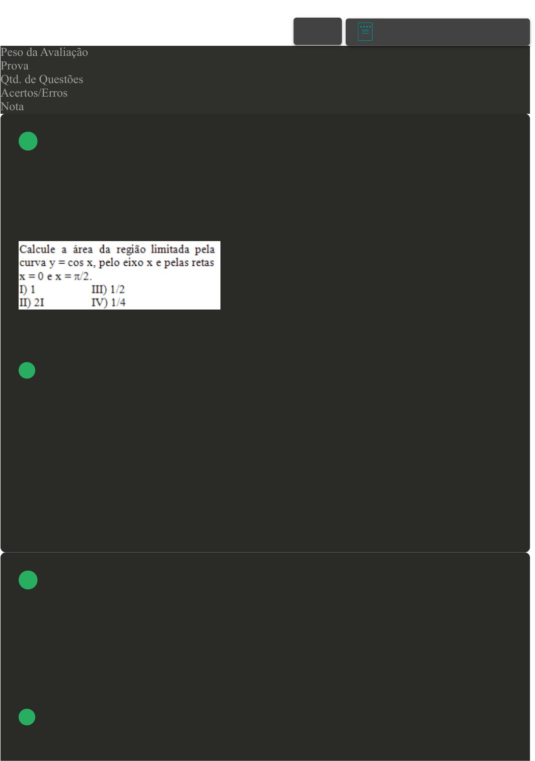 27/03/2023, 20:21 Avaliação II - Individual about:blank 1/7 Prova Impressa GABARITO | Avaliação II - Individual (Cod.:823822) Peso da Avaliação 1,50 Prova 60576642 Qtd. de Questões 10 Acertos/Erros 9/1 Nota 9,00 No cálculo, a integral de uma função foi criada originalmente para determinar a área sob uma curva no plano cartesiano e também surge naturalmente em dezenas de problemas de Física. Resolva a questão a seguir: Assinale a alternativa CORRETA: A Somente a opção I está correta. B Somente a opção IV está correta. C Somente a opção II está correta. D Somente a opção III está correta. Para levantar um corpo estamos realizando uma ação contrária à força peso (P) do corpo, contrária da gravidade. Sabemos, pela segunda lei de Newton, que o peso é calculado por P = m.g. O trabalho realizado para o caso em questão é: W = F.d. Determine o trabalho realizado sobre um corpo de 60kg por uma distância vertical de 10m. Utilizar g=10m/s² e assinale a alternativa CORRETA: A 6000 J. VOLTAR A+ Alterar modo de visualização 1 2 27/03/2023, 20:21 Avaliação II - Individual about:blank 2/7 B 6400 J. C 6640 J. D 6220 J. Calcule a área da região limitada pelas curvas y = 9 - x² e y = 0. Assinale a alternativa CORRETA que apresenta esse resultado: A Área igual a 24 u.a. B Área igual a 36 u.a. C Área igual a 27 u.a. D Área igual a 32 u.a. Resolva a questão a seguir. Assinale a alternativa CORRETA: A Somente a opção IV está correta. B Somente a opção III está correta. 3 4 27/03/2023, 20:21 Avaliação II - Individual about:blank 3/7 C Somente a opção I está correta. D Somente a opção II está correta. Uma das aplicações do conceito de integração é o cálculo da área entre curvas. Este procedimento permite que sejam calculadas áreas que antes, com a utilização da geometria clássica, eram inacessíveis. Sendo assim, determine a área entre as curvas y = x² e y = 2x e analise as opções a seguir: I- A área entre as curvas é 4/3. II- A área entre as curvas é 8/3. III- A área entre as curvas é 1/6. IV- A área entre as curvas é 15/4. Assinale a alternativa CORRETA: A Somente a opção II está correta. B Somente a opção I está correta. C Somente a opção III está correta. D Somente a opção IV está correta. Um estudo indicou que o custo C(x), em milhares de reais, para a produção de x unidades de certo equipamento industrial é dado por C(x) = 0,02x³ + 0,6x² - 0,4x + 20: 5 6 27/03/2023, 20:21 Avaliação II - Individual about:blank 4/7 Assinale a alternativa CORRETA: A 1168. B 3000. C 2290. D 1790. Uma das aplicações clássicas dentro da análise de integração é o cálculo de área. Neste sentido, leia a questão a seguir. 7 27/03/2023, 20:21 Avaliação II - Individual about:blank 5/7 Assinale a alternativa CORRETA: A A opção III está correta. B A opção IV está correta. C A opção II está correta. D A opção I está correta. A construção da Usina Hidrelétrica de Itaipu no rio Paraná, na fronteira entre o Brasil e o Paraguai, iniciou-se na década de 1970, mais precisamente em Janeiro de 1975. Nesta época, não existiam ferramentas computacionais para representar os desenhos referentes à planta de construção da usina e nem para realizar cálculos com tamanha exatidão e rapidez. Na época, a importância dos matemáticos era grande e foi necessária a atuação de um deles para a determinação do comprimento correto da barragem da usina. Sabe-se geometricamente, através do desenho da planta da usina, constatou que a função matemática que mais se aproximava da curva representativa da barragem da Usina era f(x) = ln (cos x) em que f(x) é dado em km. Com base nessas informações, qual das alternativas representa o valor provável do comprimento da barragem da usina, sabendo-se que o valor de x da função f(x) varia de pi/6 a pi/4? 8 27/03/2023, 20:21 Avaliação II - Individual about:blank 6/7 A 0,8813 km. B 0,6640 km. C 0,3320 km. D 0,5493 km. No cálculo, a integral de uma função foi criada originalmente para determinar a área sob uma curva no plano cartesiano e também surge naturalmente em dezenas de problemas de Física. Calcule a área limitada por y = 2x, o eixo x e as retas x = 1 e x = 4 através da integração. A Área = 16. B Área = 15. C Área = 10. D Área = 12. O cálculo de área de figuras irregulares também pode ser analisado pelo conceito de integral. 9 10 27/03/2023, 20:21 Avaliação II - Individual about:blank 7/7 Desse modo, assinale a alternativa CORRETA: A Somente a opção II está correta. B Somente a opção III está correta. C Somente a opção I está correta. D Somente a opção IV está correta. Imprimir