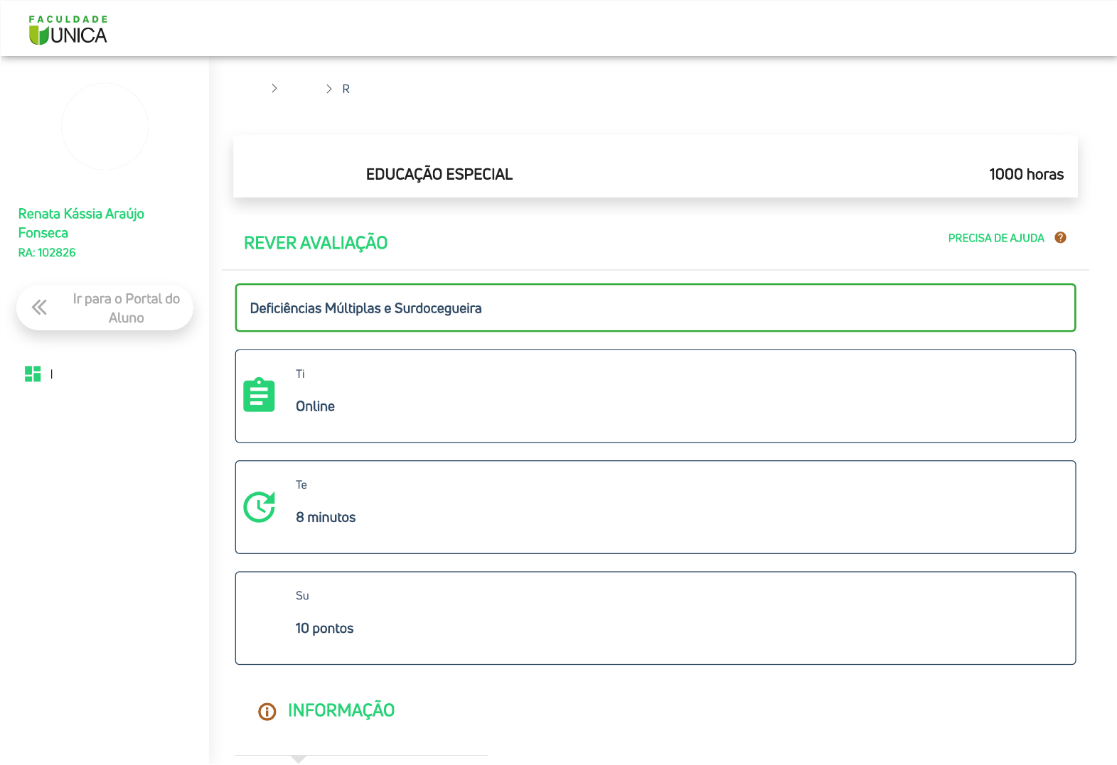 11/12/2022 14:23 Rever Avaliação https://ava.institutoprominas.com.br/notas/rever-avaliacao 1/5 Pós-Graduação Curso EDUCAÇÃO ESPECIAL Carga Horária 1000 horas Início Notas Rever Avaliação REVER AVALIAÇÃO PRECISA DE AJUDA Deficiências Múltiplas e Surdocegueira Tipo de avaliação: Online Tempo utilizado: 8 minutos Sua nota de avaliação 10 pontos INFORMAÇÃO Ir para o Portal doAluno Renata Kássia Araújo Fonseca RA: 102826 Início Avaliações TCC Material Didático Notas Agenda Educacional Simulados Curso Preparatório https://ava.institutoprominas.com.br/dashboard https://ava.institutoprominas.com.br/notas https://alunos.institutoprominas.com.br/ https://ava.institutoprominas.com.br/dashboard https://ava.institutoprominas.com.br/atividades javascript:; https://ava.institutoprominas.com.br/material-didatico https://ava.institutoprominas.com.br/notas https://ava.institutoprominas.com.br/agenda-educacional https://ava.institutoprominas.com.br/simulados https://ava.institutoprominas.com.br/preparatorio https://ava.institutoprominas.com.br/sala-de-estudos https://ava.institutoprominas.com.br/ 11/12/2022 14:23 Rever Avaliação https://ava.institutoprominas.com.br/notas/rever-avaliacao 2/5 A contestação da questão poderá ser feita em até 7 dias após a realização da avaliação, clicando em "contestar questão", após este prazo não será mais permitido realizar a contestação. Descreva o porquê não concorda com o gabarito de cada questão baseando-se no material didático fornecido. 1 Qual das opções completa a lacuna do enunciado abaixo? “O uso da tecnologia assistiva favorece a autonomia e a independência das crianças surdocegas e com deficiências múltiplas e as auxilia na exploração dos ambientes.” “O _____________ desenvolve o movimento da criança que apresenta graves dificuldades motoras para agarrar ou para mover-se de um lado para outro”. Sua Resposta: quartito; Resposta correta: quartito; 2 Ao modelo de sistema baseado em sinais gráficos simples, fundamentados no significado, podendo ser utilizados por meio de selos adesivos, prancha de comunicação ou por programa informatizado, dá-se o nome de: Sua Resposta: sistema Bliss. Resposta correta: sistema Bliss. Sala de Estudos https://ava.institutoprominas.com.br/sala-de-estudos https://ava.institutoprominas.com.br/sala-de-estudos 11/12/2022 14:23 Rever Avaliação https://ava.institutoprominas.com.br/notas/rever-avaliacao 3/5 3 Relacione as colunas em relação a surdocegueira e marque a sequência correta: 1- Surdocegos com baixo desempenho 2- Surdocegos com nível intermediário 3- Surdo cegos com bom desempenho ( ) são resistentes ao contato físico; não têm comunicação efetiva; apresentam comportamentos estereotipados ou autistas; se auto estimulam no âmbito proprioceptivo e cinestésico também podem se auto estimular sexualmente quando se encontram em ociosidade; não têm conhecimento de pessoas e objetos a sua volta, não têm conhecimento de rotina; não lidam com frustrações; apresentam atraso neuropsicomotor por falta de estimulação; têm dificuldade para se alimentar e rejeitam alimentos sólidos, têm dificuldade para aceitar o uso de óculos e de aparelho auditivo. ( ) demonstram boa funcionalidade dos resíduos auditivo e visual e aproveitamento dos sentidos remanescentes; já têm conhecimento de rotina; demonstram mais progressos no desenvolvimento psicomotor; adaptam-se aos óculos e ao aparelho auditivo; apresentam alguma comunicação gestual ou representativa e possibilidade de aprender ( ) Ainda apresentam comportamentos estereotipados; não têm forma estruturada de comunicação, mas já demonstram alguma intenção comunicativa, seja por gestos ou por movimentos corporais; utilizam os resíduos dos sentidos que são funcionais; começam a conseguir lidar com alguns estímulos novos e diferenciados; podem apresentar hiperatividade; têm alguma independência em atividades de vida diária; ainda apresentam dificuldades com a alimentação, principalmente a sólida. Sua Resposta: 1-3-2 Resposta correta: 1-3-2 Sobre a avaliação de crianças com deficiência múltipla ou surdocegueira, é correto afirmar, exceto, que: 11/12/2022 14:23 Rever Avaliação https://ava.institutoprominas.com.br/notas/rever-avaliacao 4/5 4 Sua Resposta: o modelo mais adequado de avaliação dessas crianças é aquele que envolve única e exclusivamente a equipe de professores especialistas em AEE. Resposta correta: o modelo mais adequado de avaliação dessas crianças é aquele que envolve única e exclusivamente a equipe de professores especialistas em AEE. 5 Sobre a surdocegueira, é correto afirmar que: Sua Resposta: todas as afirmativas são verdadeiras. Resposta correta: todas as afirmativas são verdadeiras. Qual a classe de surdocegos apresenta comportamentos estereotipados; não têm forma estruturada de comunicação, mas já demonstram alguma intenção comunicativa, seja por gestos ou por movimentos corporais; utilizam os resíduos dos sentidos que são funcionais; começam a conseguir lidar com alguns estímulos novos e diferenciados; podem apresentar hiperatividade; têm alguma independência em atividades de vida diária; ainda apresentam dificuldades com a alimentação, principalmente a sólida? 11/12/2022 14:23 Rever Avaliação https://ava.institutoprominas.com.br/notas/rever-avaliacao 5/5 6 Sua Resposta: Surdocegos com nível intermediário. Resposta correta: Surdocegos com nível intermediário. 7 A opção que apresenta um exemplo de múltipla deficiência sensorial e psíquica é: Sua Resposta: deficiência visual ou cegueira associada à deficiência intelectual. Resposta correta: deficiência visual ou cegueira associada à deficiência intelectual. As crianças com múltipla deficiência, geralmente, apresentam dificuldade de comunicar seus pensamentos, desejos, intenções. Partindo dessa afirmativa, leia com atenção as afirmativas abaixo e assinale a 