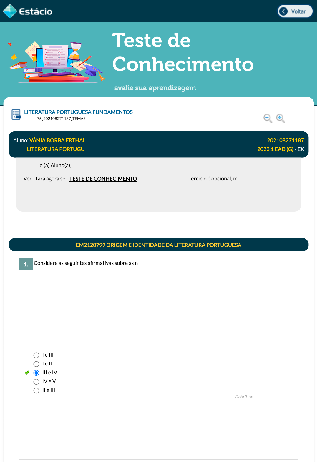 Teste de Conhecimento avalie sua aprendizagem Considere as seguintes a�rmativas sobre as novelas de cavalaria: I. As canções de gesta são novelas de cavalaria referentes ao ciclo arturiano. II. Chrétien de Troyes se destacou como um autor de canções de gesta. III. As obras de Chrétien de Troyes constituem um dos mais signi�cativos textos do ciclo bretão. IV. As lendas sobre Artur, um possível herói bretão, serviram de inspiração para signi�cativos romances de cavalaria. V. A cavalaria é apenas �cção literária: historicamente, ela nunca existiu. Estão corretas apenas as a�rmativas: LITERATURA PORTUGUESA FUNDAMENTOS Lupa DGT0675_202108271187_TEMAS Aluno: VÂNIA BORBA ERTHAL Matr.: 202108271187 Disc.: LITERATURA PORTUGU 2023.1 EAD (G) / EX Prezado (a) Aluno(a), Você fará agora seu TESTE DE CONHECIMENTO! Lembre-se que este exercício é opcional, mas não valerá ponto para sua avaliação. O mesmo será composto de questões de múltipla escolha. Após responde cada questão, você terá acesso ao gabarito comentado e/ou à explicação da mesma. Aproveite para se familiarizar com este modelo de questões que será usado na sua AV e AVS. EM2120799 ORIGEM E IDENTIDADE DA LITERATURA PORTUGUESA 1. I e III I e II III e IV IV e V II e III Data Resp.: 28/03/2023 14:41:24 Explicação: A resposta certa é: III e IV javascript:voltar(); javascript:voltar(); javascript:diminui(); javascript:aumenta(); Considerando A demanda do Santo Graal, analise as características a seguir: I. A conjugação do universo pagão no ciclo arturiano com o mito cristão do Santo Graal. II. A ausência de personagens femininos signi�cativos por se tratar de uma literatura escrita para homens. III. A importância da pureza do cavaleiro no processo de busca do Santo Graal. IV. A ausência de valores morais por se tratar de uma narrativa de origem pagã. V. A presença de um herói cristão dentro dos padrões ideológicos da Igreja. Quais a�rmativas apresentam corretamente características pertinentes à obra A demanda do Santo Graal? Considerando as características da novela Amadis de Gaula, analise as a�rmativas a seguir: I. O Donzel do mar sofre por Oriana grandes coitas de amor. II. Na novela de Amadis, o amor permanece sempre na forma platônica do amor irrealizável. III. O personagem Amadis vai do comedimento de maneiras à brutalidade inaudita. IV. Oriana, embora tímida, nutre por Amadis um amor ardente. V. Amadis, por seu caráter comedido, acaba por não se destacar nas batalhas. Quais a�rmativas apresentam corretamente características ou a�rmações pertinentes à novela Amadis de Gaula? Leia a cantiga a seguir: Senhora que bem pareceis, se de mim vos recordasse Deus que vos fez e mandasse que do mal que me fazeis me �zésseis correcção, quem dera, senhora, então que eu vos visse e agradasse. 2. I e II I, III e IV I, III, IV e V I e III I e IV Data Resp.: 28/03/2023 14:41:59 Explicação: A resposta certa é: I, III e IV 3. I e II I e III I e IV I, III e IV I, II e V Data Resp.: 28/03/2023 14:43:39 Explicação: A resposta certa é: I, III e IV 4. Ó formosura sem falha que nunca um homem viu tanto para meu mal e meu quebranto! Senhora, que Deus vos valha! Por quanto tenho penado seja eu recompensado vendo-vos só um instante. Da vossa grande beleza da qual eu esperei um dia grande bem e alegria, só me vem mal e tristeza. Sendo-me a mágoa sobeja, deixai que ao menos vos veja no ano, o espaço de um dia. (CORREIA, 1978. p. 253) Essa cantiga deve ser corretamente identi�cada como: A estética barroca se caracteriza na literatura, em geral, a partir de sua oposição... Nos versos ''Vem, ó Marília, vem lograr comigo / Destes alegres campos a beleza,'' de um soneto de Bocage, temos uma referência... Cantiga de amor Cantiga de clerici Cantiga de amigo Cantiga de escárnio Cantiga de maldizer Data Resp.: 28/03/2023 14:44:09 Explicação: A resposta certa é: Cantiga de amor EM2120253 BARROCO E ARCADISMO EM PORTUGAL 5. À linguagem ornamentada e com certo preciosismo vocabular. Ao uso de vocabulário rebuscado e re�nado. À linguagem marcada pela opulência e, várias vezes, hermética. À escrita aristocrática e à linguagem empolada. Aos vocábulos populares e ao estilo marcado pela clareza e harmonia. Data Resp.: 28/03/2023 14:45:24 Explicação: A resposta certa é: Aos vocábulos populares e ao estilo marcado pela clareza e harmonia. 6. Ao ambiente bucólico aonde a amada deve ir com seu amado. Às terras e às propriedades adquiridas ou conquistadas pelo amado. Ao ambiente pastoril em que o trabalho produtivo e a riqueza são valorizados. Assinale a alternativa que apresenta um dos mais importantes nomes do Arcadismo em Portugal. Na literatura de Gil Vicente, predominam obras que devem ser corretamente identi�cadas como Leia o soneto a seguir: Alma minha gentil, que te partiste Tão cedo desta vida descontente, Repousa lá no Céu eternamente E viva eu cá na terra sempre triste. Se lá no assento etéreo, onde subiste, Memória desta vida se consente, Não te esqueças daquele amor ardente Que já nos olhos meus tão puro viste. E se vires que pode merecer-te Alguma cousa a dor que me �cou Aos valores da religião cristã e à negação a elementos mitológicos. Ao ideal estético barroco que valoriza a linguagem rebuscada. Data Resp.: 28/03/2023 14:47:11 Explicação: A resposta certa é: Ao ambiente bucólico aonde a amada deve ir com seu amado. 7. Antonio José da Silva (O Judeu) Padre Antônio Vieira Frei das Chagas Sóror Mariana Alcoforado Bocage Data Resp.: 28/03/2023 14:48:01 Explicação: A resposta certa é: Bocage EM2120620 HUMANISMO E CLASSICISMO EM PORTUGAL 8. autos e farsas epopeias romances poemas contos e crônicas Data Resp.: 28/03/2023 14:48:43 Explicação: A resposta certa é: autos e farsas 9. Da mágoa, sem remédio, de perder-te, Roga a Deus, que teus anos encurtou, Que tão cedo de cá me leve a ver-te, Quão cedo de meus olh